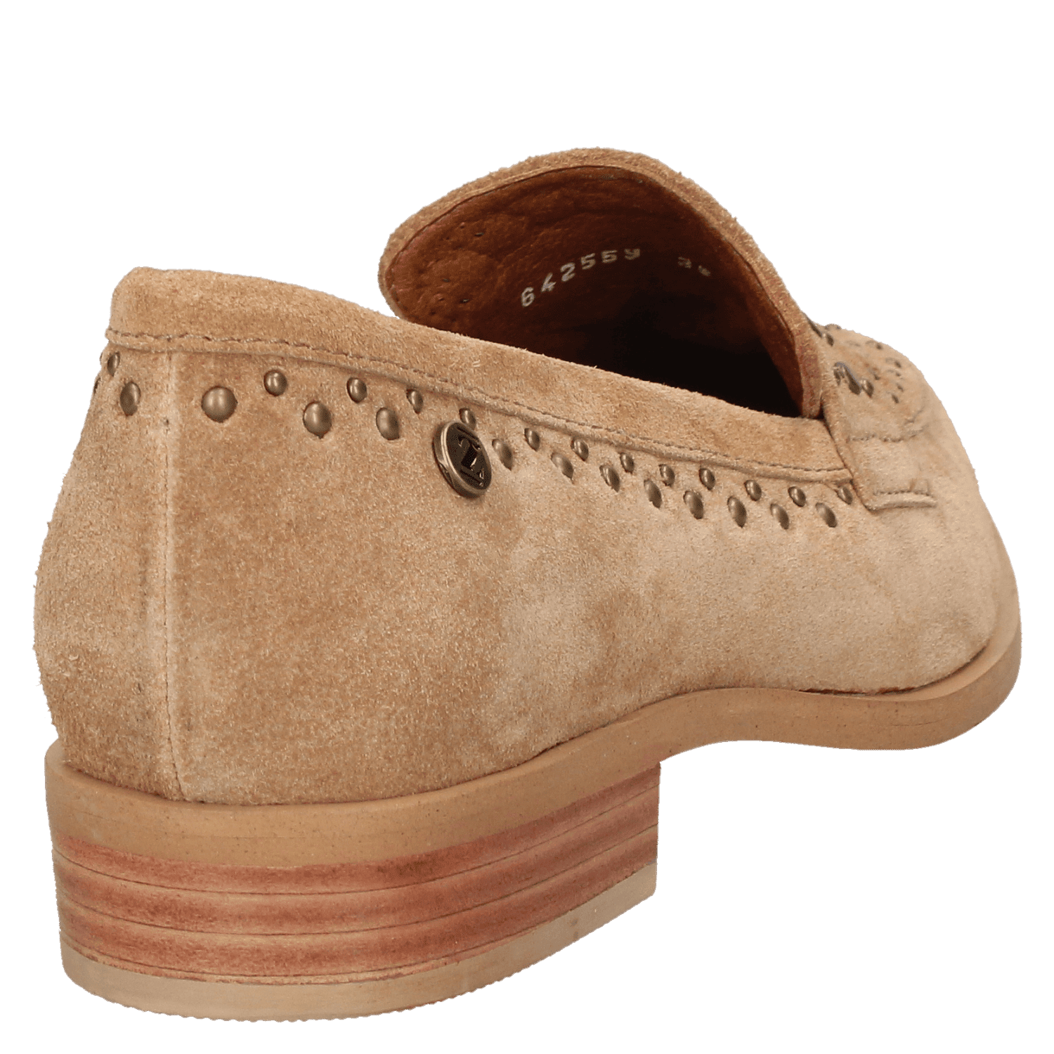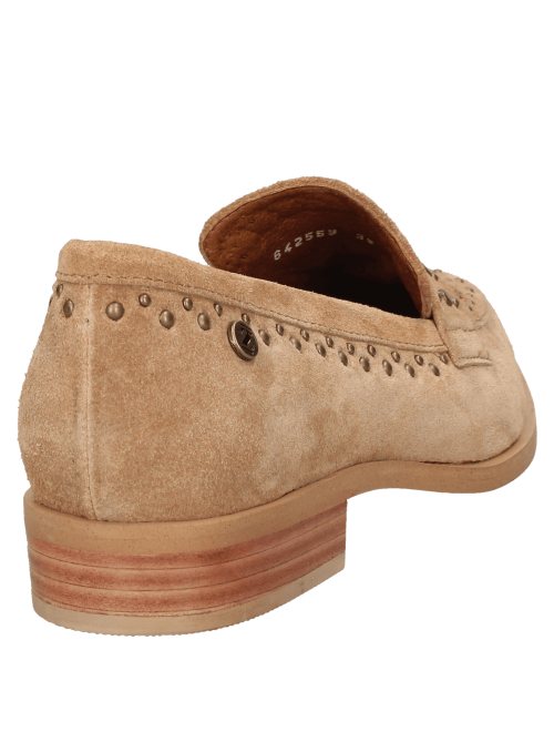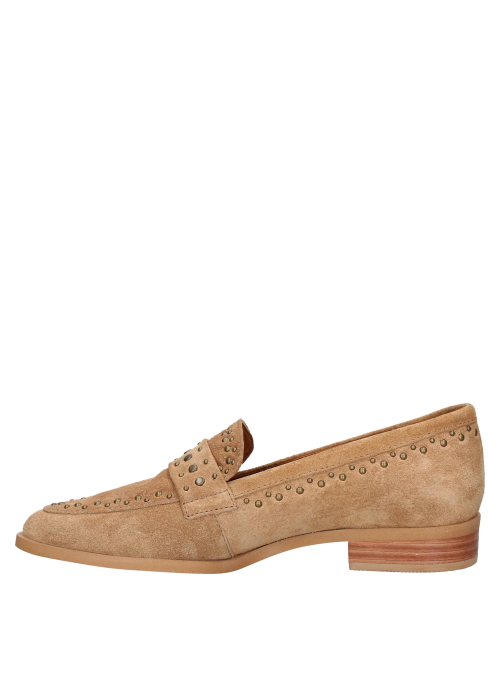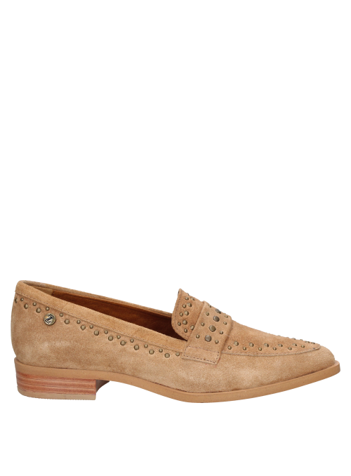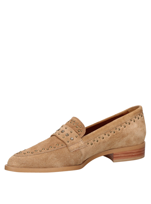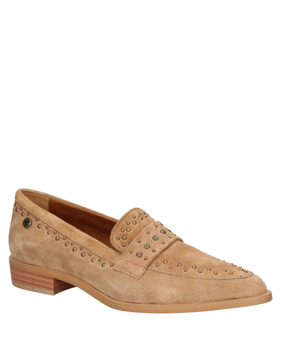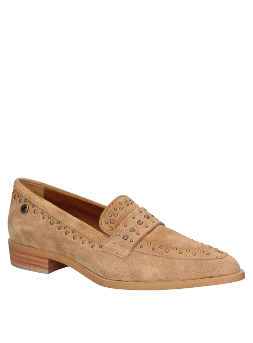 Mocasín camel de gamuza para mujer con tachas metálicas, diseño elegante y moderno.