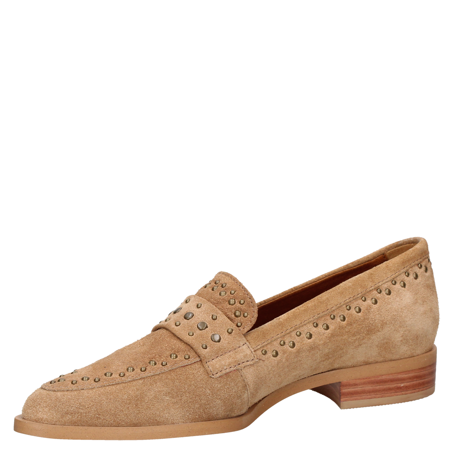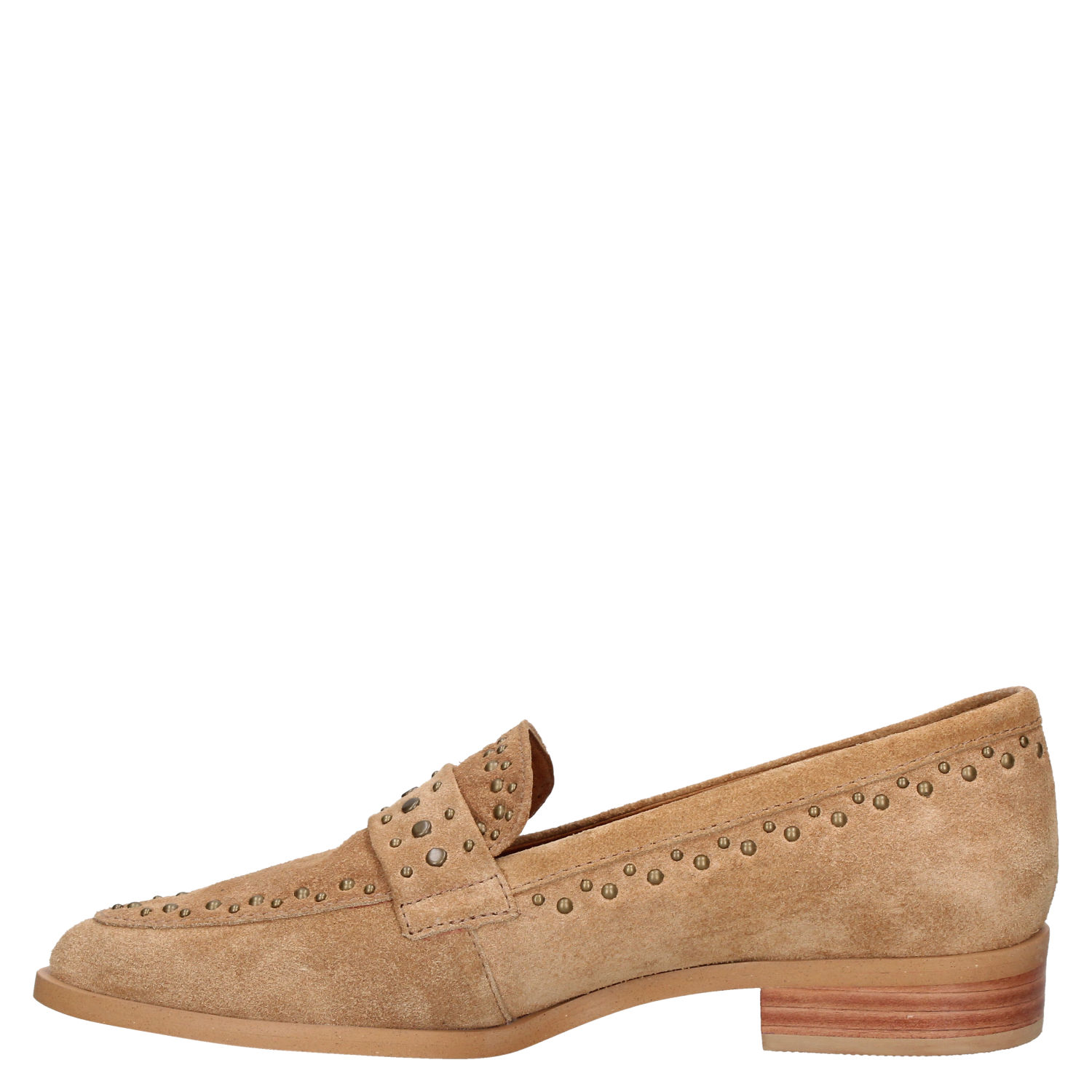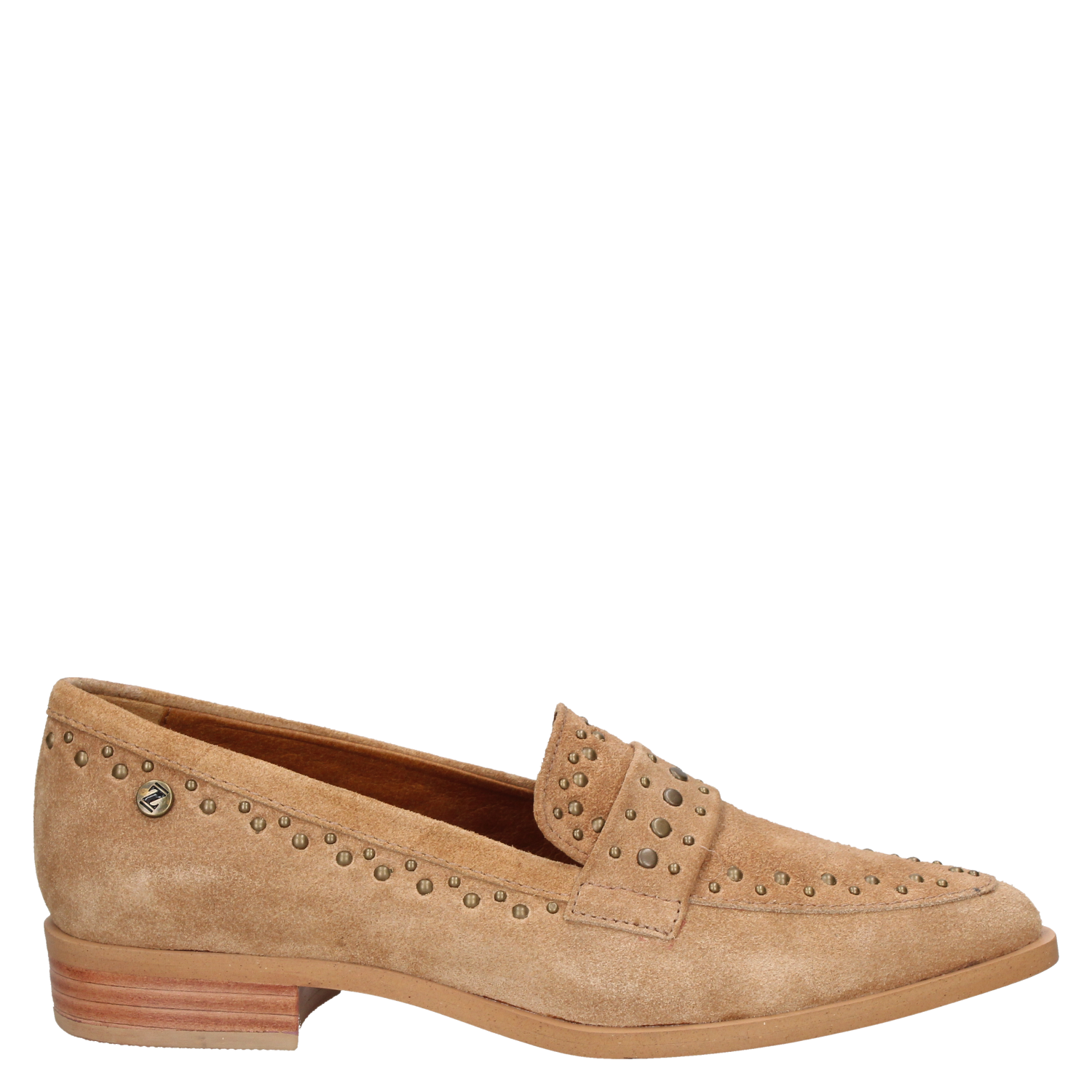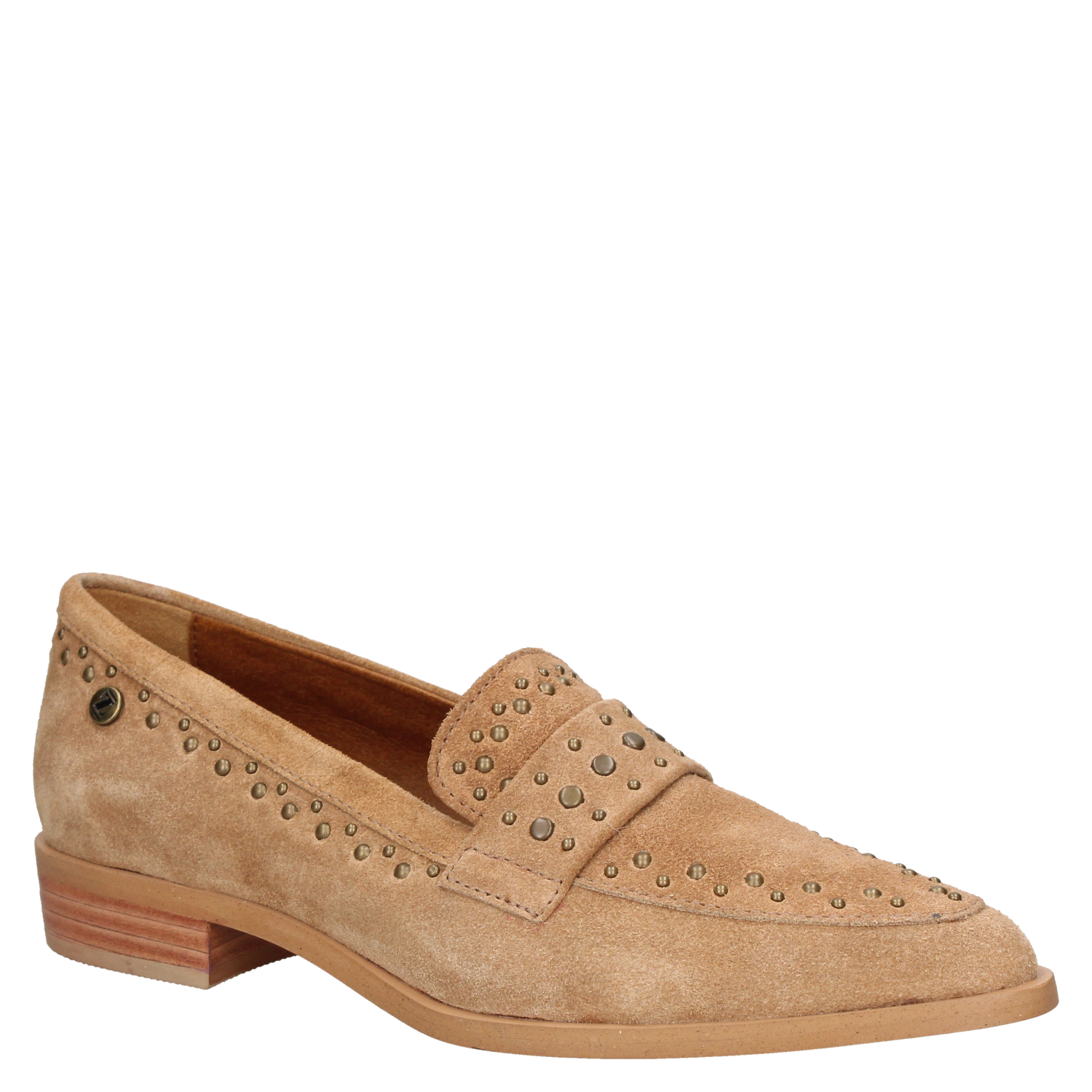 Mocasín camel de gamuza para mujer con tachas metálicas, diseño elegante y moderno.