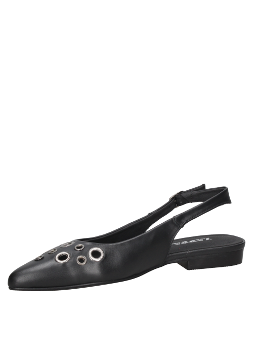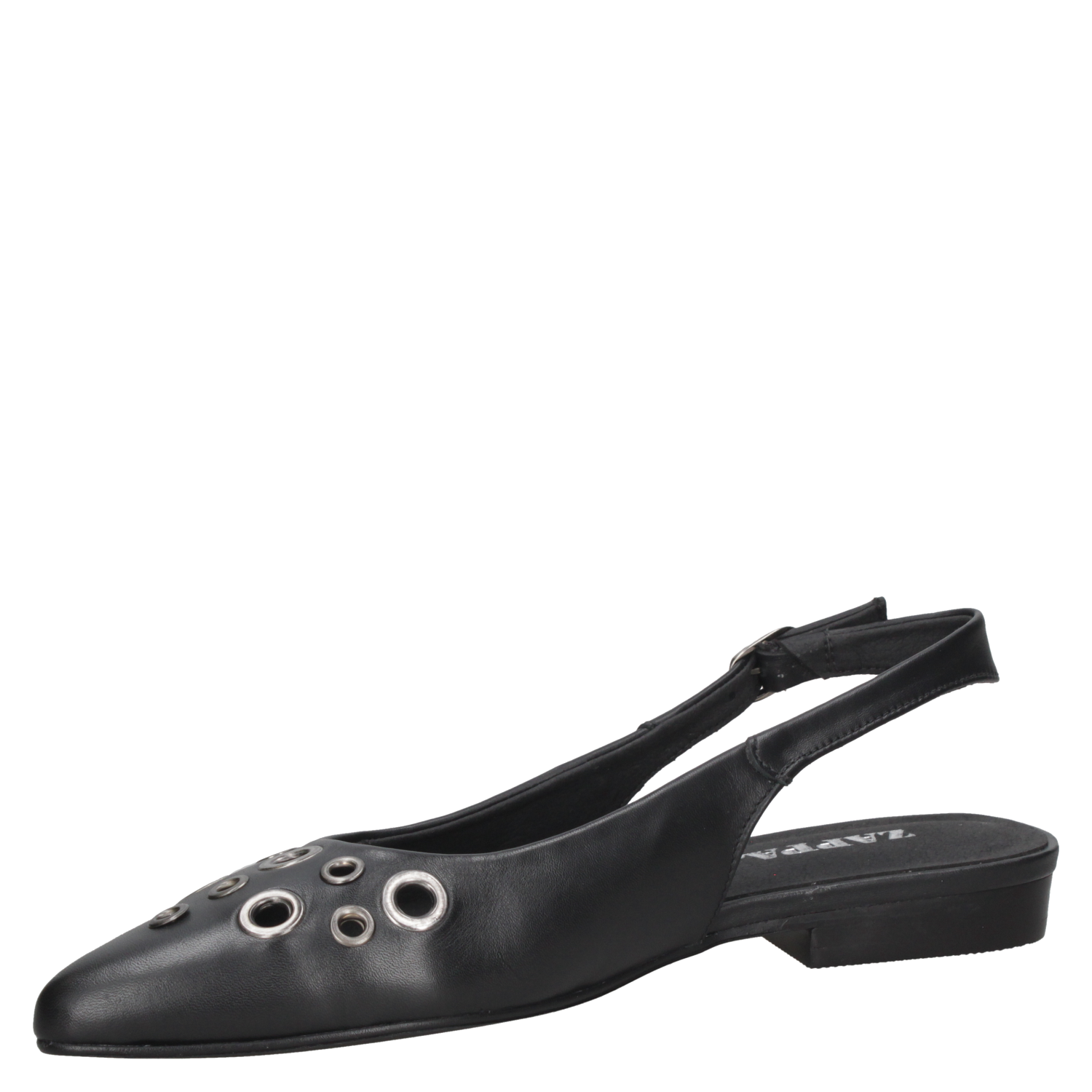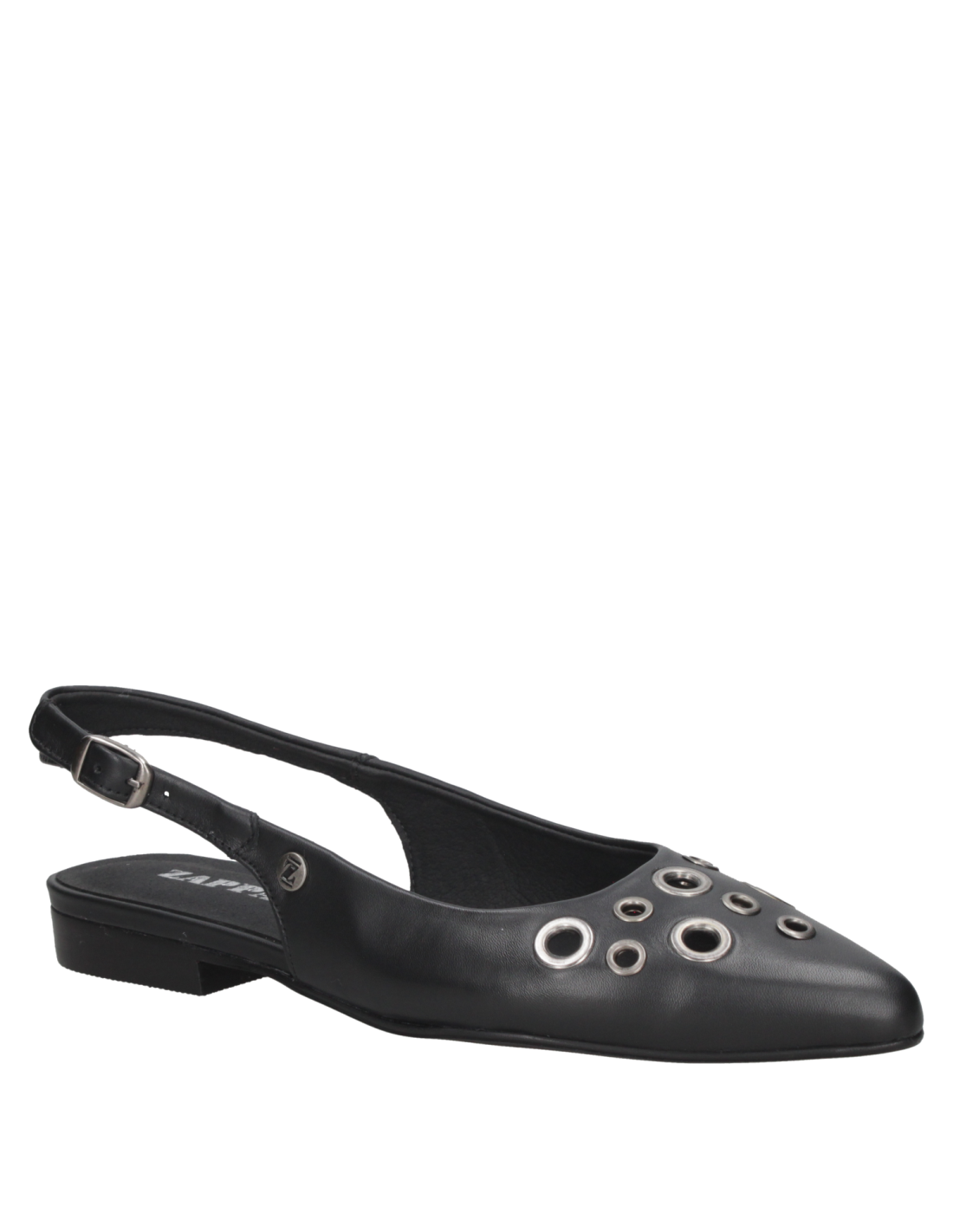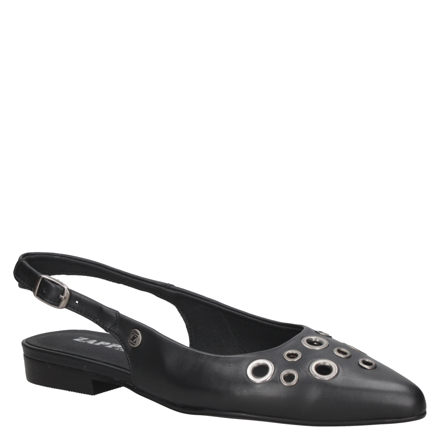 La ballerina de mujer de Zappa es un diseño elegante y contemporáneo, con exterior en cuero negro que ofrece un acabado clásico y sofisticado. Su textura lisa y el brillo sutil resaltan la calidad, mientras los apliques metálicos redondos añaden un toque moderno. La tira trasera ajustable asegura un ajuste cómodo y seguro.