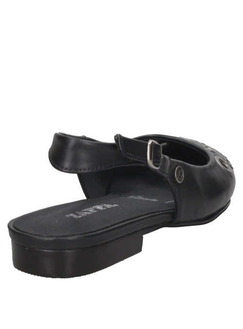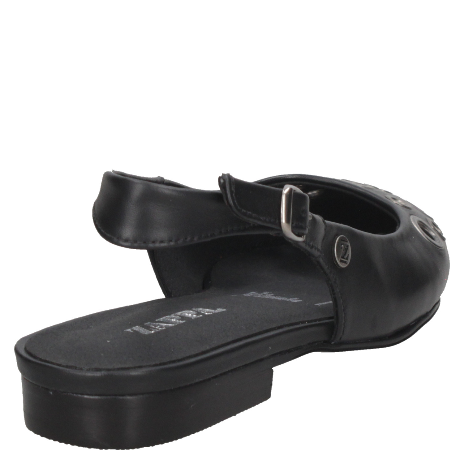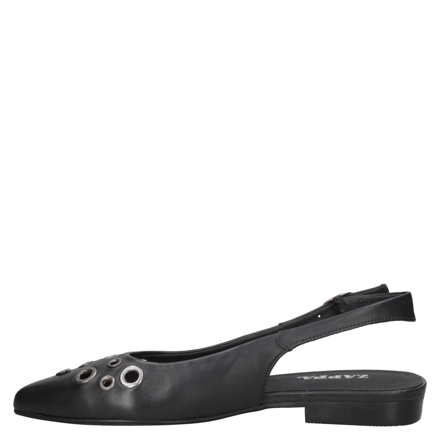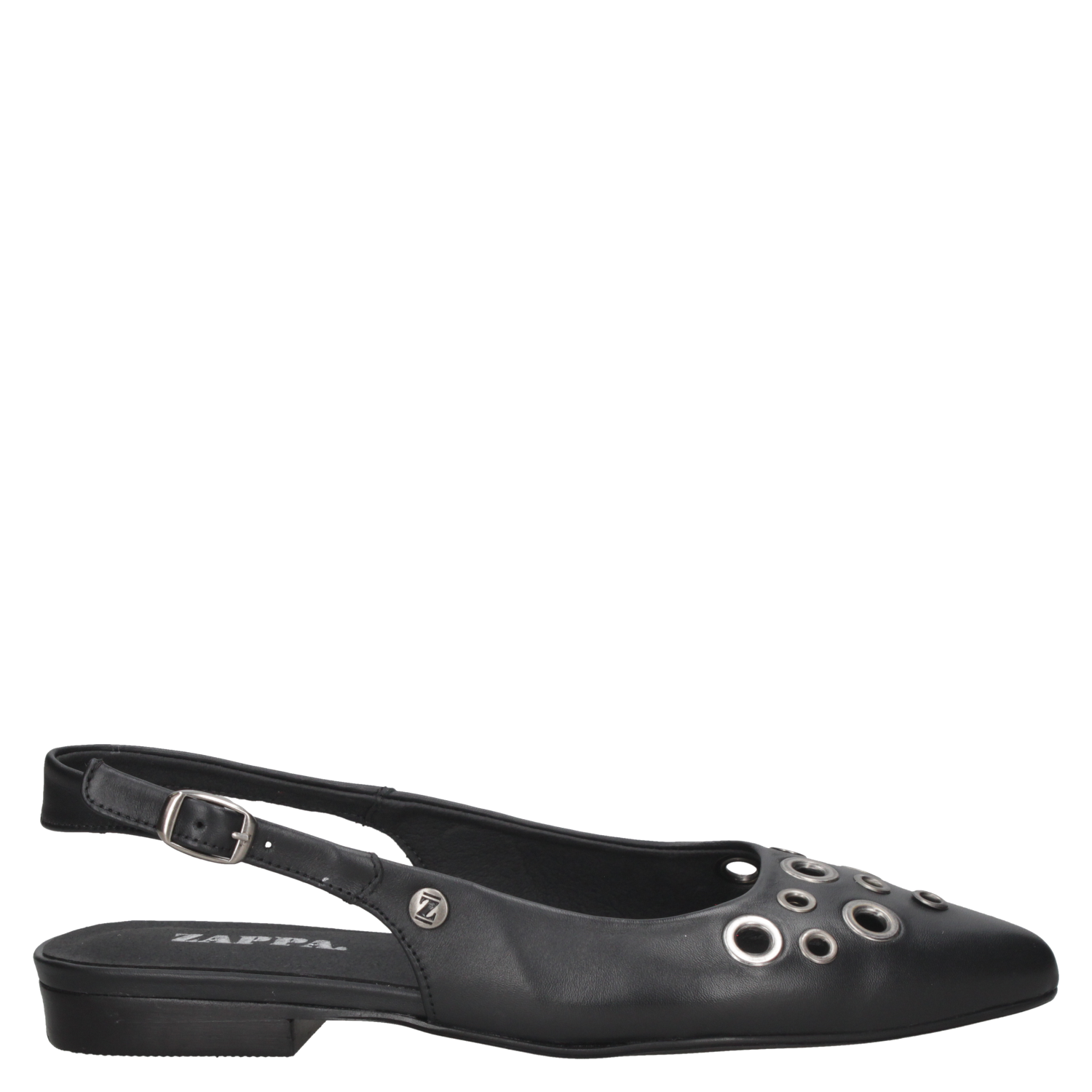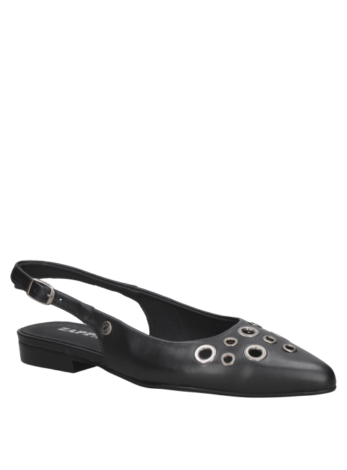 La ballerina de mujer de Zappa es un diseño elegante y contemporáneo, con exterior en cuero negro que ofrece un acabado clásico y sofisticado. Su textura lisa y el brillo sutil resaltan la calidad, mientras los apliques metálicos redondos añaden un toque moderno. La tira trasera ajustable asegura un ajuste cómodo y seguro.
