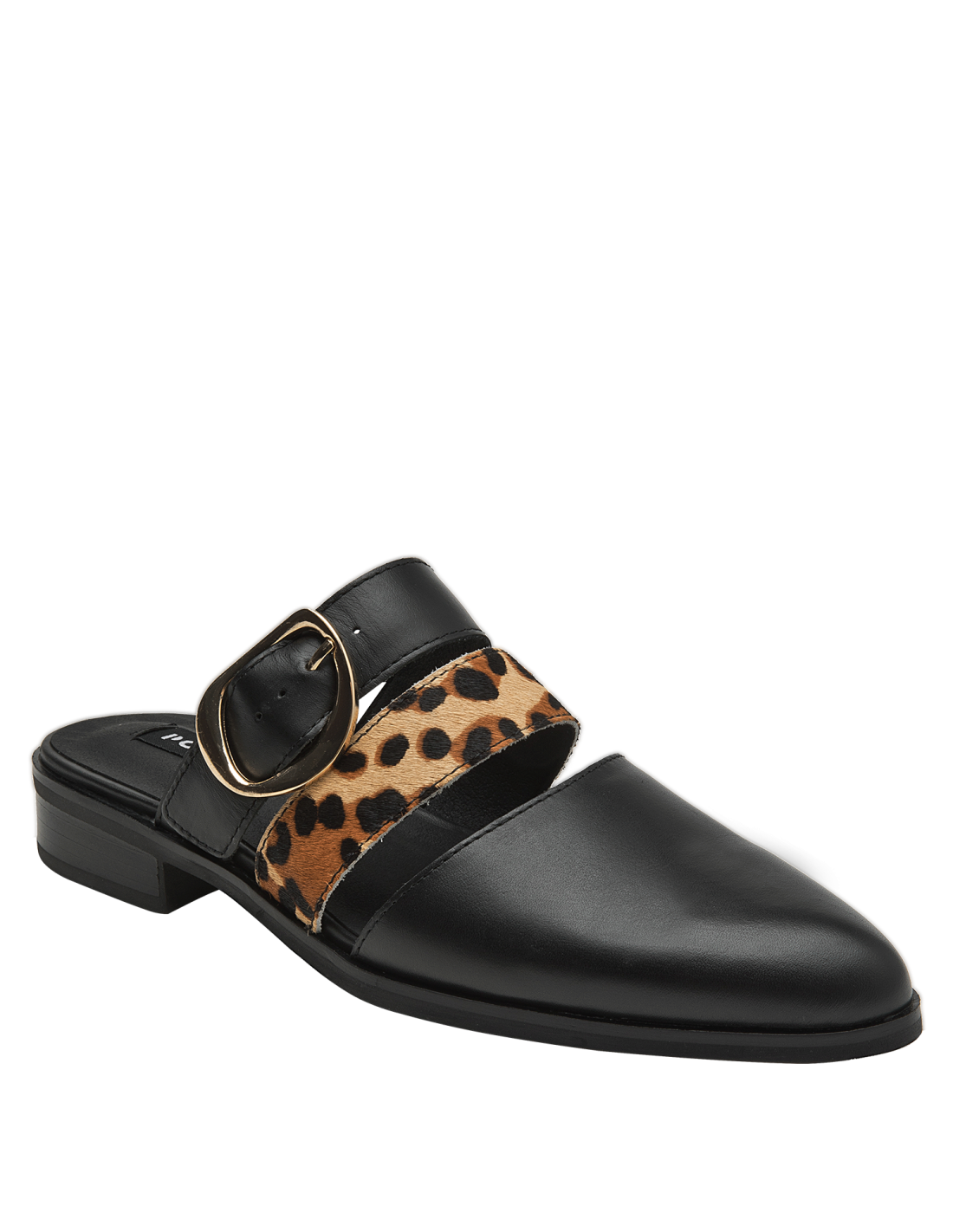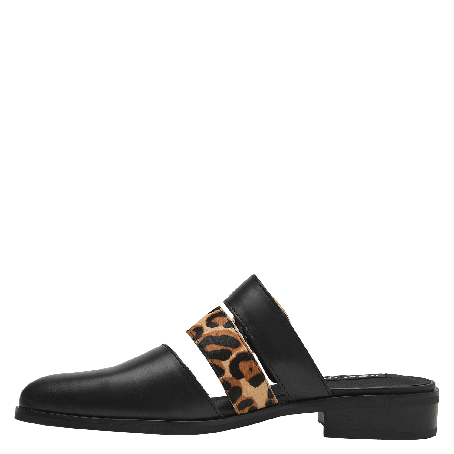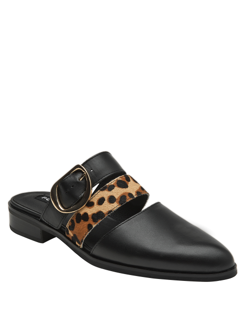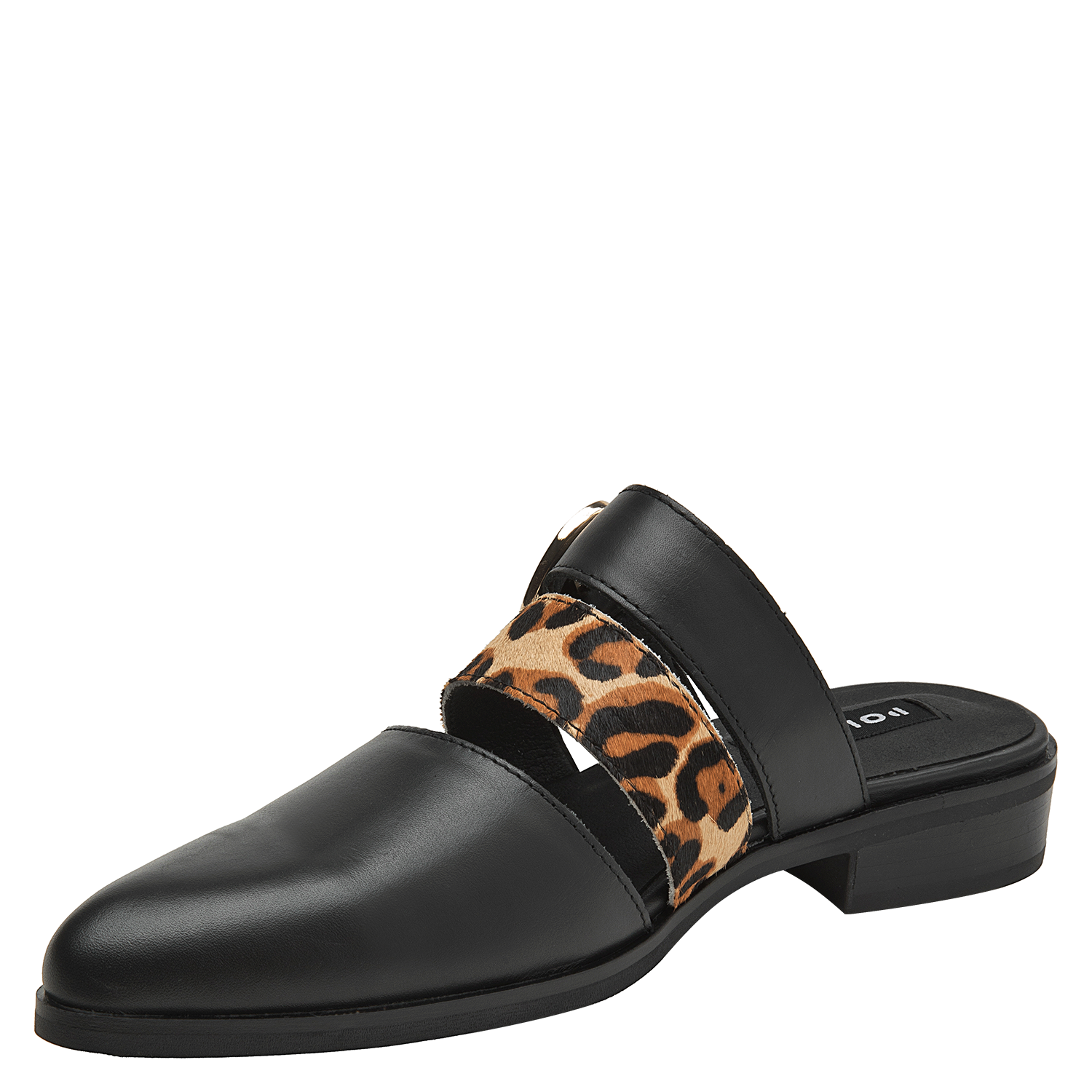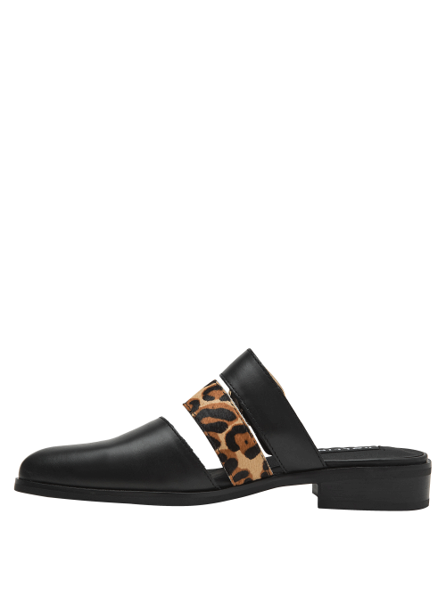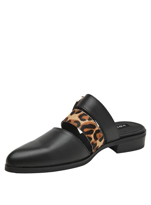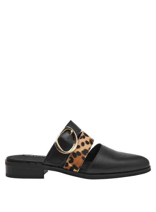 La babucha de mujer de Pollini presenta un diseño moderno y elegante, ideal para quienes buscan sofisticación con un toque audaz. Su exterior de cuero negro destaca por su acabado liso y calidad superior, complementado por una banda de estampado animal print y una hebilla dorada, creando un contraste chic y distintivo.