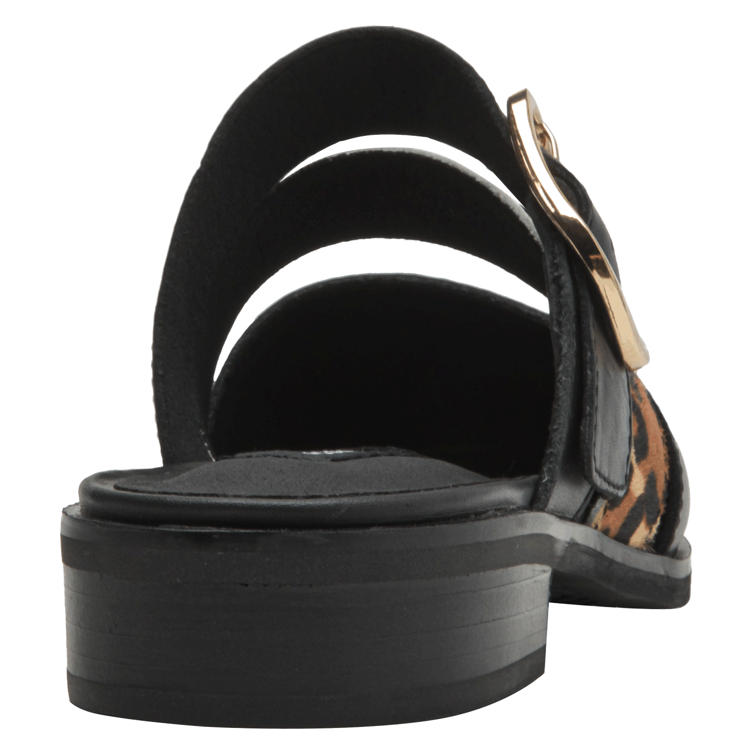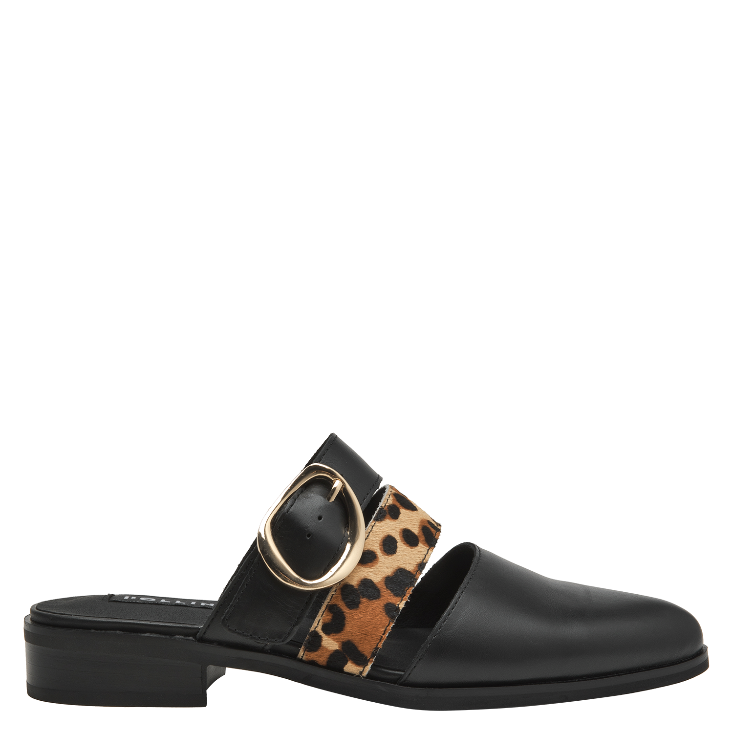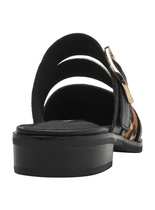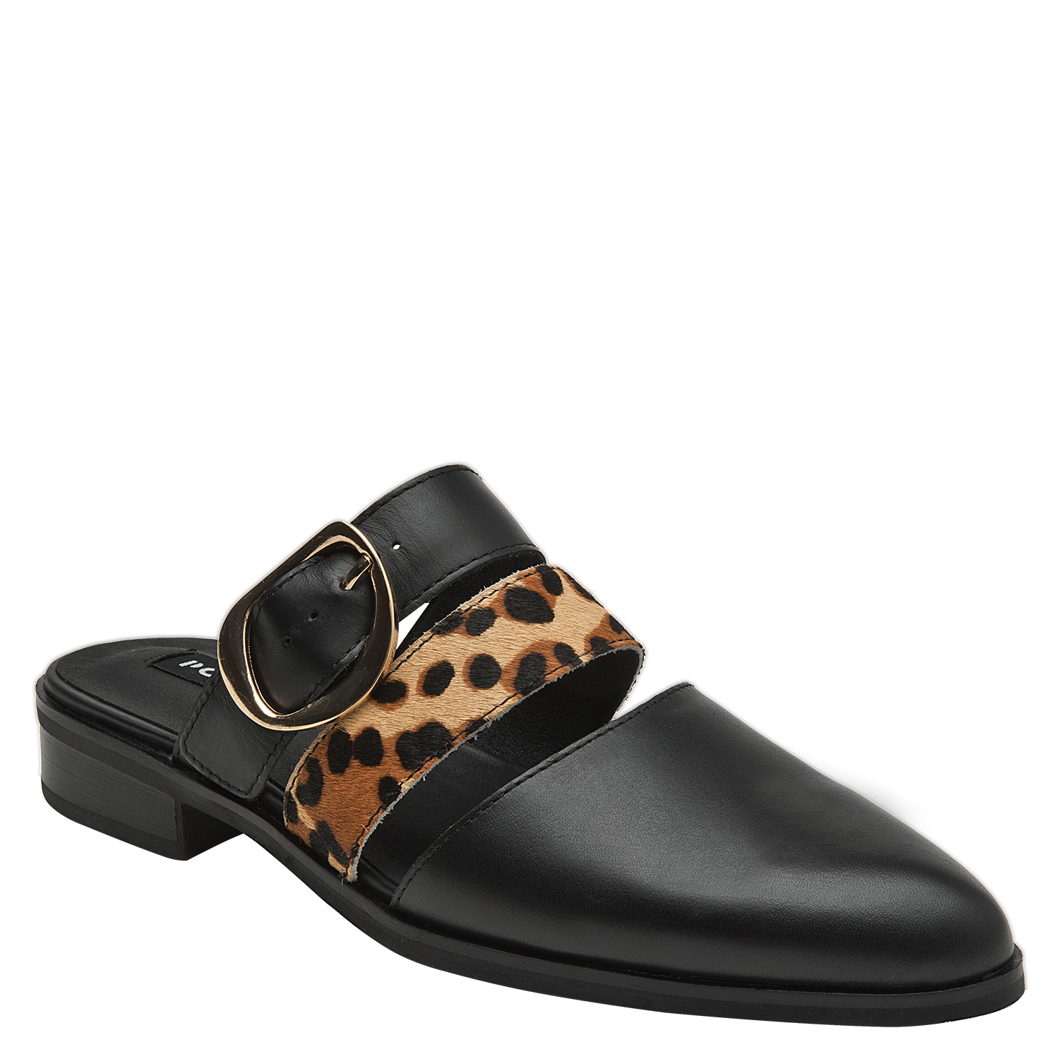 La babucha de mujer de Pollini presenta un diseño moderno y elegante, ideal para quienes buscan sofisticación con un toque audaz. Su exterior de cuero negro destaca por su acabado liso y calidad superior, complementado por una banda de estampado animal print y una hebilla dorada, creando un contraste chic y distintivo.