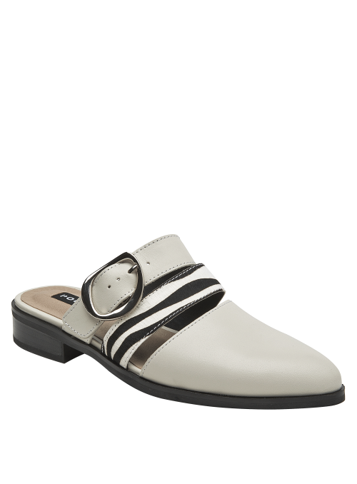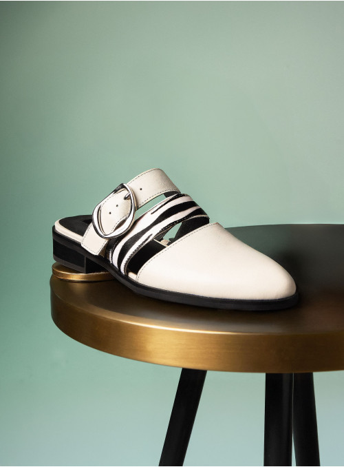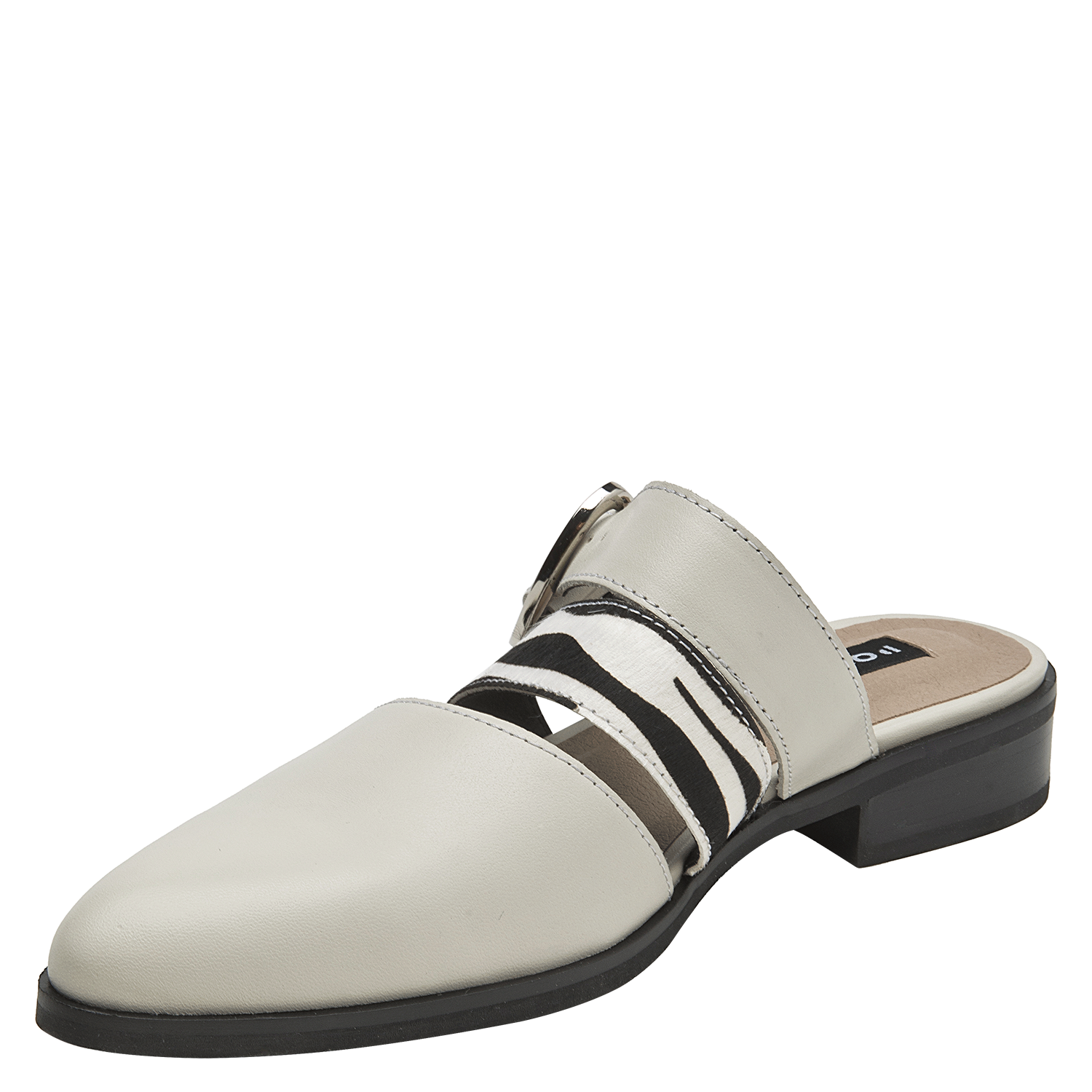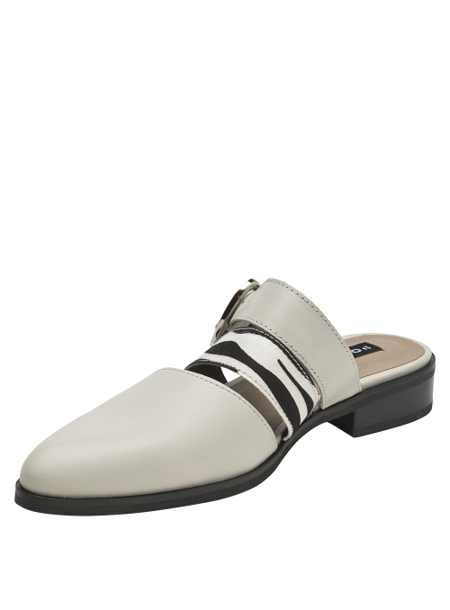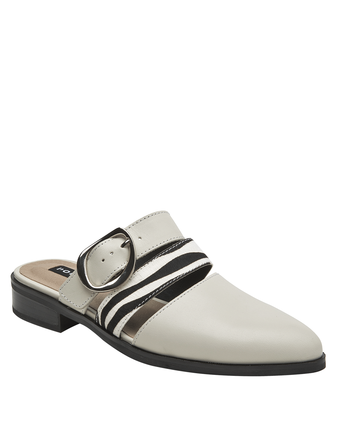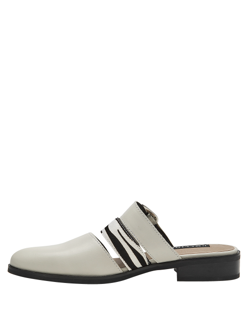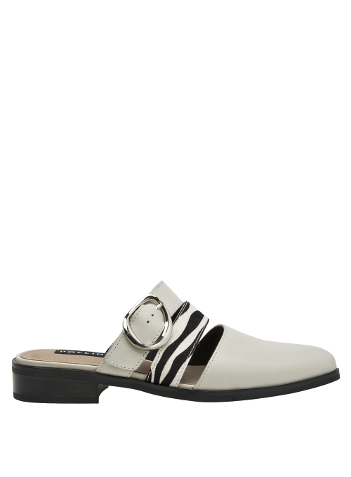 La babucha de mujer de Pollini destaca por su diseño sofisticado y moderno, elaborado en cuero que le otorga una textura lisa y un acabado elegante. Su tono claro, entre blanco y gris suave, se complementa con una hebilla metálica grande y tiras de animal print, creando un contraste audaz y chic. Este calzado casual de taco bajo de 3 cm combina lo clásico con toques llamativos.