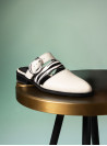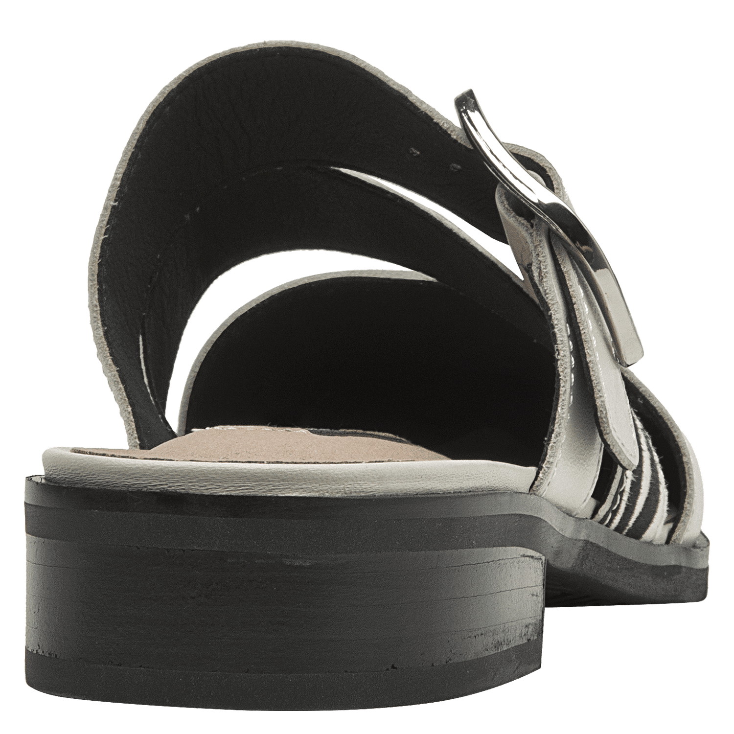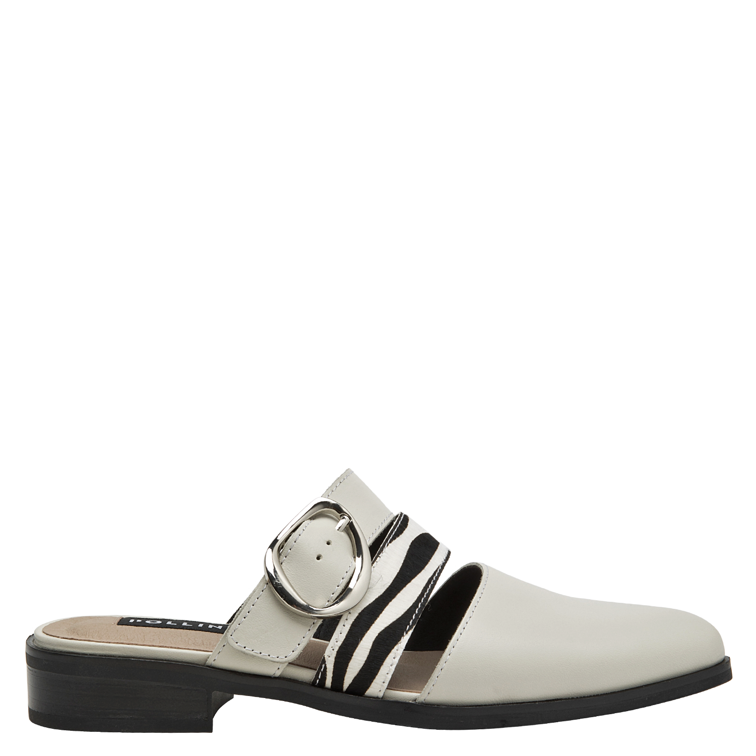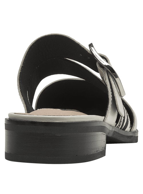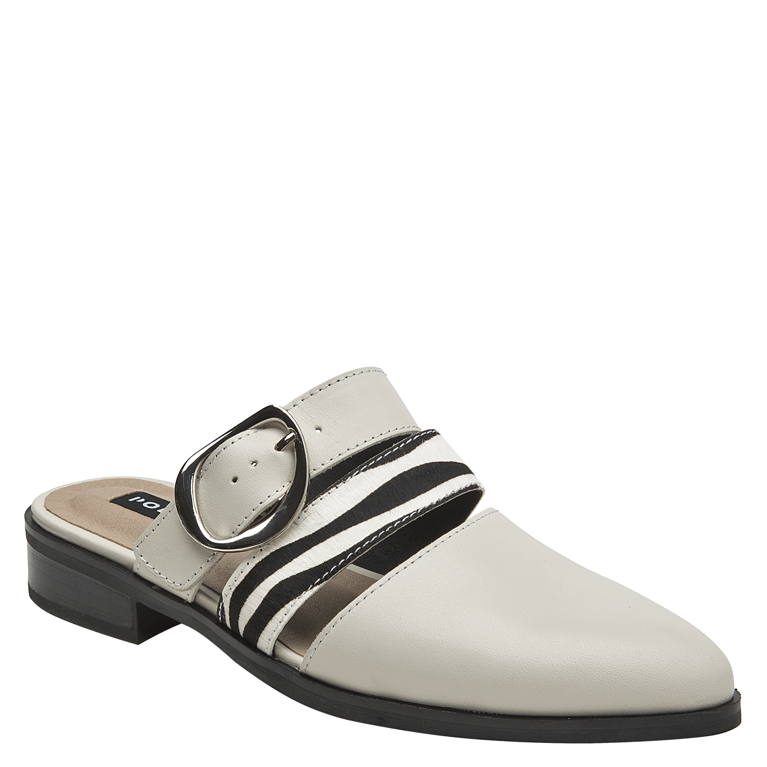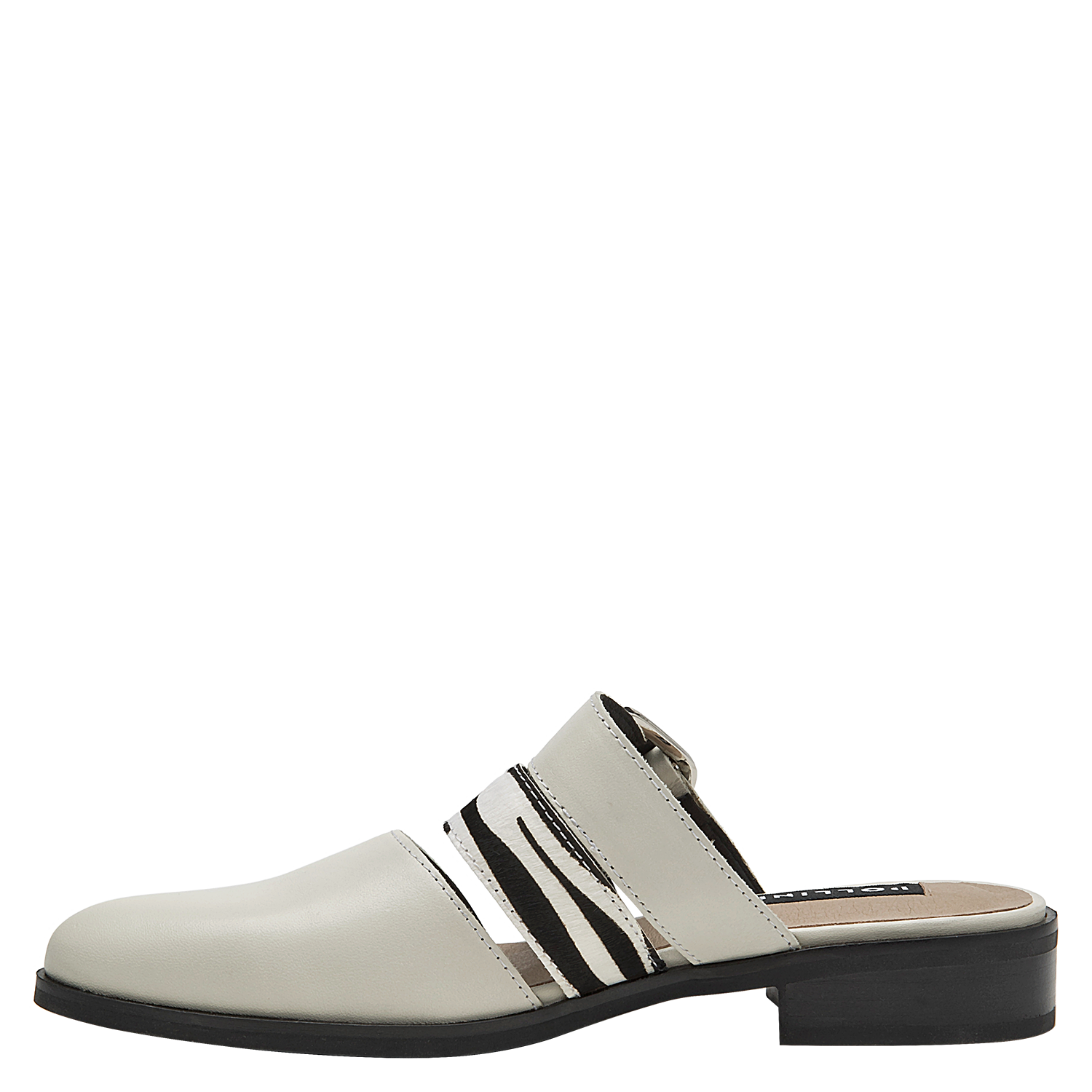 La babucha de mujer de Pollini destaca por su diseño sofisticado y moderno, elaborado en cuero que le otorga una textura lisa y un acabado elegante. Su tono claro, entre blanco y gris suave, se complementa con una hebilla metálica grande y tiras de animal print, creando un contraste audaz y chic. Este calzado casual de taco bajo de 3 cm combina lo clásico con toques llamativos.