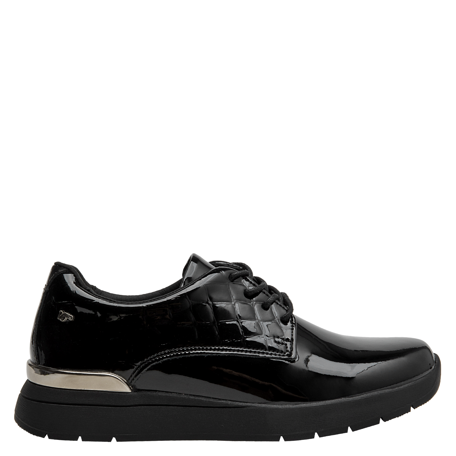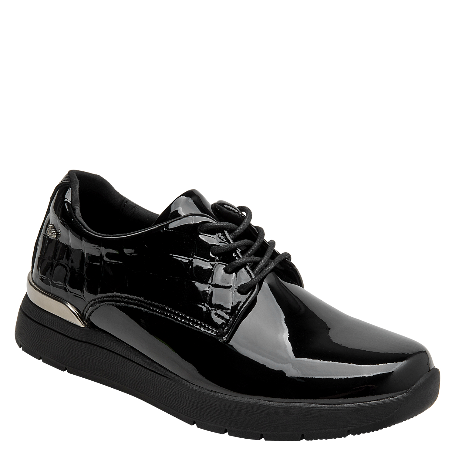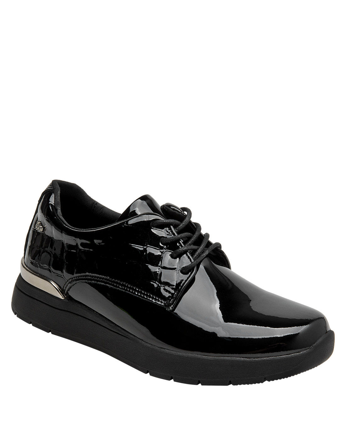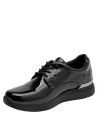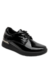 Zapato plano de cuero charol para mujer en color negro, con punta redonda y taco plano de 4 cm que aporta una elevación sutil sin perder comodidad. El exterior en cuero entrega un look pulido y resistente, mientras su forro de microfibra favorece un calce suave. Diseño limpio y versátil que se adapta tanto a la rutina diaria como a ocasiones semi-formales.