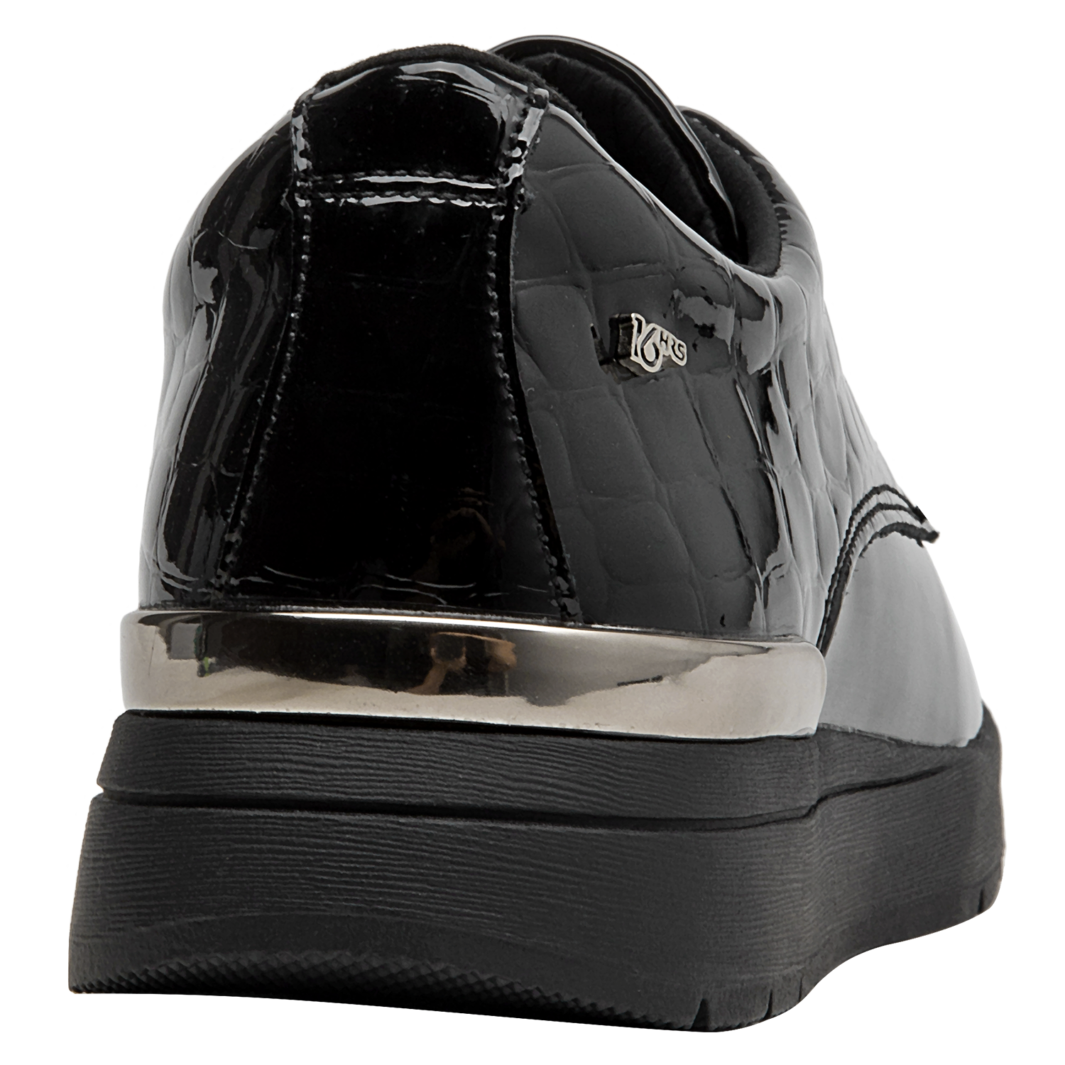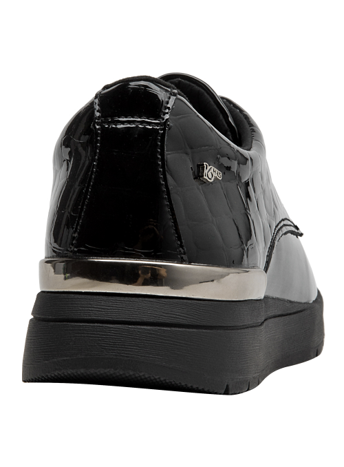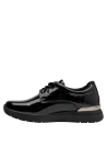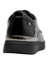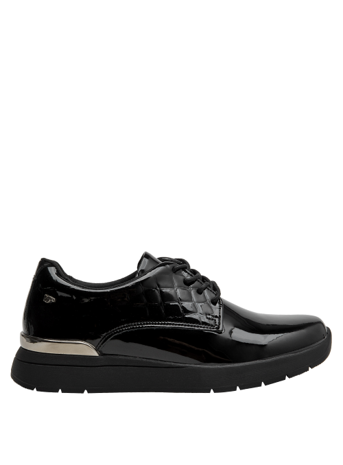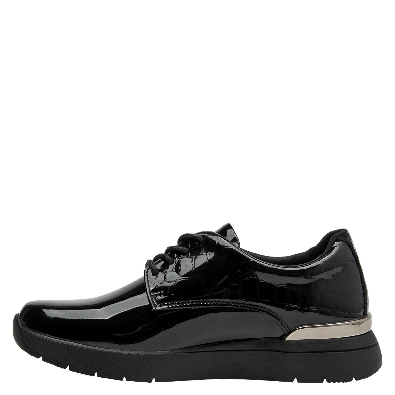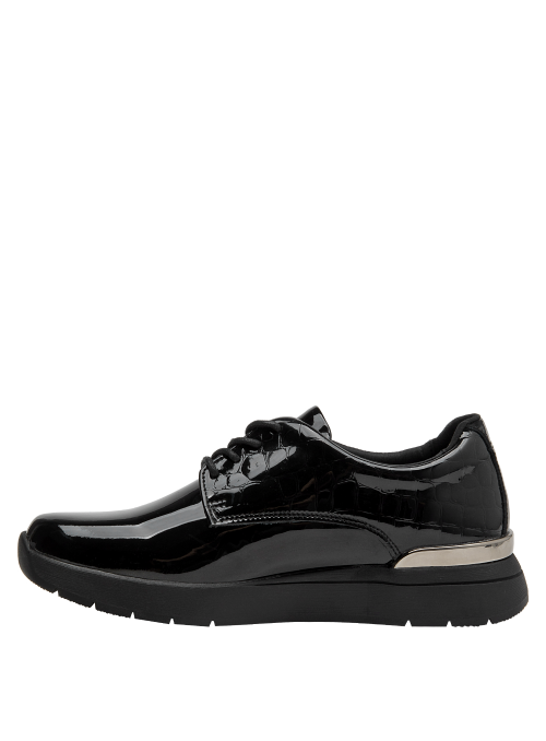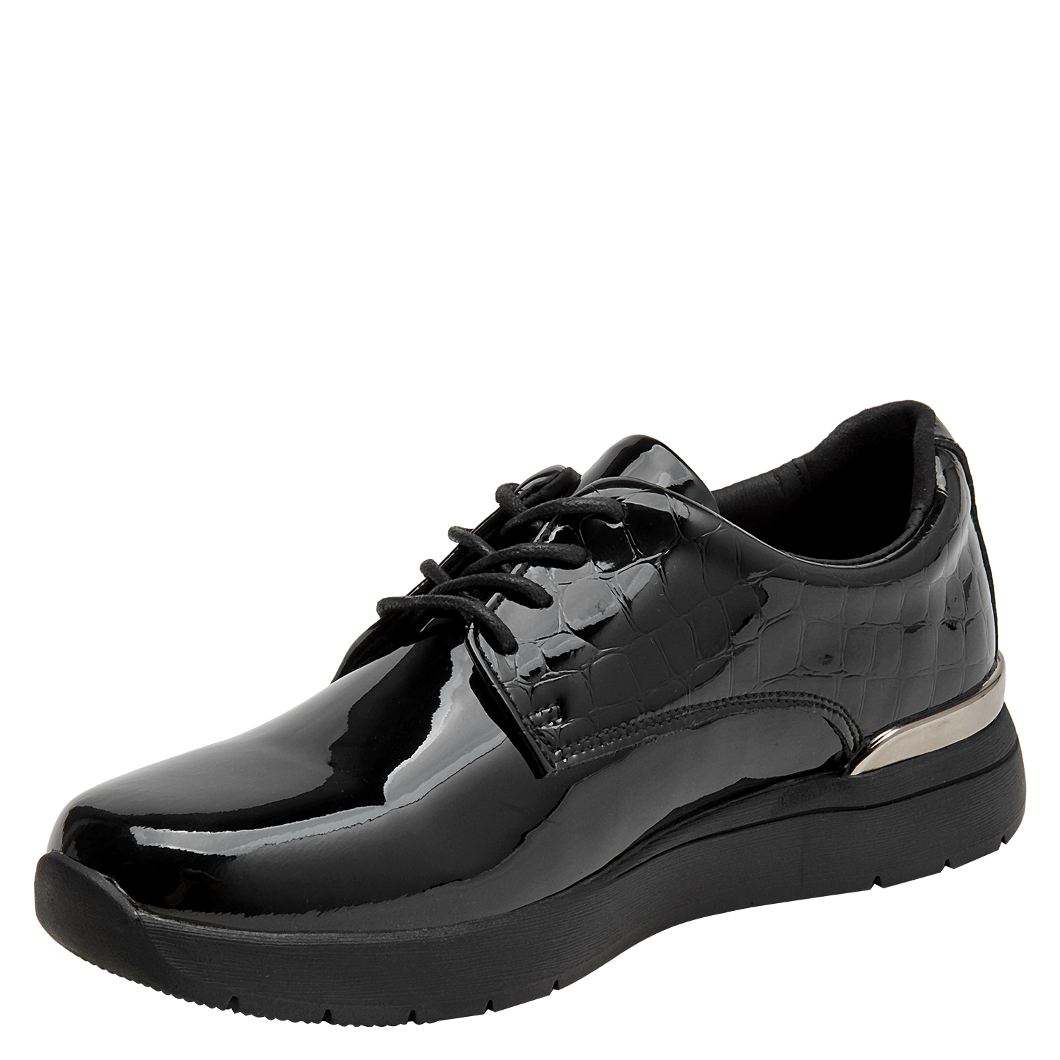 Zapato plano de cuero charol para mujer en color negro, con punta redonda y taco plano de 4 cm que aporta una elevación sutil sin perder comodidad. El exterior en cuero entrega un look pulido y resistente, mientras su forro de microfibra favorece un calce suave. Diseño limpio y versátil que se adapta tanto a la rutina diaria como a ocasiones semi-formales.