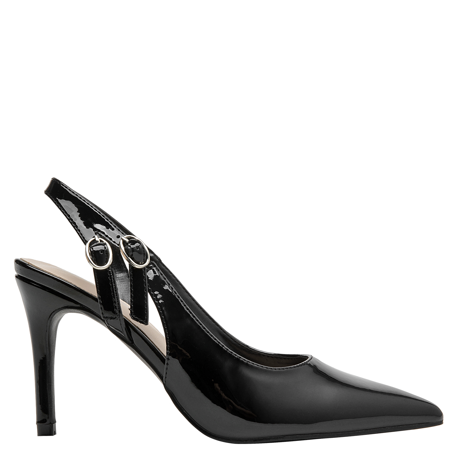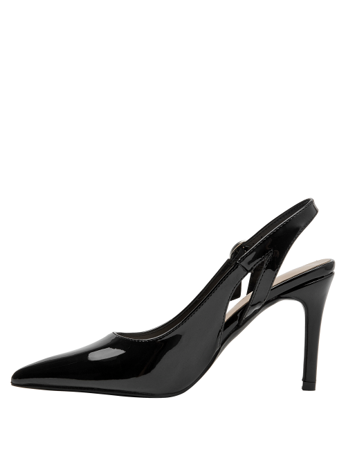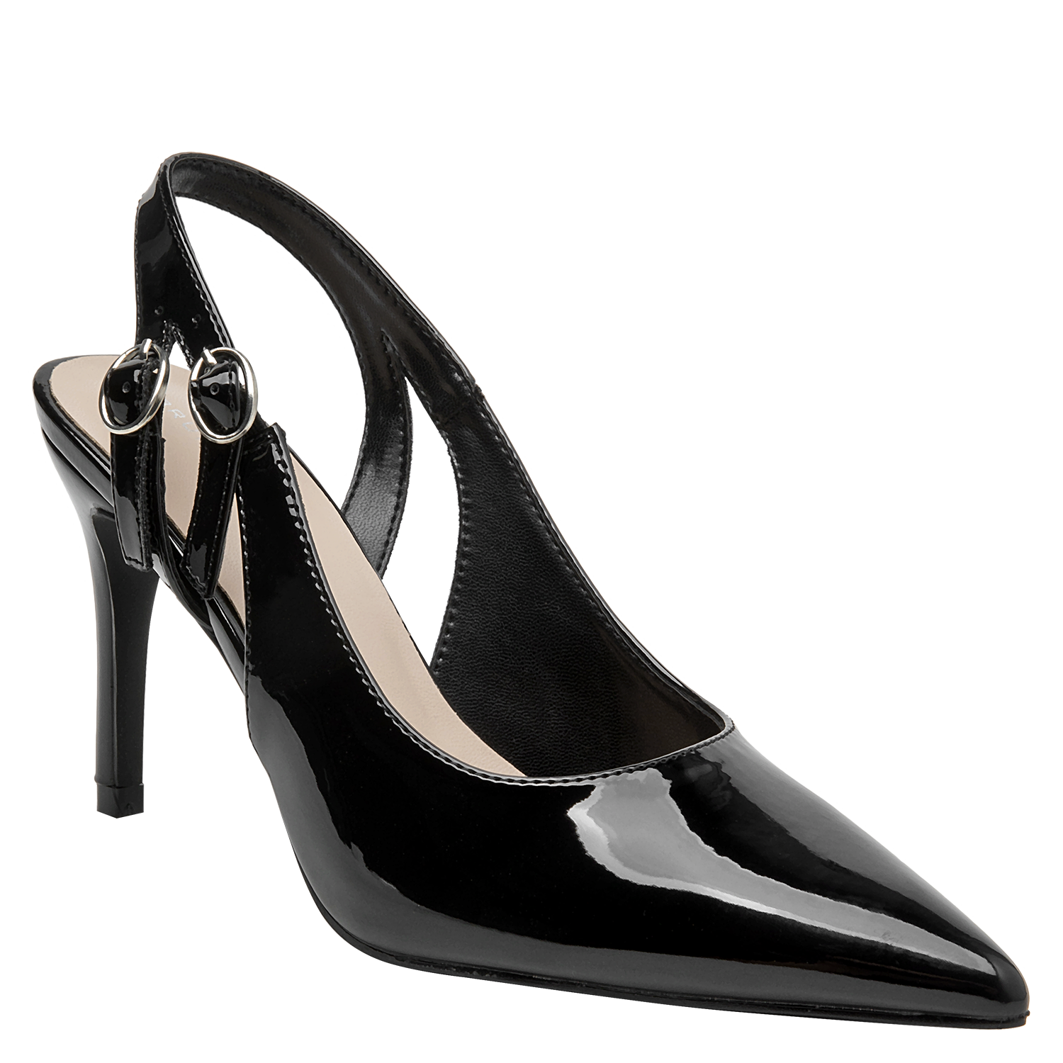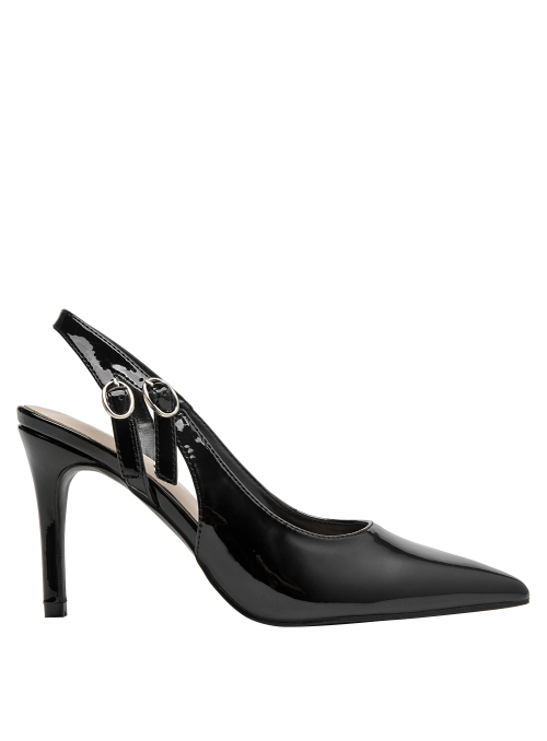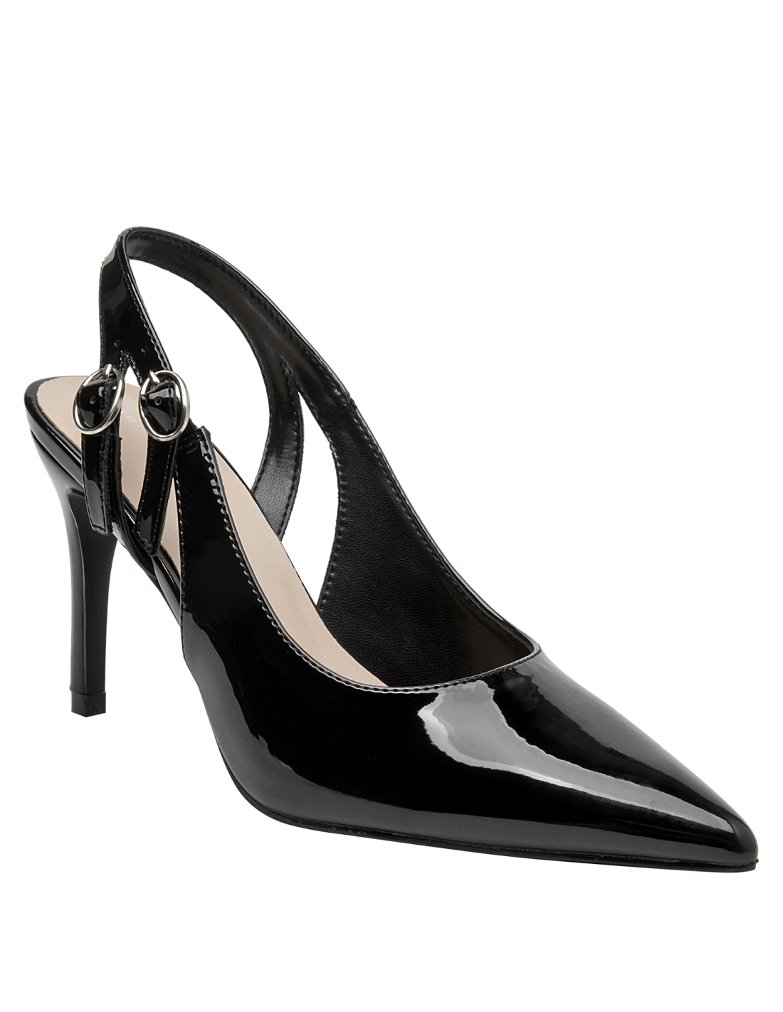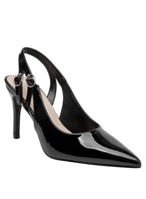 Zapato stiletto para mujer con taco medio tipo aguja en color negro charol. Fabricado en material sintético con forro PU, presenta punta puntiaguda que afina la silueta del pie y un taco de 5 cm que aporta altura sutil y porte elegante. Su diseño limpio y sofisticado lo convierte en un básico versátil para tenidas formales o semi formales.