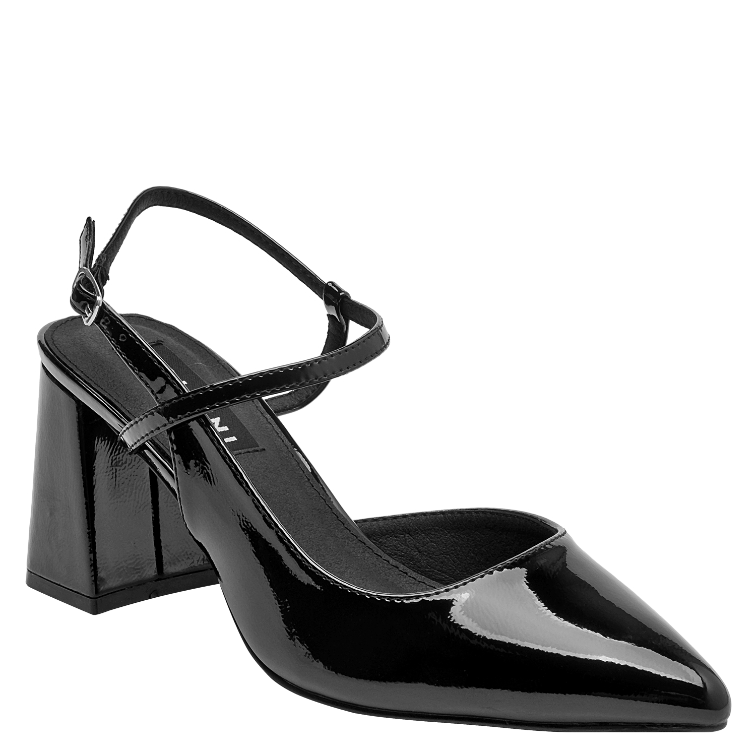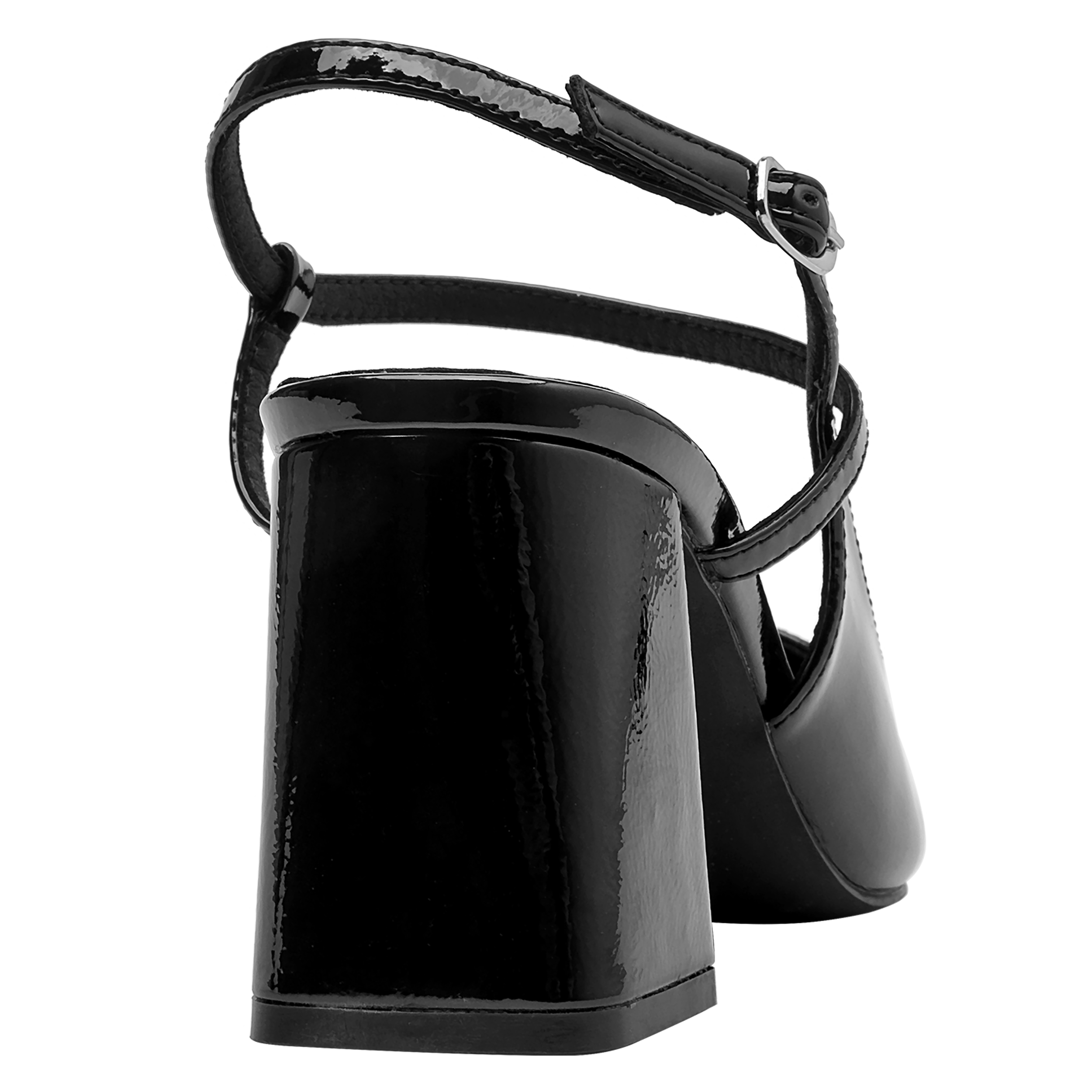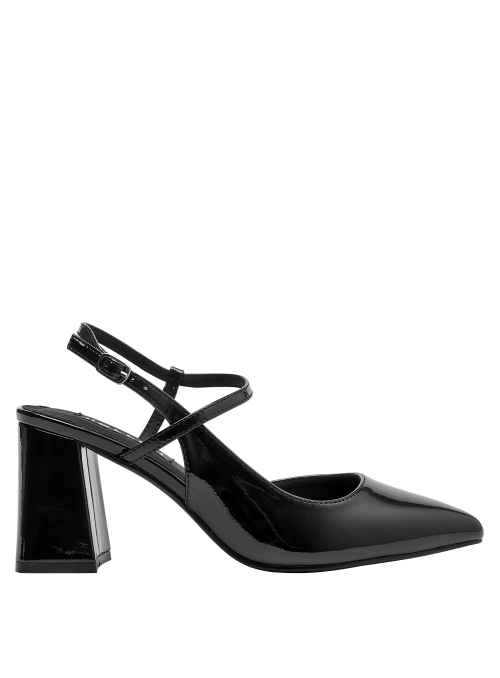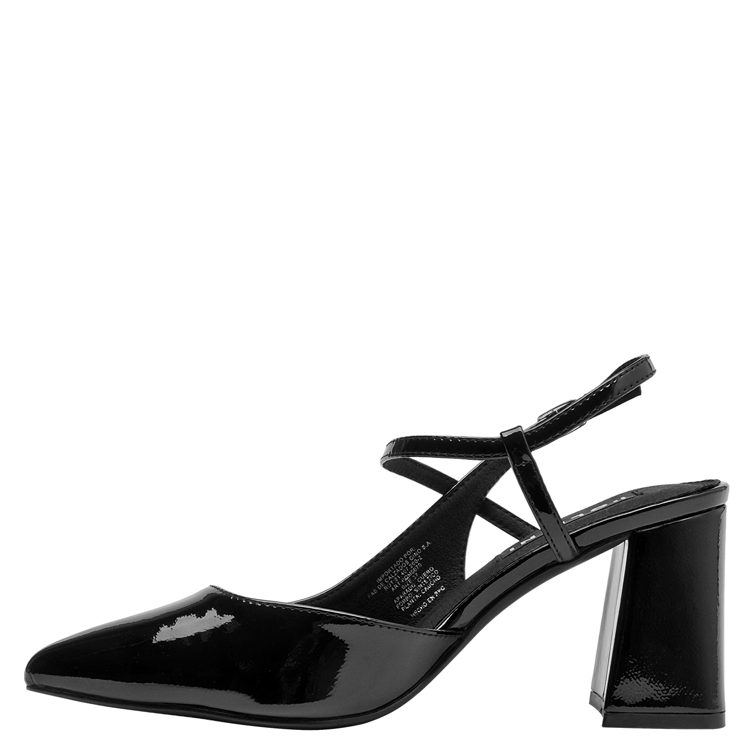 Zapato de vestir para mujer en color negro charol, con diseño de punta puntiaguda y taco bloque de 7,5 cm. Confeccionado en cuero y forrado en microfibra, presenta una silueta estilizada y un acabado liso que aportan un look pulido y atemporal. Una opción versátil para elevar conjuntos formales o smart casual sin excesos.