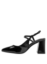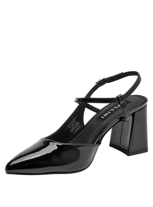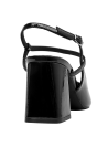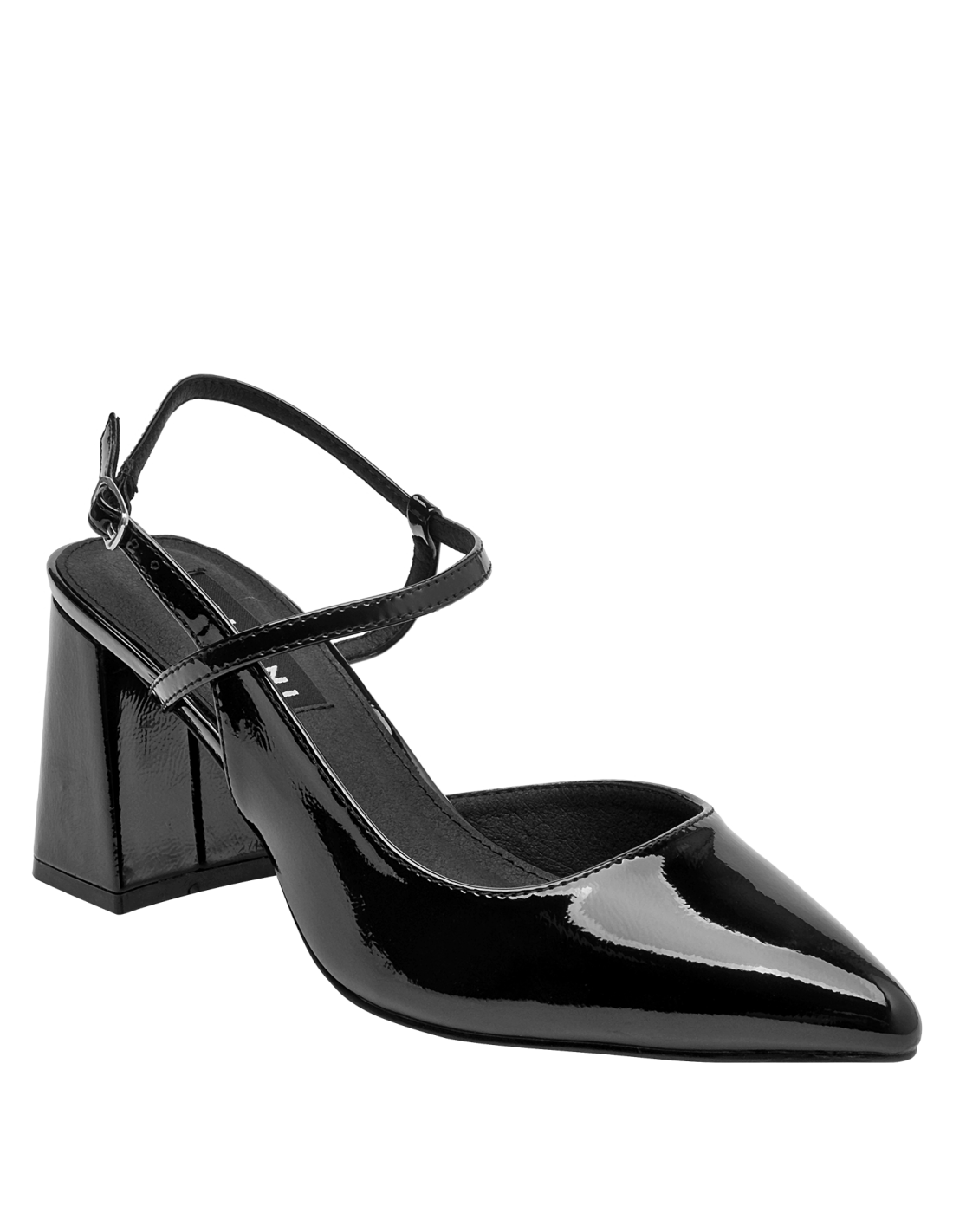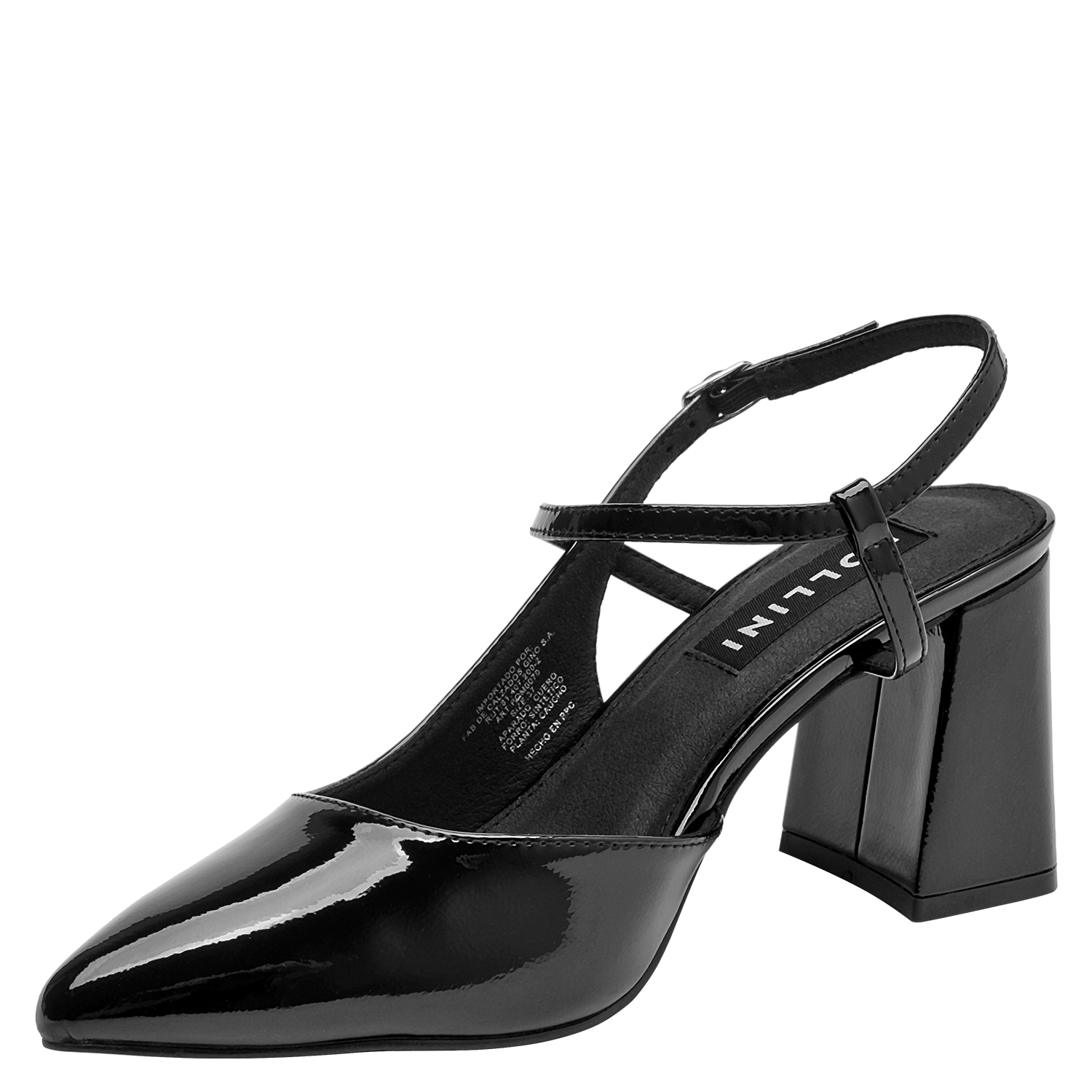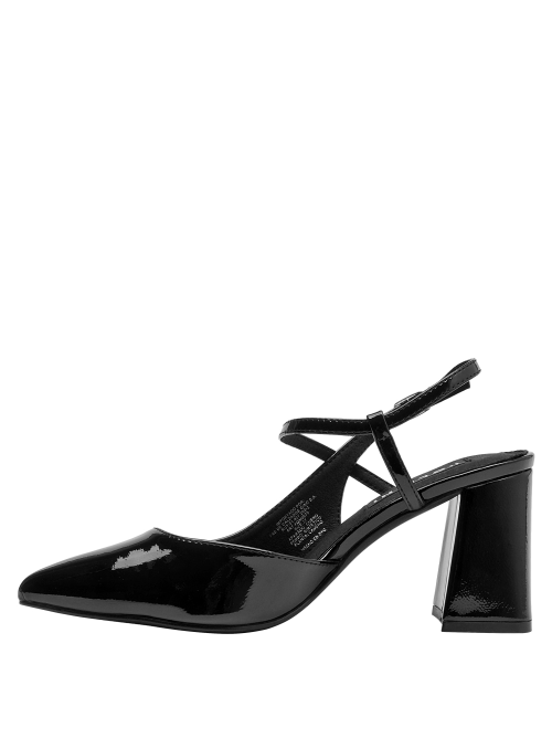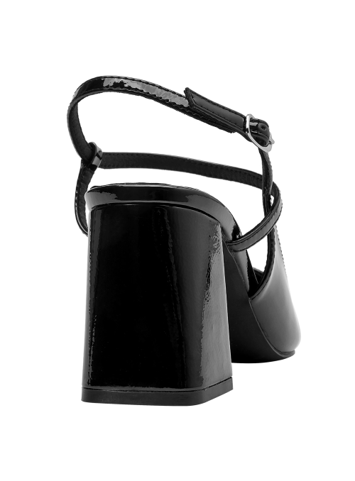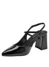Zapato de vestir para mujer en color negro charol, con diseño de punta puntiaguda y taco bloque de 7,5 cm. Confeccionado en cuero y forrado en microfibra, presenta una silueta estilizada y un acabado liso que aportan un look pulido y atemporal. Una opción versátil para elevar conjuntos formales o smart casual sin excesos.