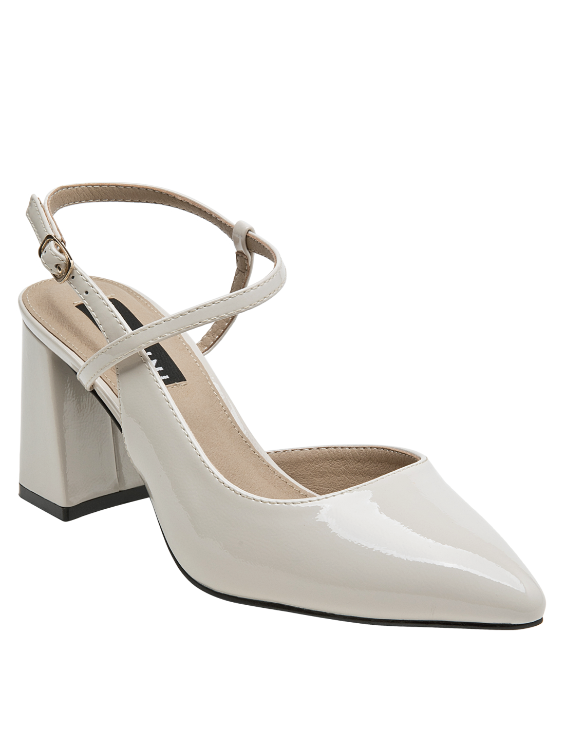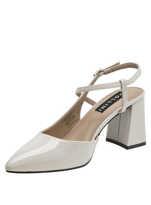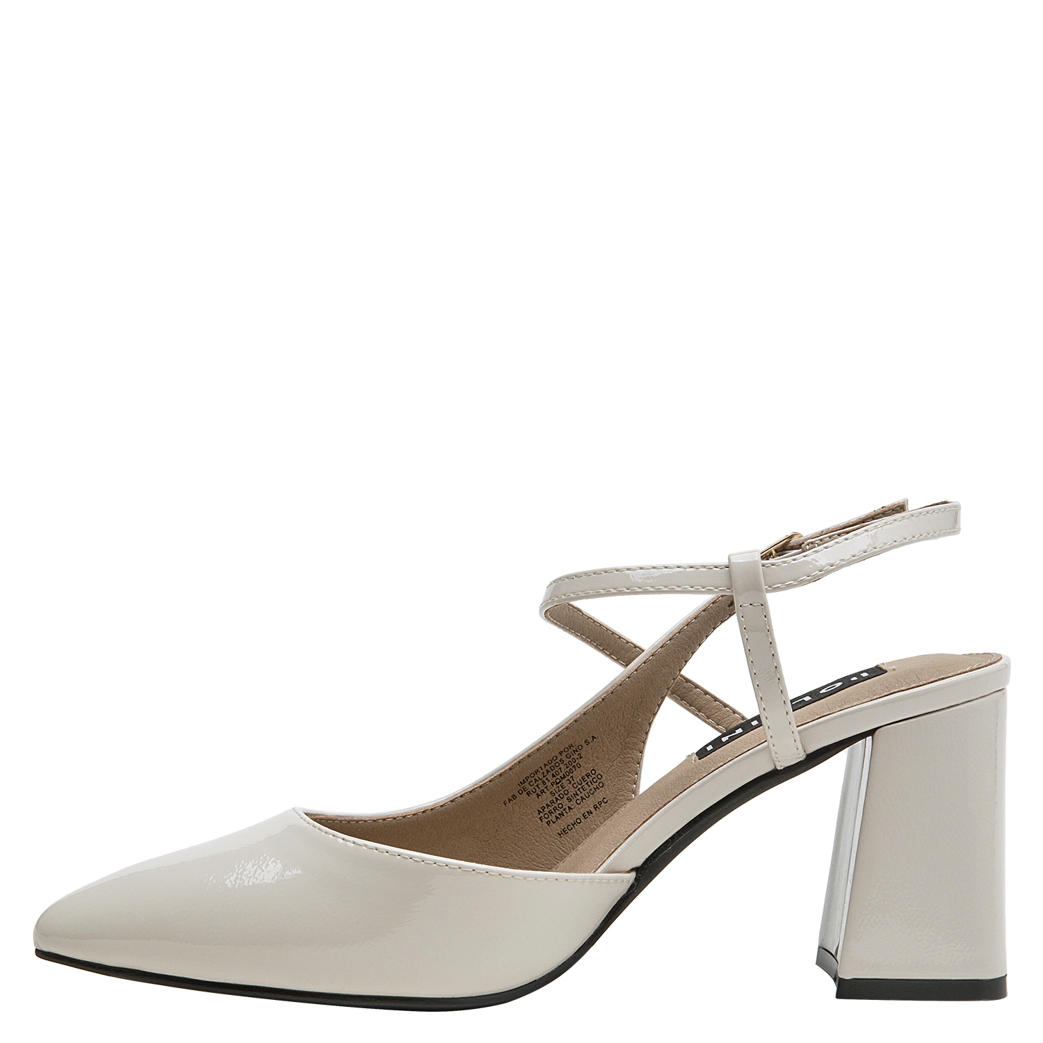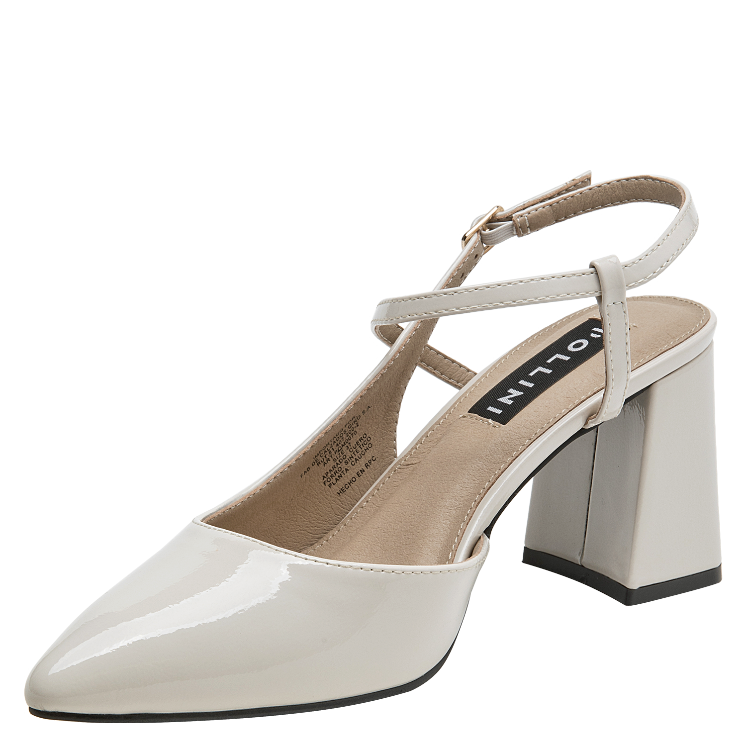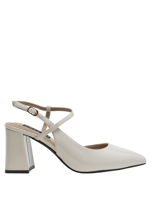 Zapato de mujer en cuero charol, con taco bloque en color beige, de punta puntiaguda y forro de microfibra. El tacón de 7.5 cm ofrece altura equilibrada y una silueta estilizada, mientras la construcción en materiales suaves aporta comodidad en el uso diario. Un diseño versátil y pulido, ideal para elevar conjuntos formales o smart casual.