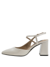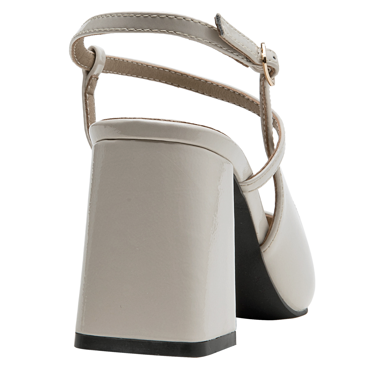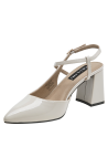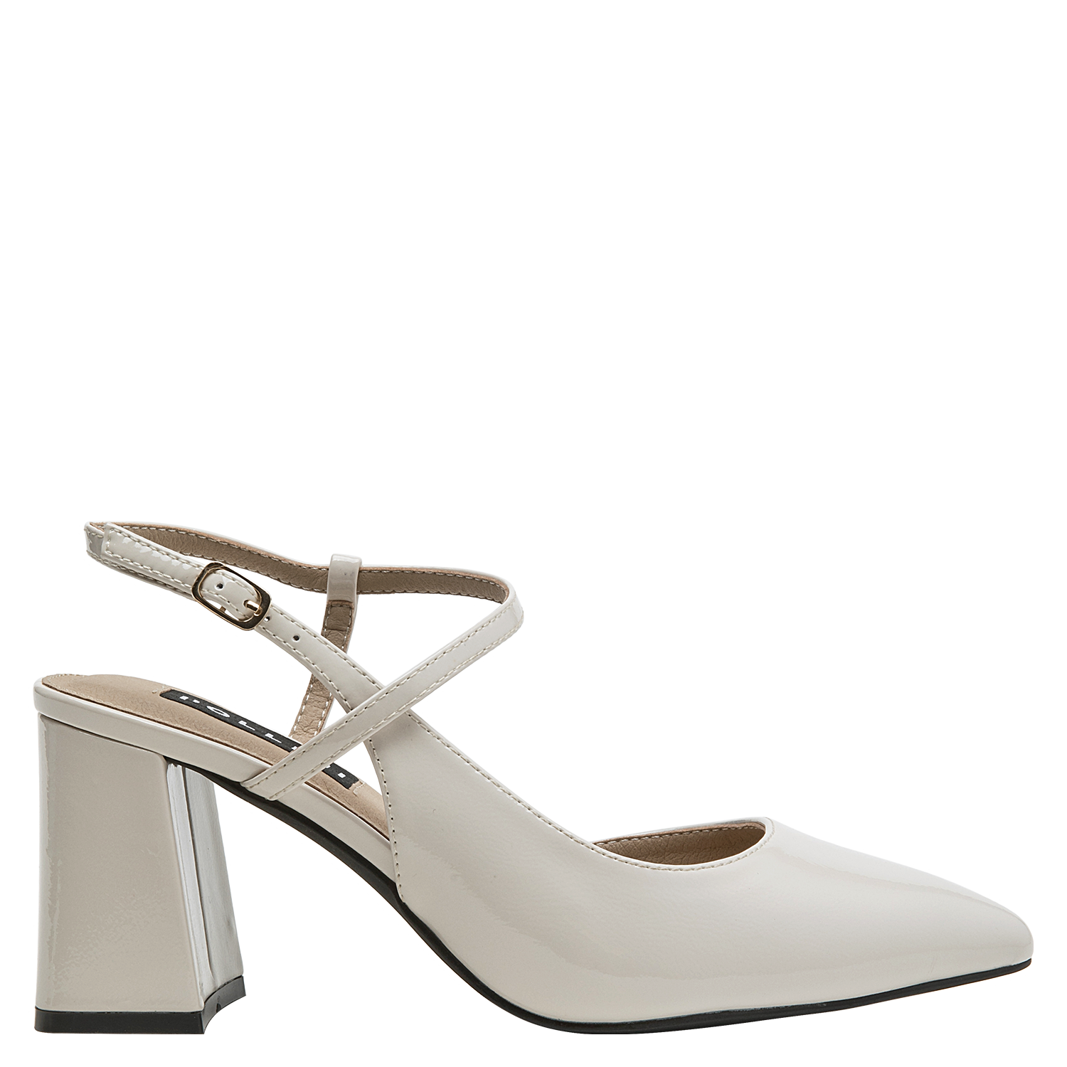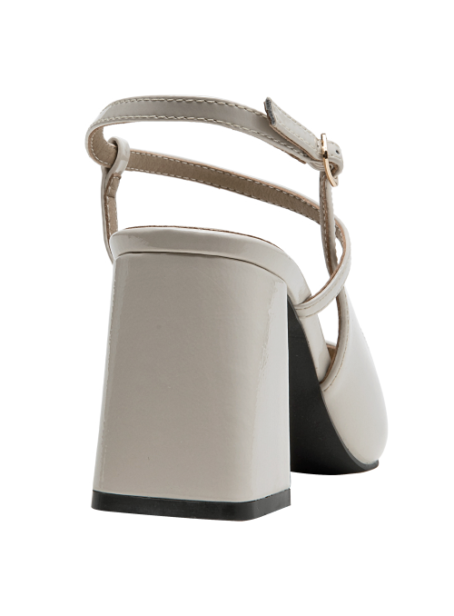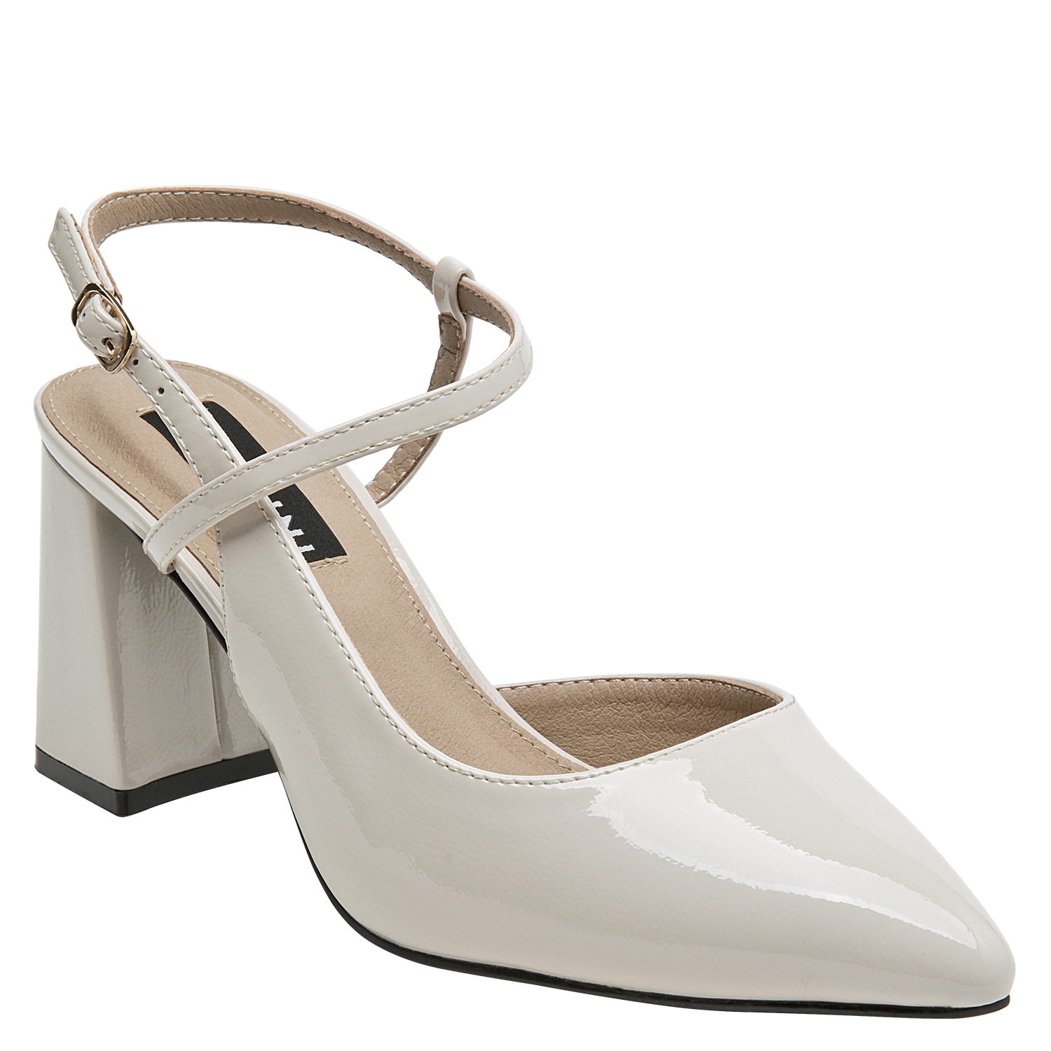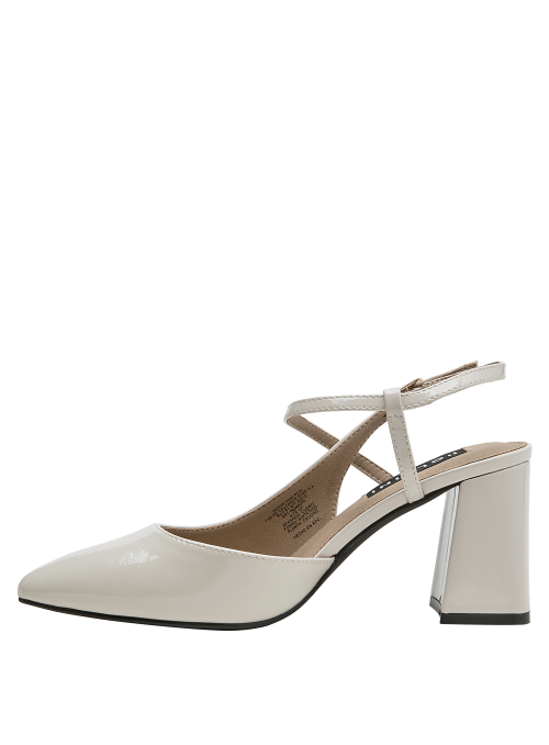 Zapato de mujer en cuero charol, con taco bloque en color beige, de punta puntiaguda y forro de microfibra. El tacón de 7.5 cm ofrece altura equilibrada y una silueta estilizada, mientras la construcción en materiales suaves aporta comodidad en el uso diario. Un diseño versátil y pulido, ideal para elevar conjuntos formales o smart casual.
