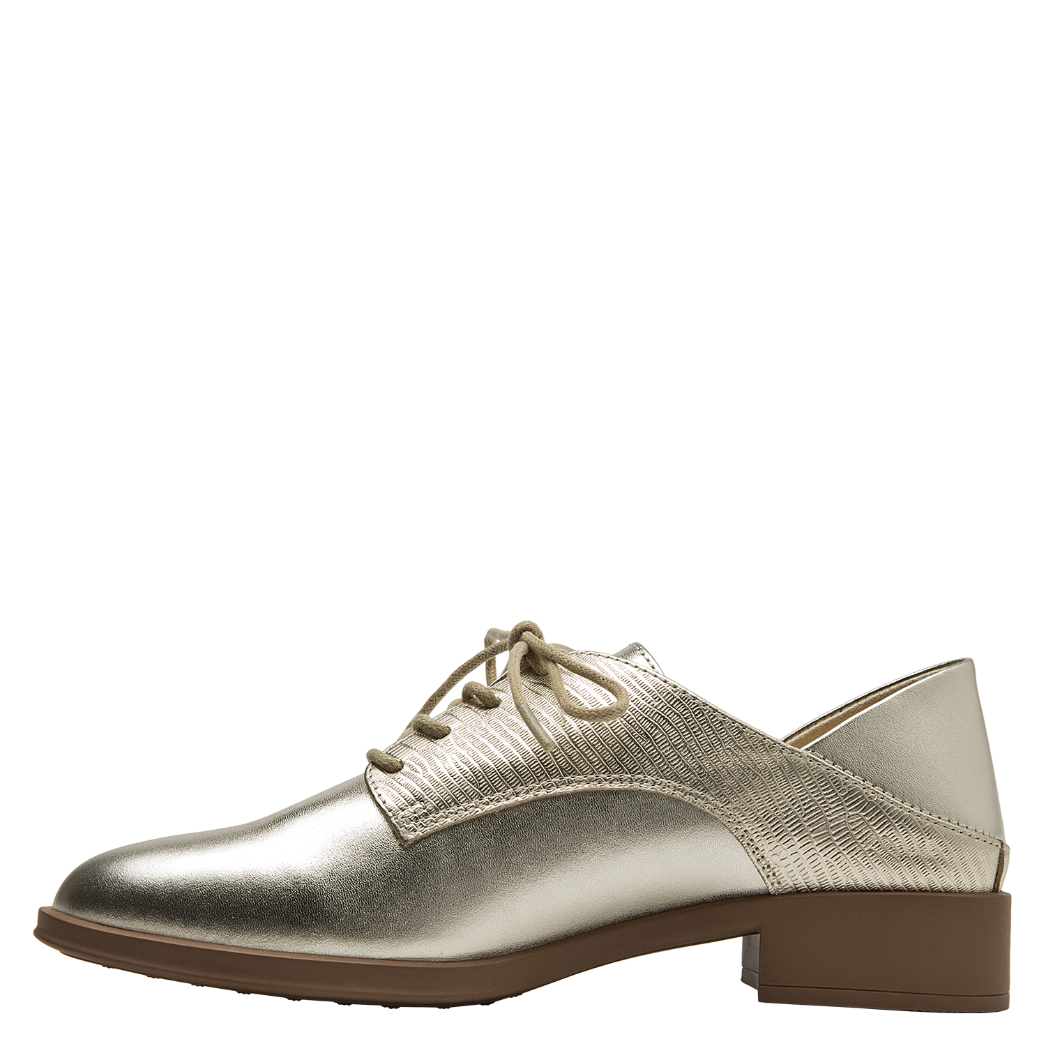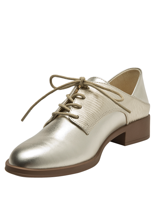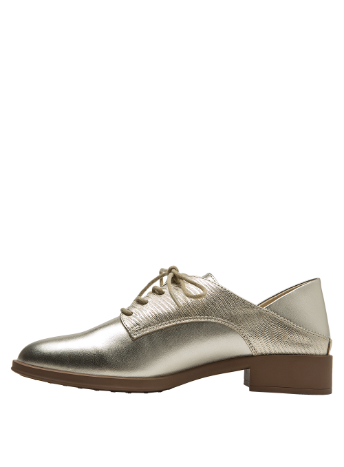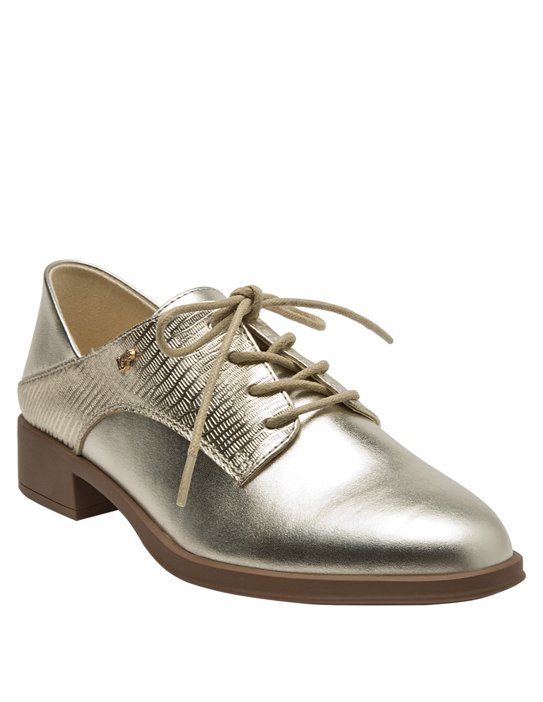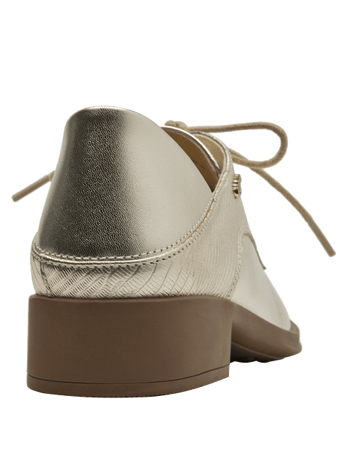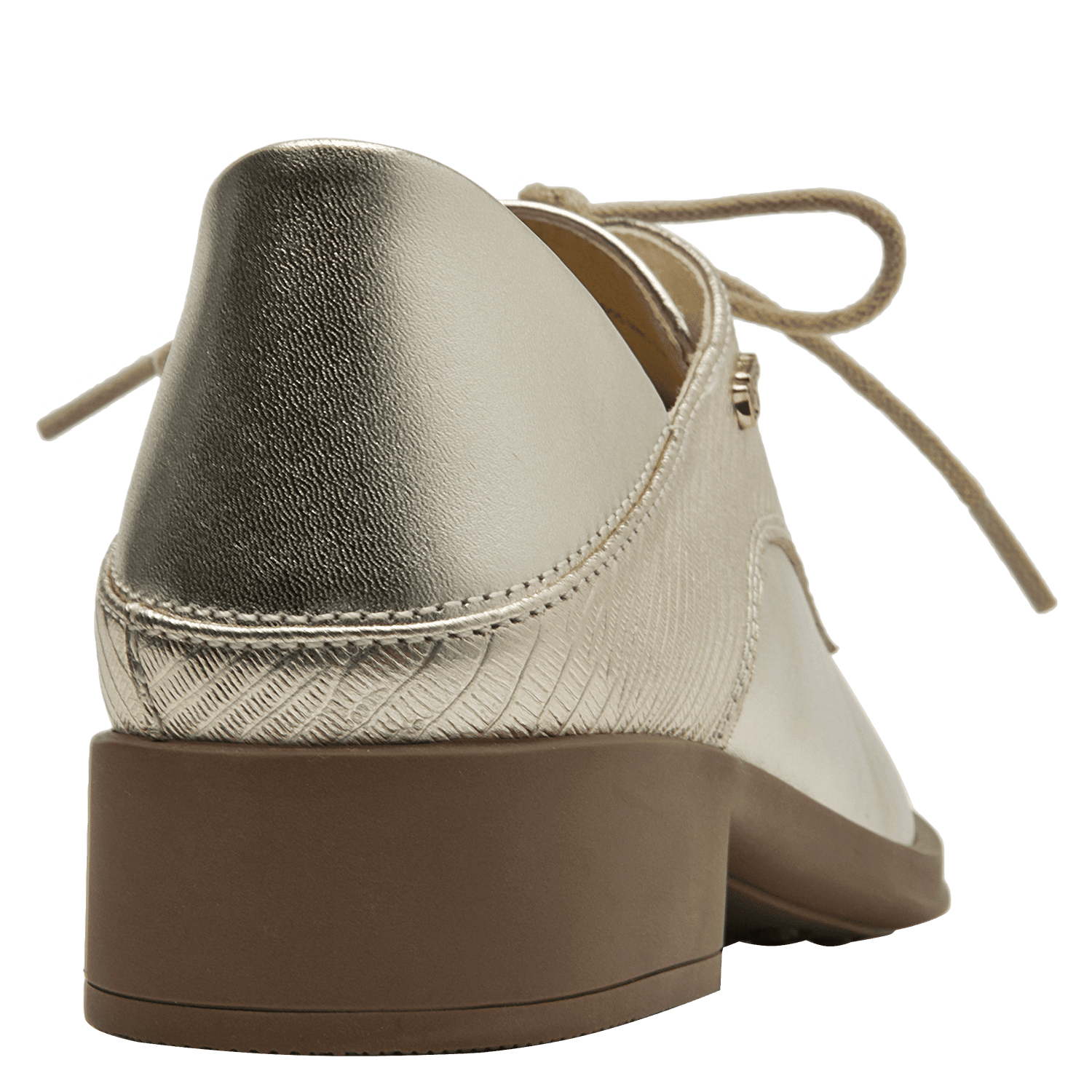 Zapato de cuero para mujer de estilo oxford casual‑elegante en color oro, con punta redonda y taco bloque de 2.5 cm que aporta estabilidad. El acabado dorado realza el look, mientras el forro de microfibra ofrece una sensación suave al contacto. Diseño de perfil limpio y minimalista para múltiples ocasiones.