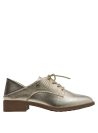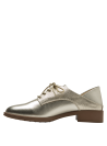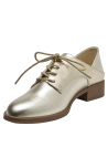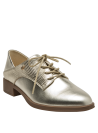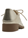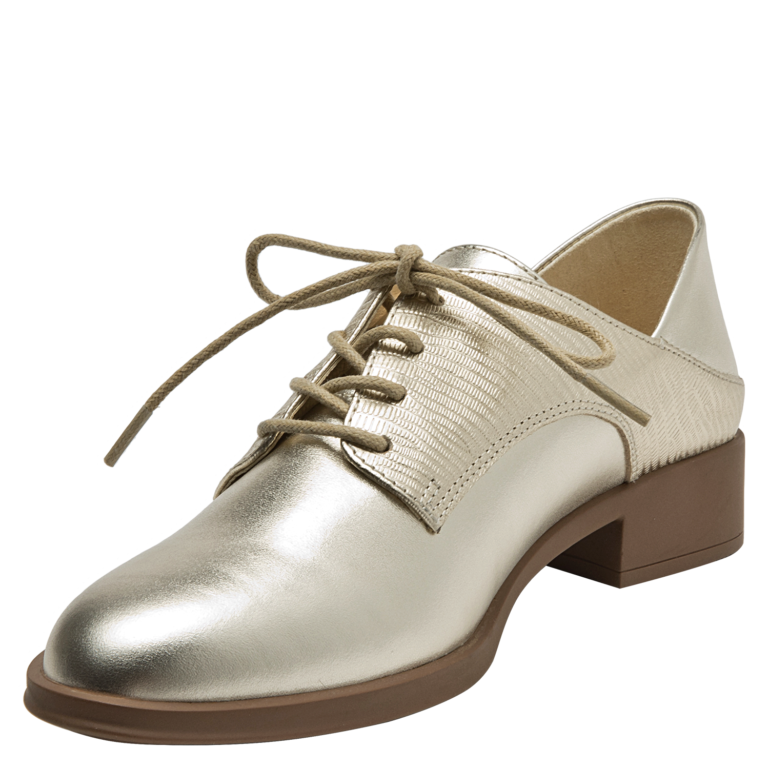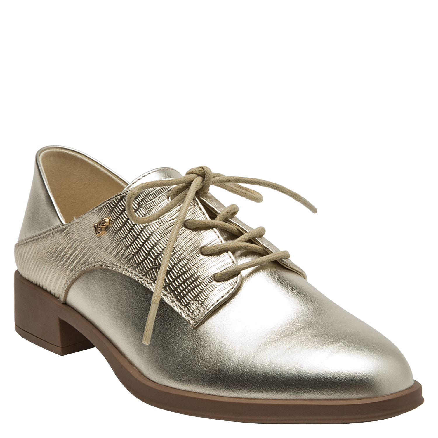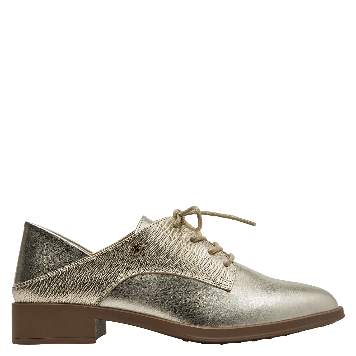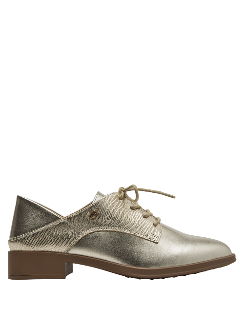 Zapato de cuero para mujer de estilo oxford casual‑elegante en color oro, con punta redonda y taco bloque de 2.5 cm que aporta estabilidad. El acabado dorado realza el look, mientras el forro de microfibra ofrece una sensación suave al contacto. Diseño de perfil limpio y minimalista para múltiples ocasiones.