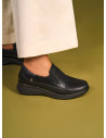 Zapato plano de cuero negro para mujer, con punta redonda y taco de 3 cm. Forro de microfibra que aporta suavidad al contacto, terminación sobria y versátil para uso diario y ocasiones casuales. Diseño atemporal que combina comodidad y estilo sin excesos.
