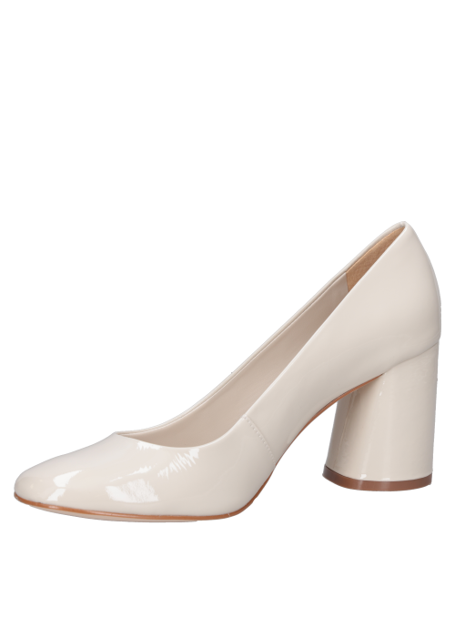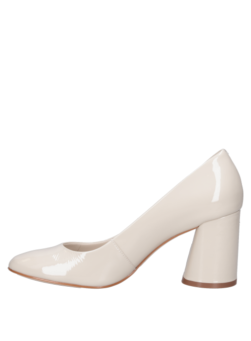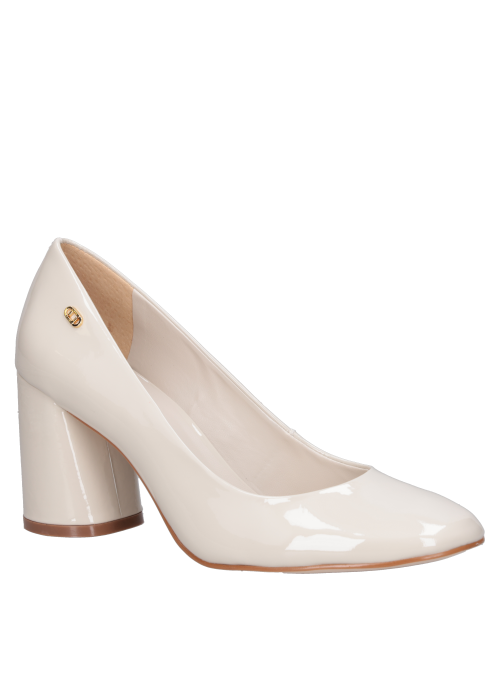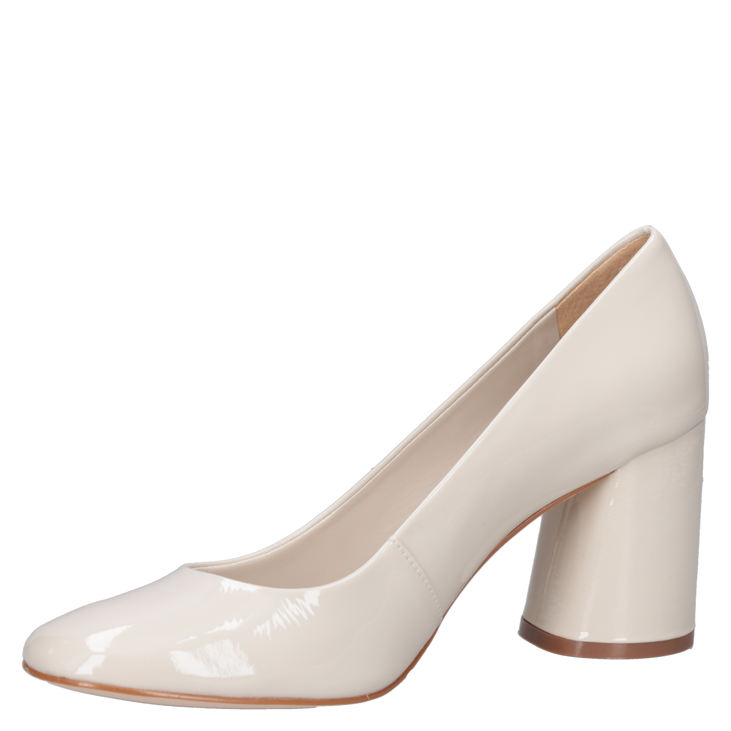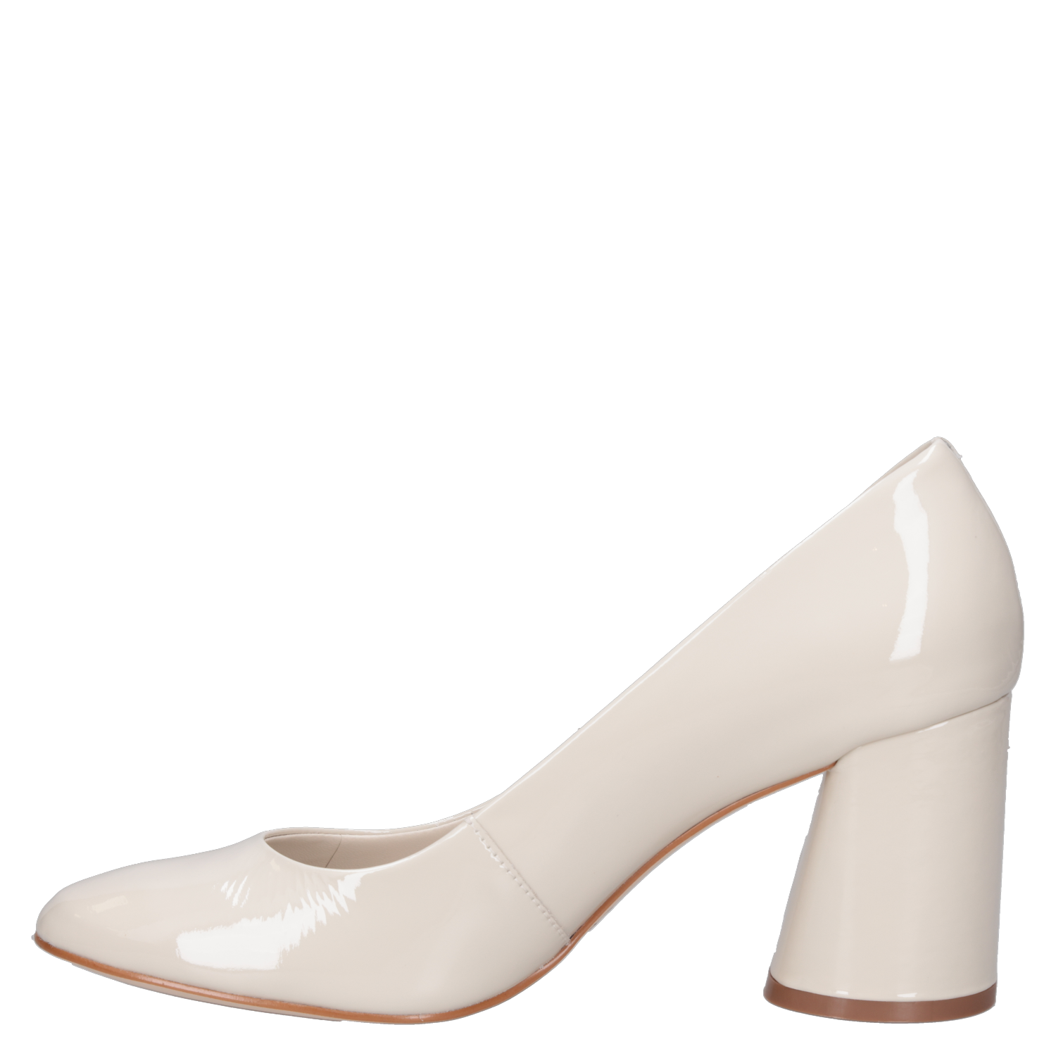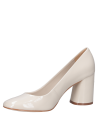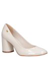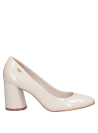 Zapato de mujer de cuero charol con taco bloque en color blanco y punta redonda. La capellada de cuero luce pulcra y versátil, mientras el forro sintético aporta suavidad. El taco de 7,5 cm eleva tu estilo con base estable para el día o la noche. Diseño minimalista y femenino que se adapta a múltiples looks.