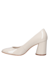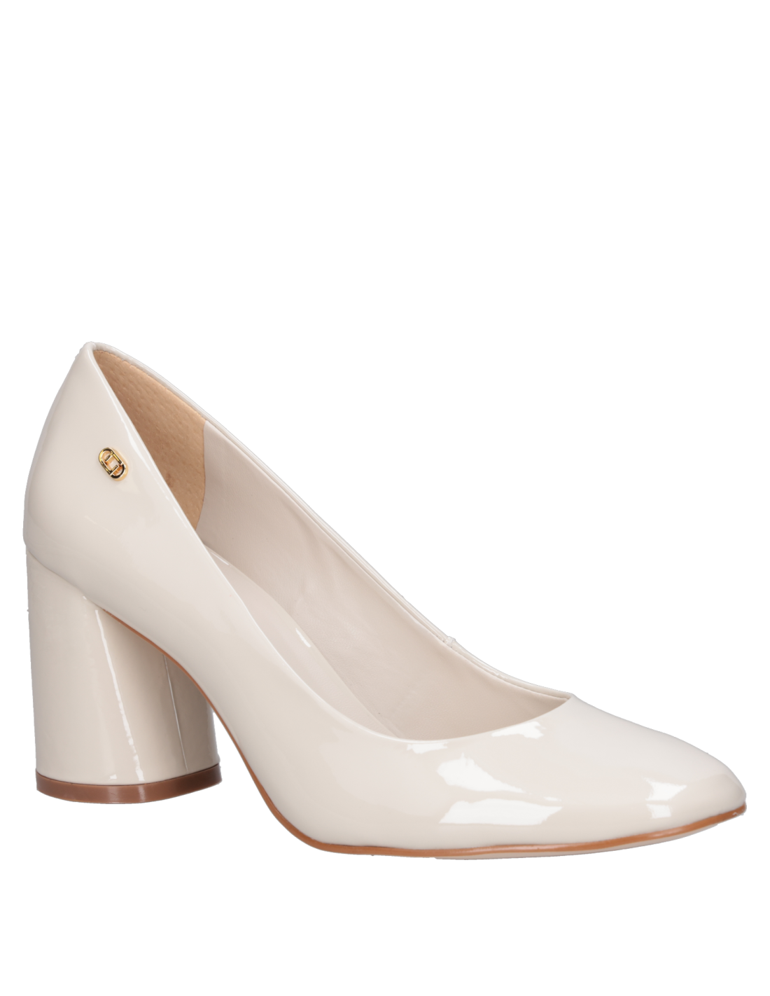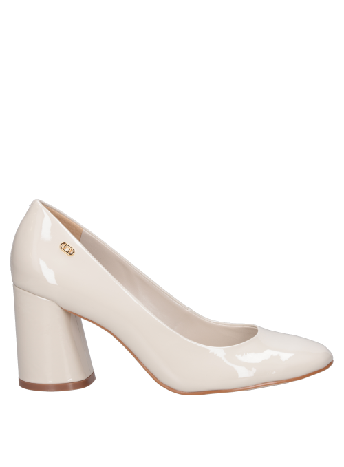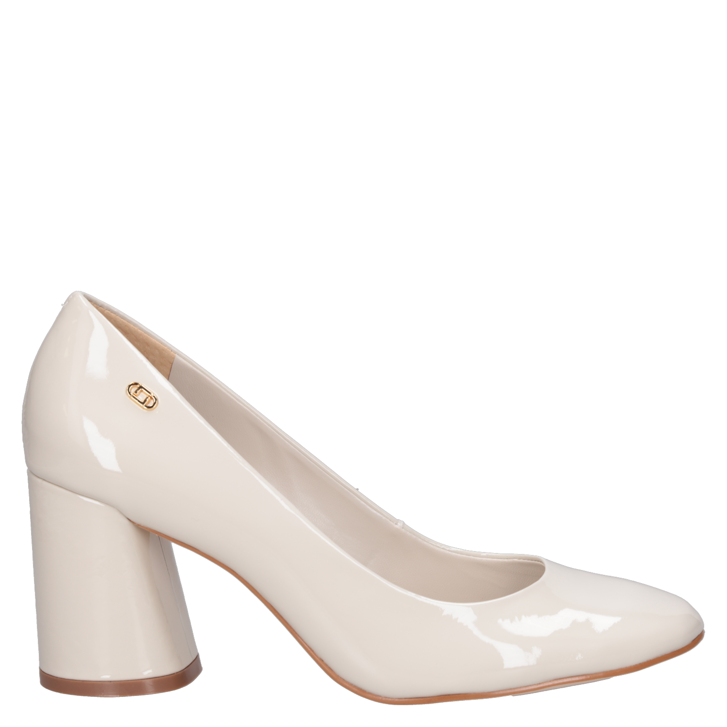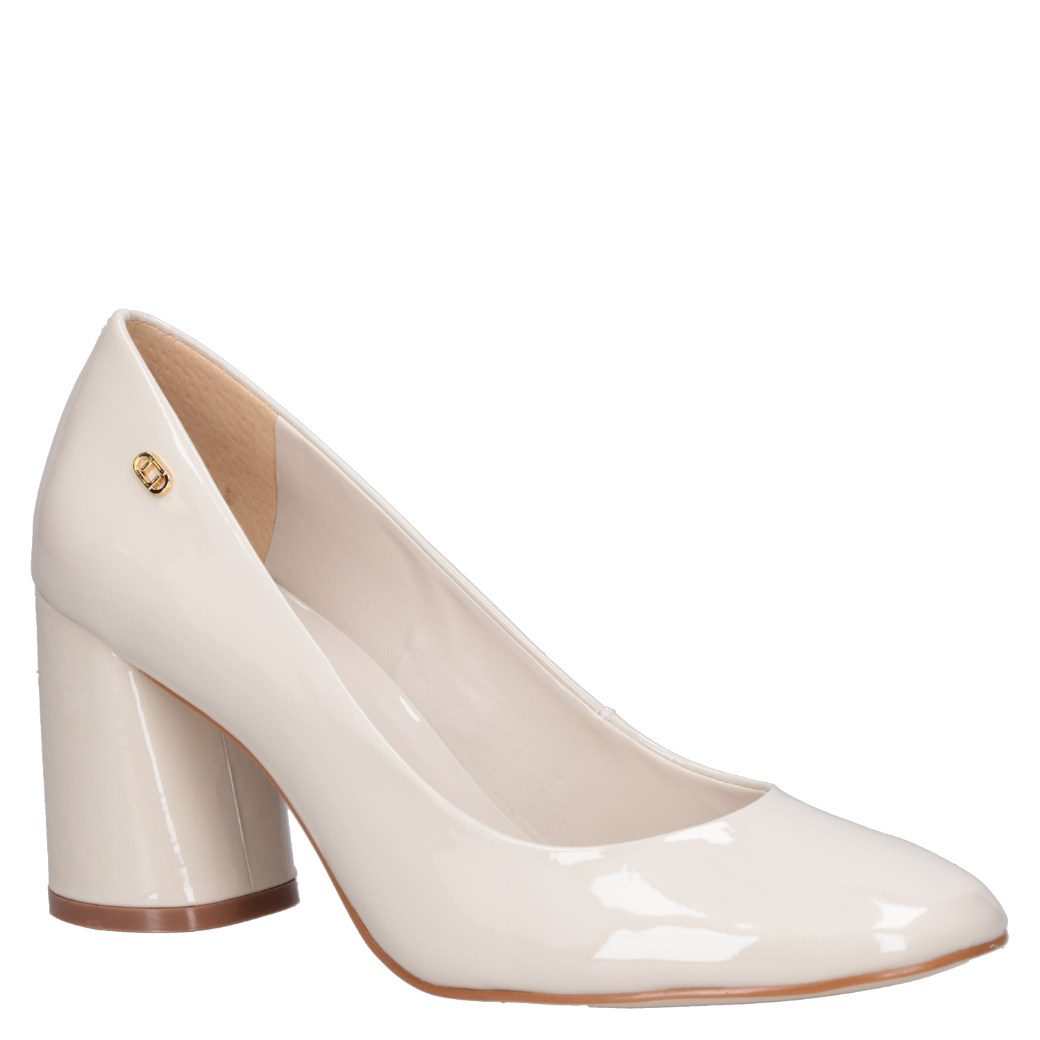 Zapato de mujer de cuero charol con taco bloque en color blanco y punta redonda. La capellada de cuero luce pulcra y versátil, mientras el forro sintético aporta suavidad. El taco de 7,5 cm eleva tu estilo con base estable para el día o la noche. Diseño minimalista y femenino que se adapta a múltiples looks.