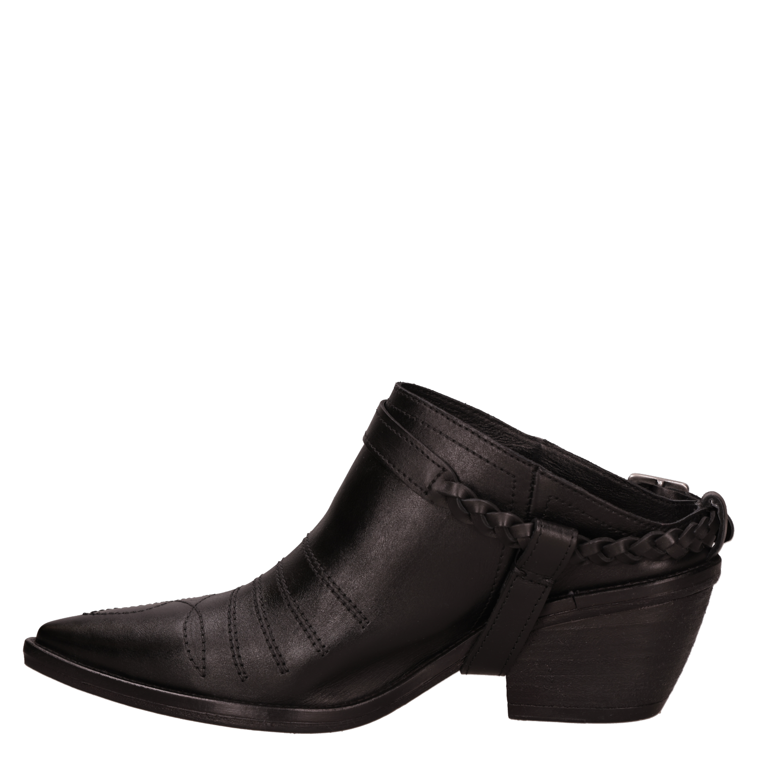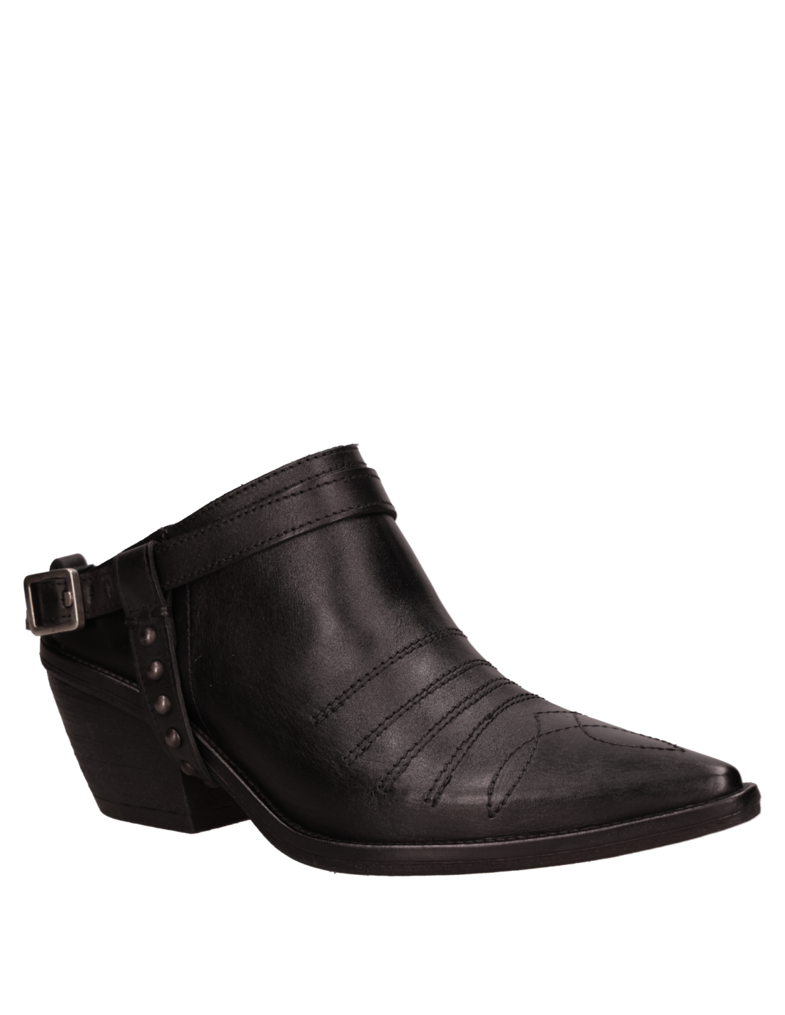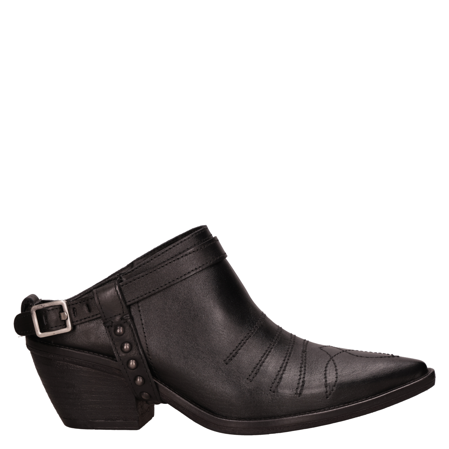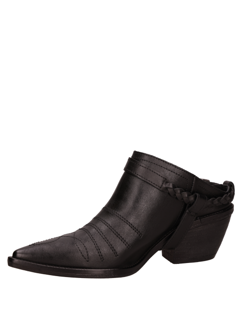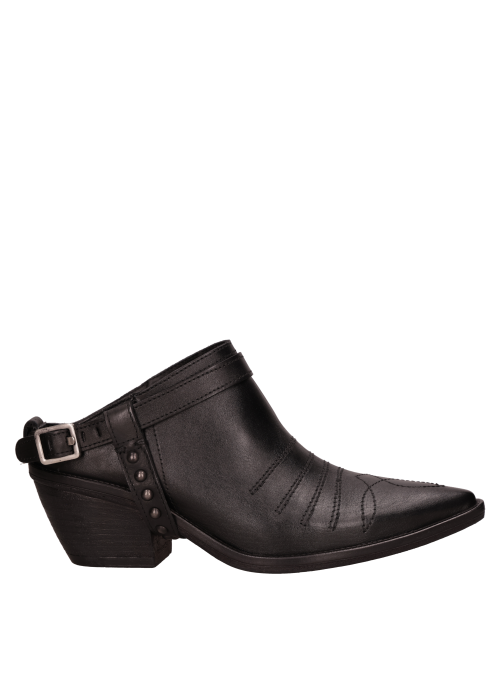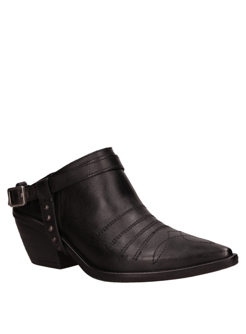 Zapato mule para mujer en color negro, de líneas limpias, punta puntiaguda y estilo vaquero. Confeccionado en cuero y forrado en cuero, incorpora un taco bloque de 6.5 cm que aporta estabilidad y una altura equilibrada. Su estética western minimalista lo hace versátil para vestir del trabajo a ocasiones especiales.