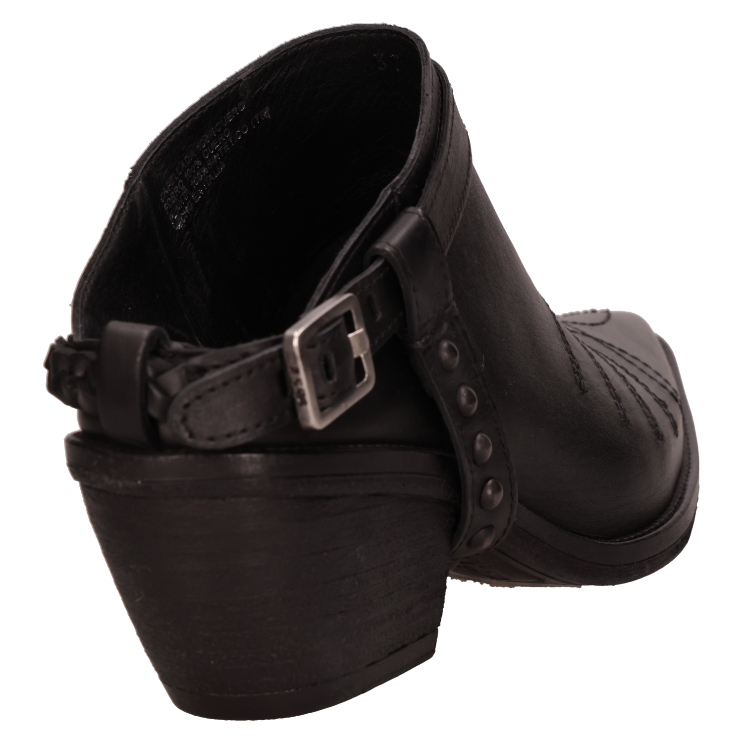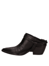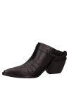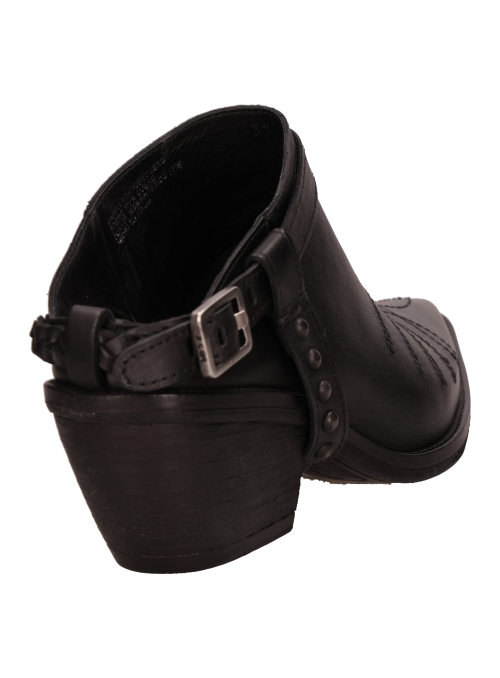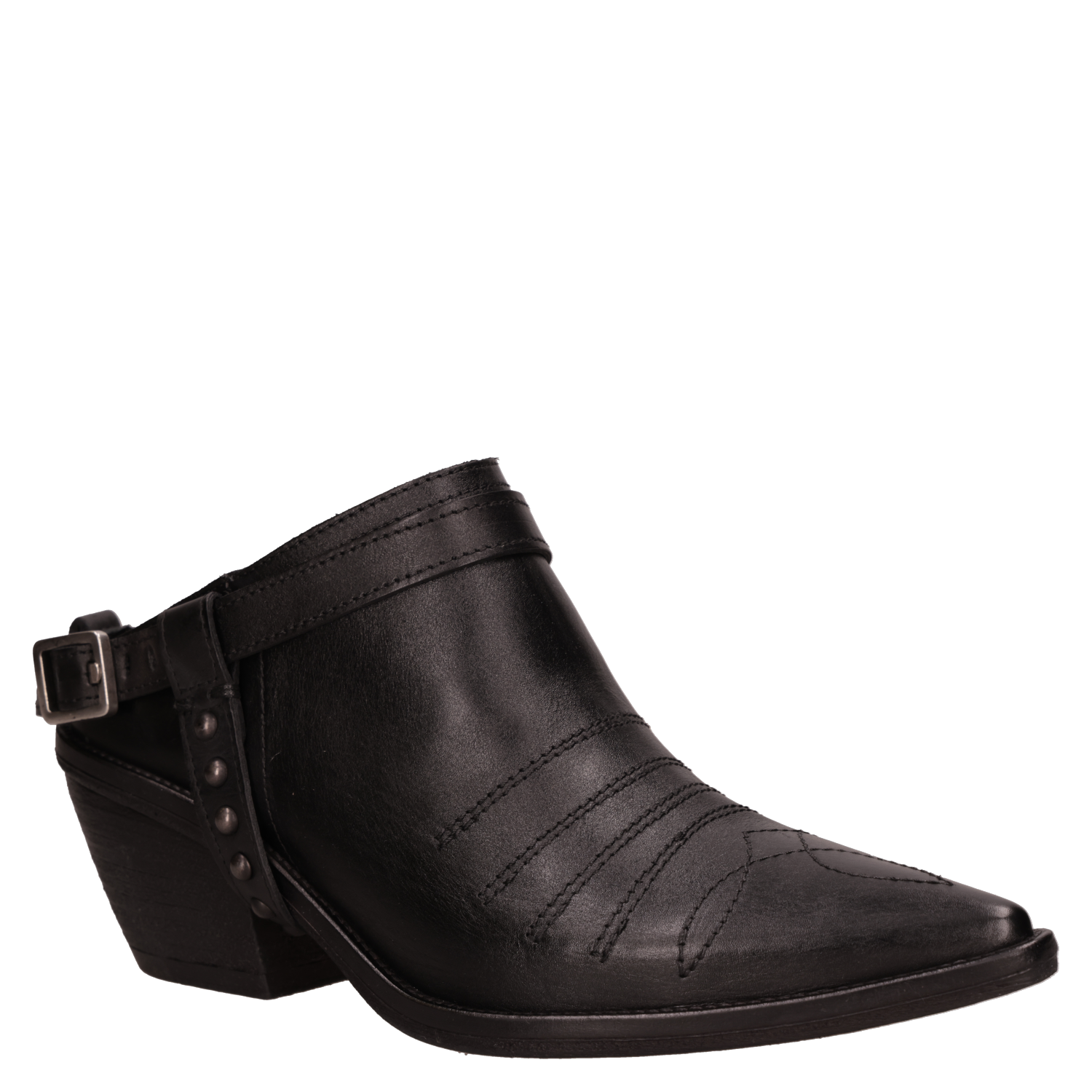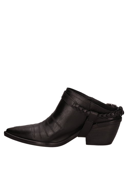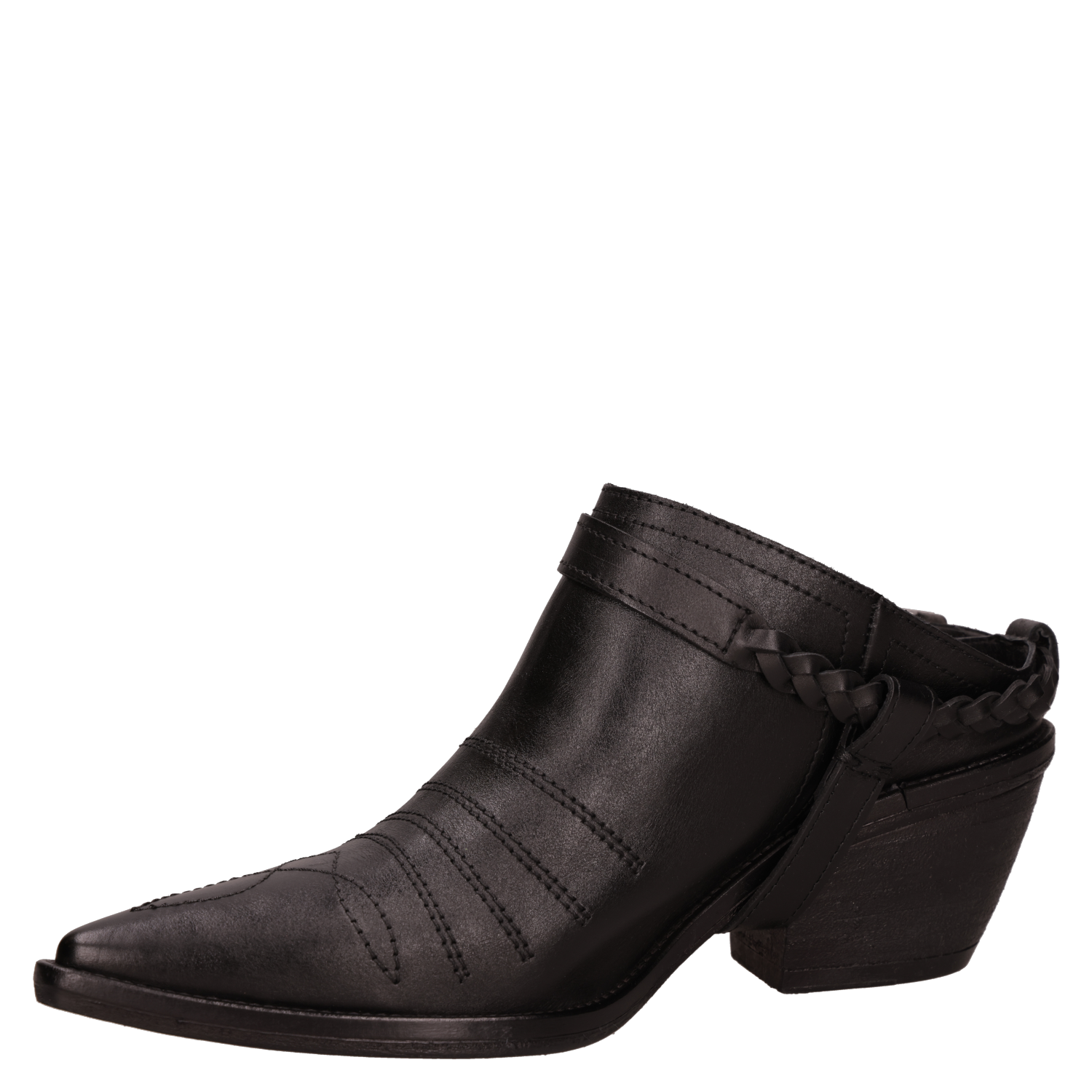 Zapato mule para mujer en color negro, de líneas limpias, punta puntiaguda y estilo vaquero. Confeccionado en cuero y forrado en cuero, incorpora un taco bloque de 6.5 cm que aporta estabilidad y una altura equilibrada. Su estética western minimalista lo hace versátil para vestir del trabajo a ocasiones especiales.