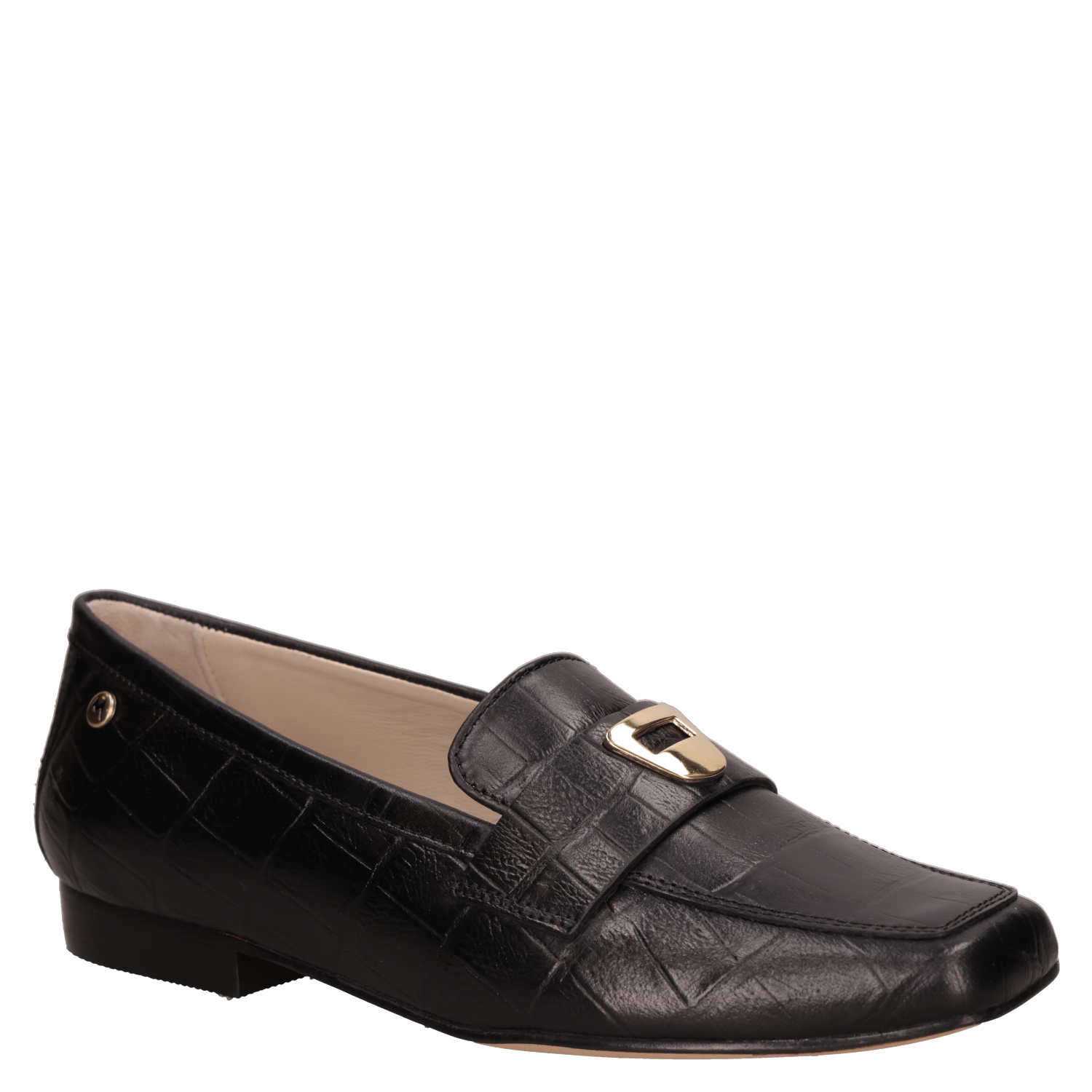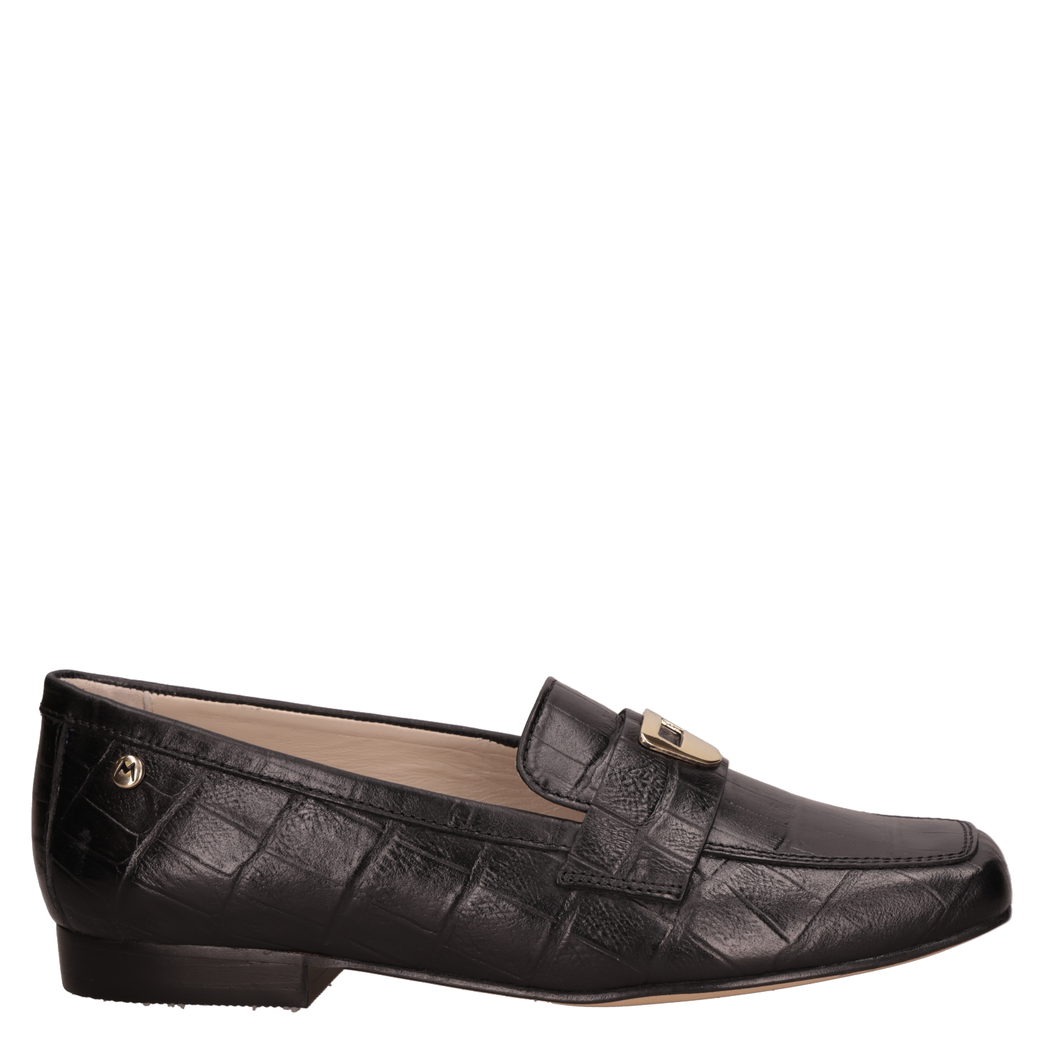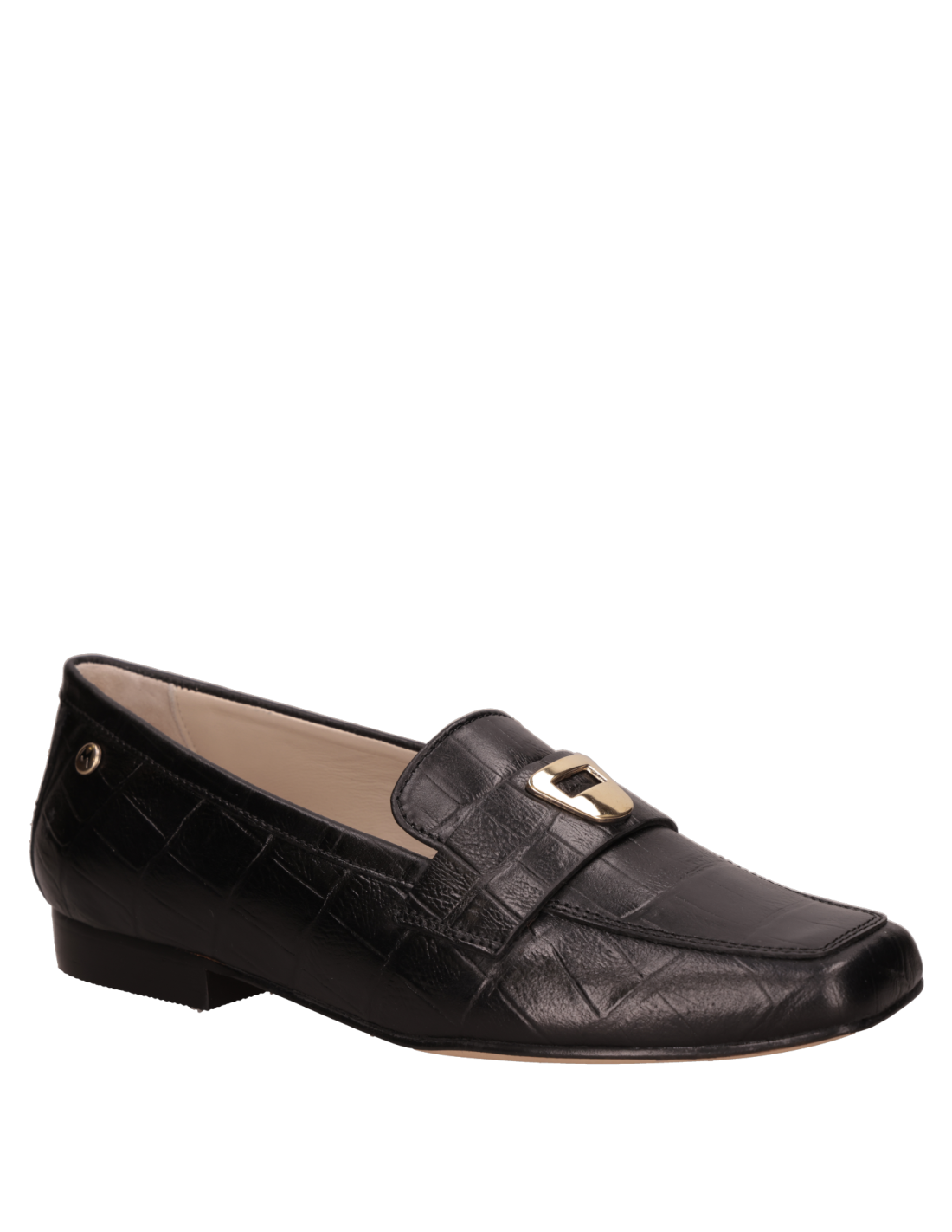 Mocasín de cuero para mujer en color negro, con punta cuadrada y taco de 2 cm. Su exterior y forro de cuero aportan un acabado sobrio y duradero, mientras la silueta minimalista ofrece un toque contemporáneo fácil de combinar.