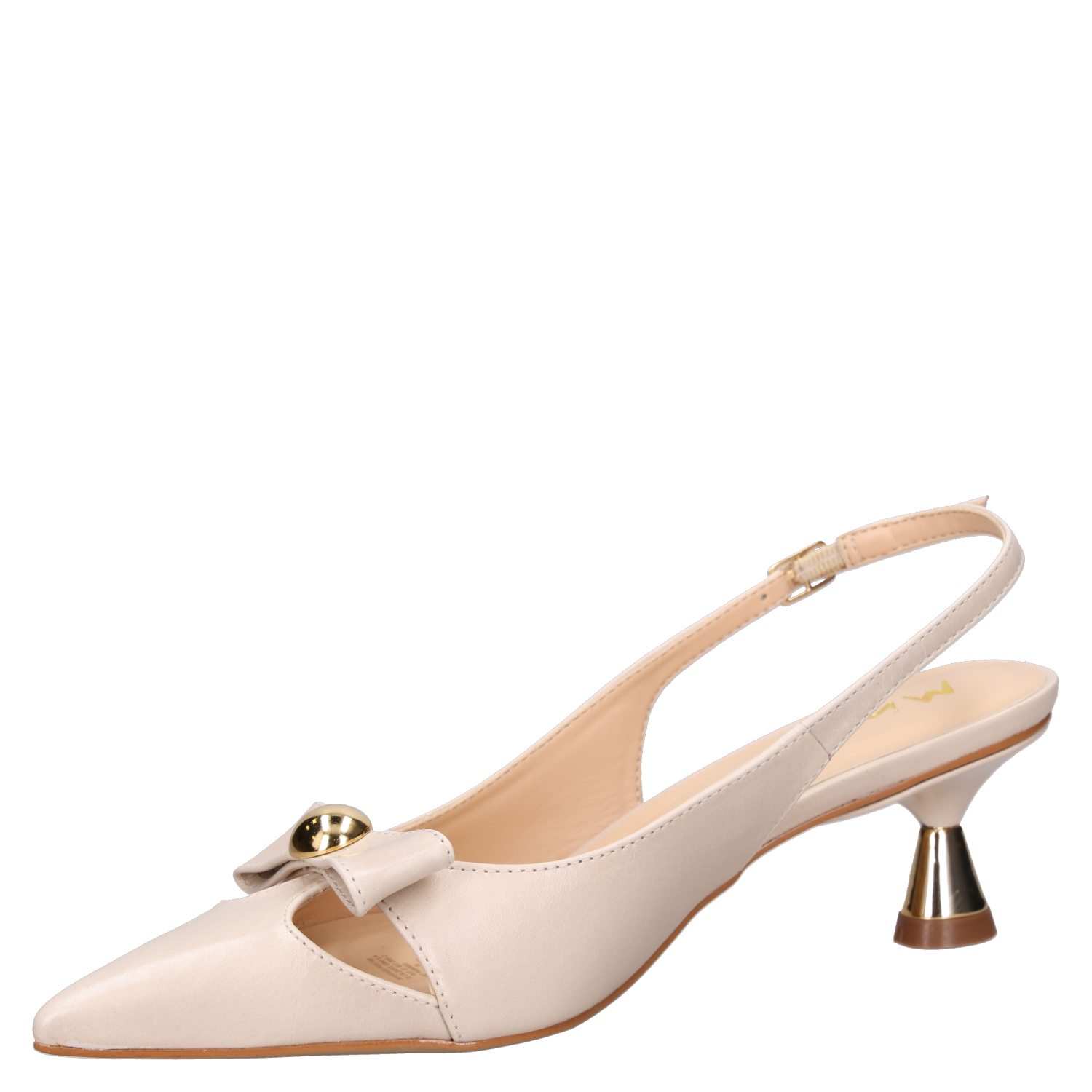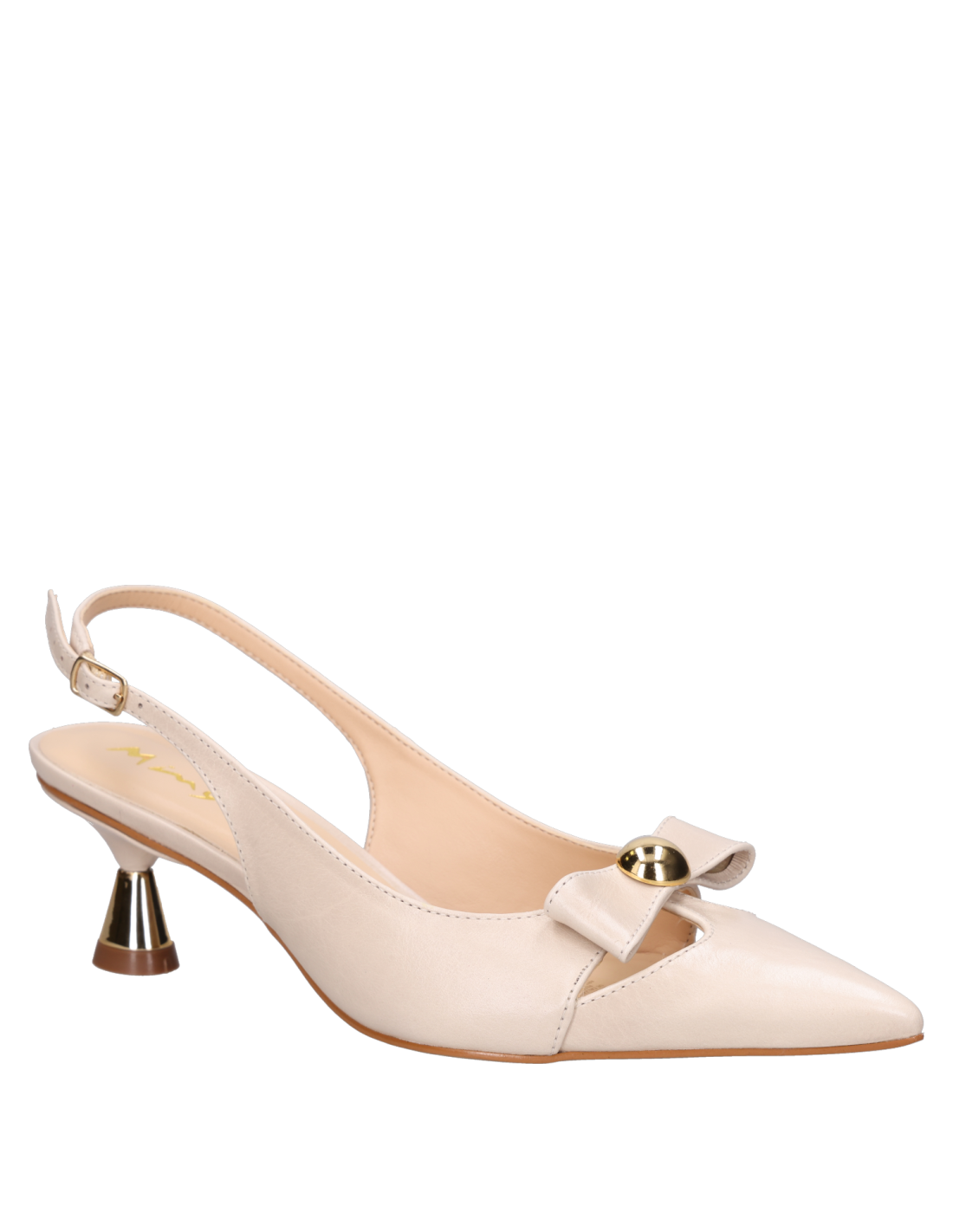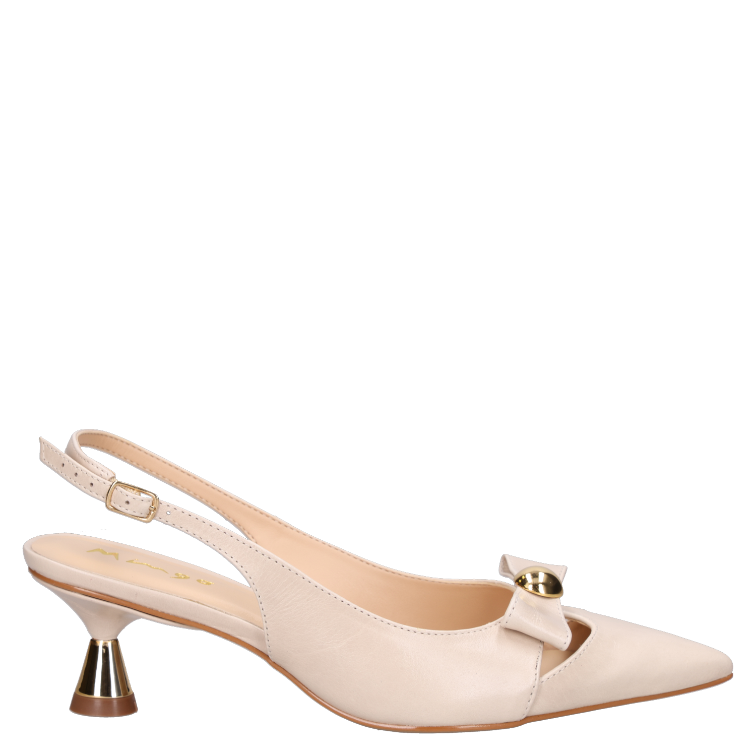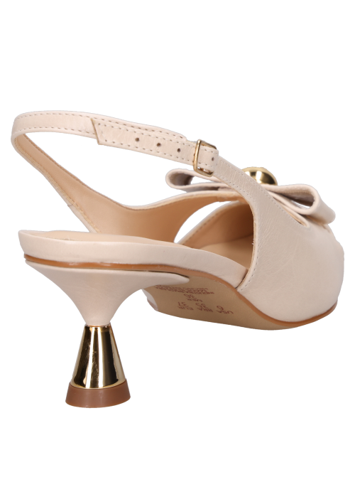 Elegancia atemporal con un toque moderno. Este zapato slingback de cuero destaca por su diseño refinado y femenino, con una silueta de punta afilada que estiliza el pie y realza la figura. En el empeine, un delicado lazo estructurado con aplique metálico dorado aporta distinción y carácter. Su tacón bajo de forma cónica con acabado metalizado crea un contraste sofisticado que equilibra comodidad y glamour, ideal para acompañar tus jornadas con estilo.