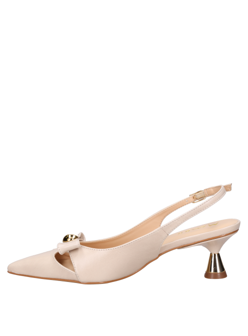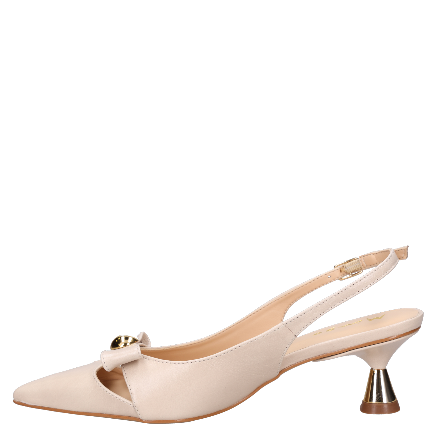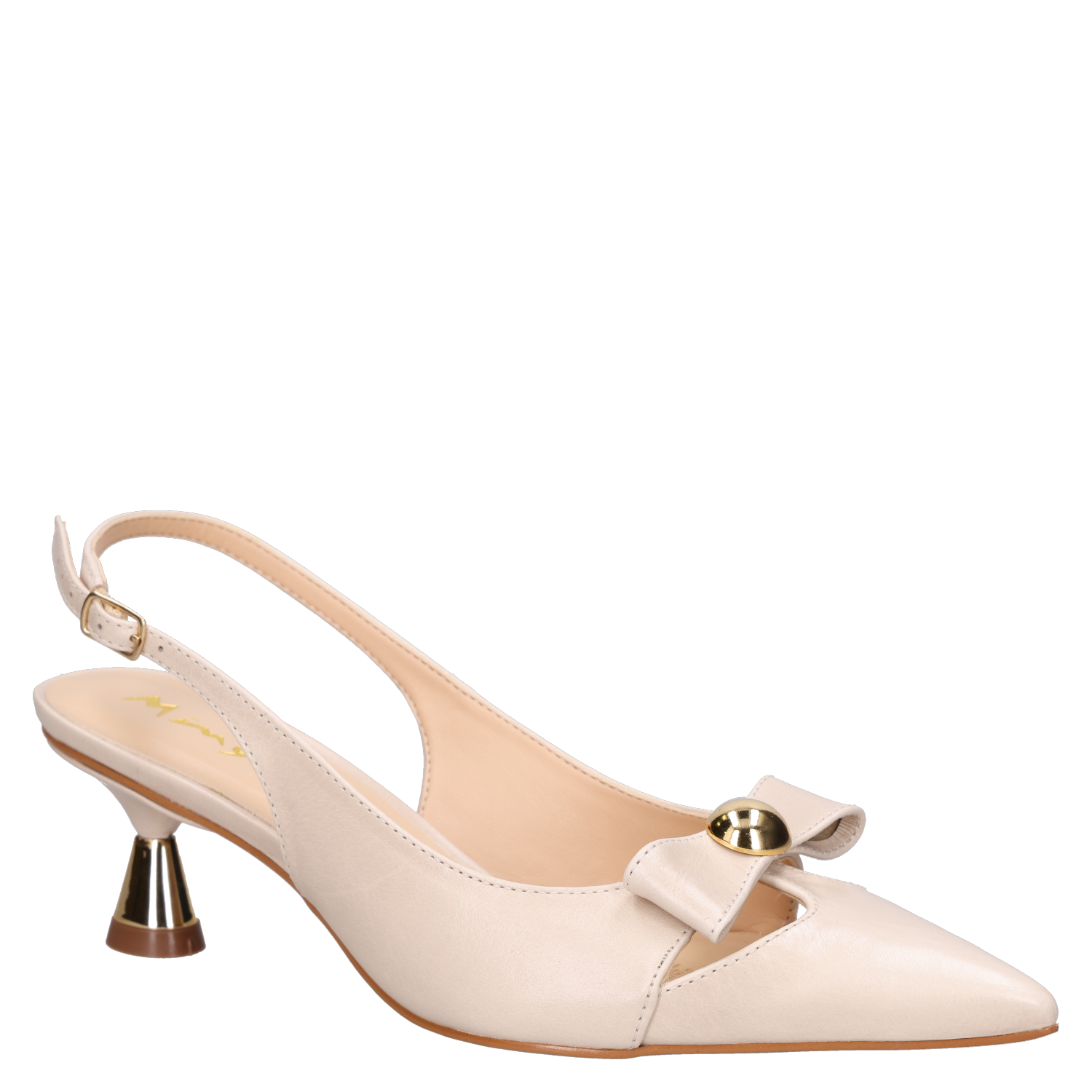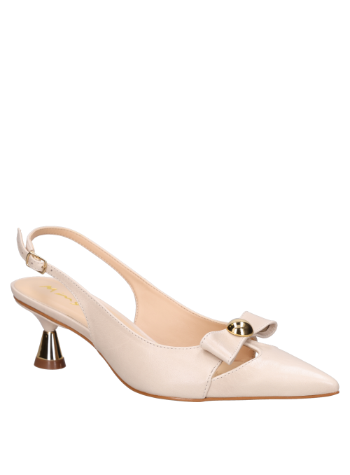 Elegancia atemporal con un toque moderno. Este zapato slingback de cuero destaca por su diseño refinado y femenino, con una silueta de punta afilada que estiliza el pie y realza la figura. En el empeine, un delicado lazo estructurado con aplique metálico dorado aporta distinción y carácter. Su tacón bajo de forma cónica con acabado metalizado crea un contraste sofisticado que equilibra comodidad y glamour, ideal para acompañar tus jornadas con estilo.