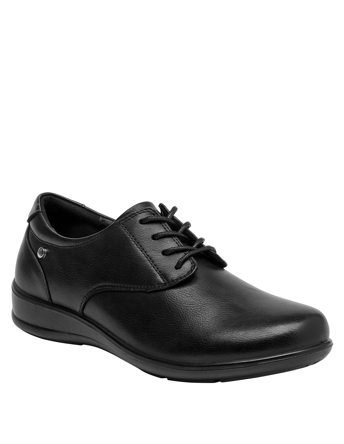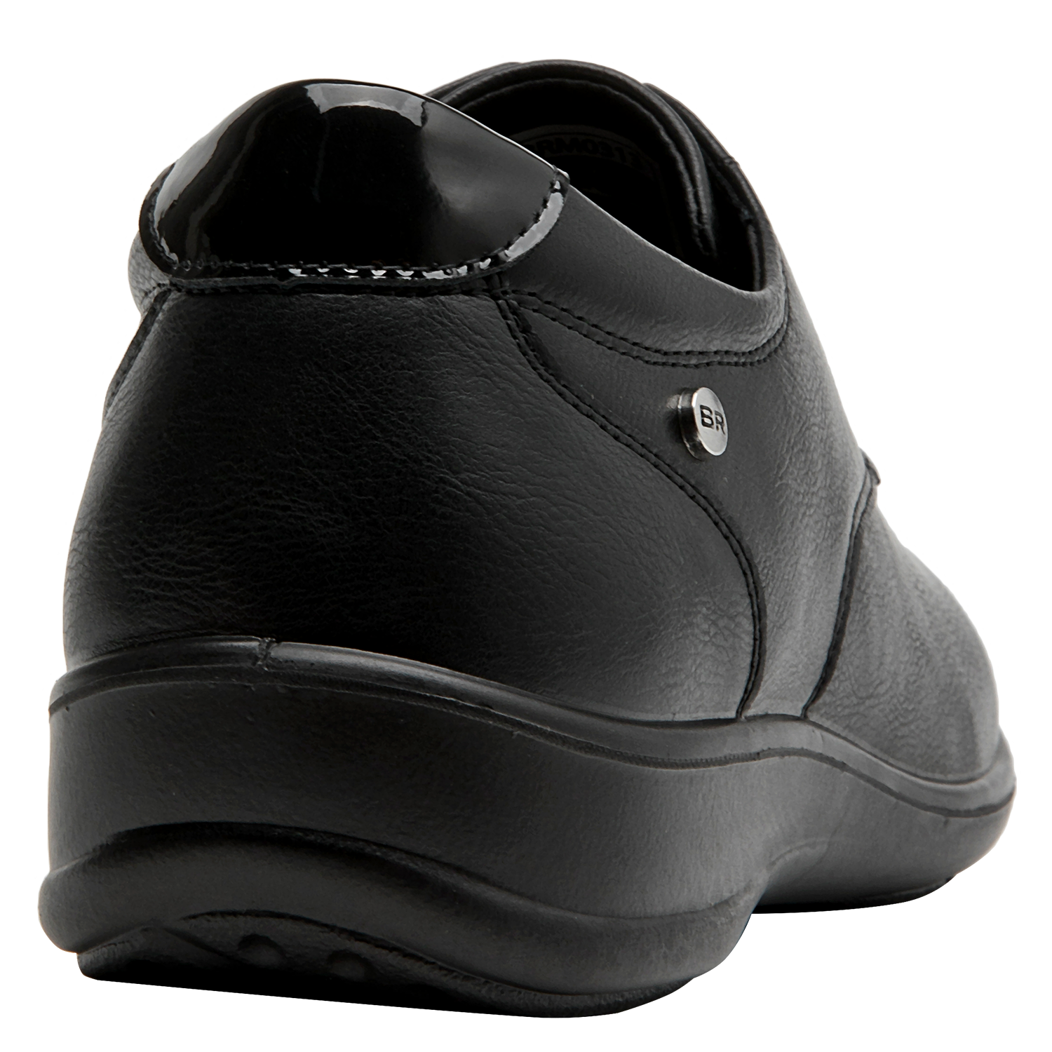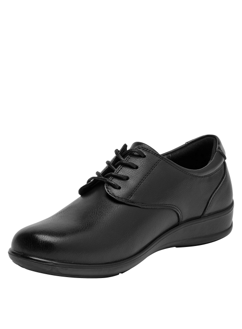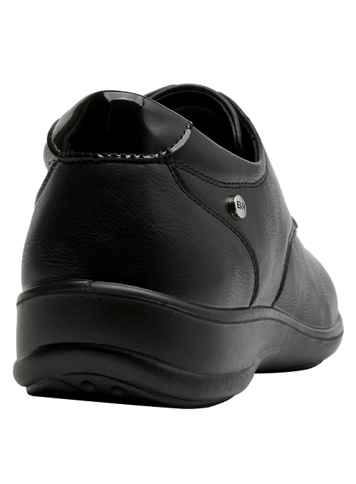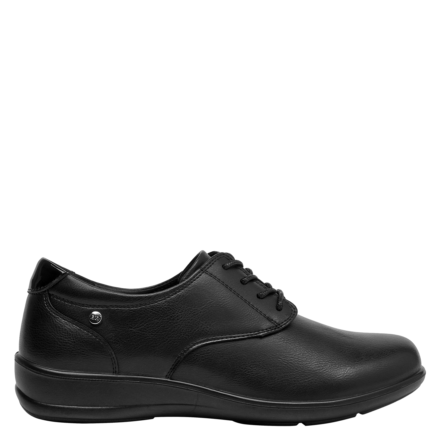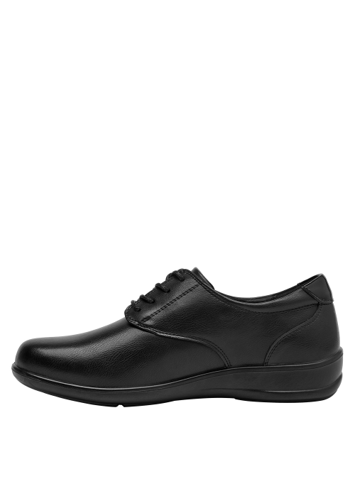 Zapato plano de cuero para mujer en color negro, de punta redonda y taco de 3 cm que aporta una leve elevación. Presenta capellada lisa y diseño minimalista, con forro mixto sintético/textil que entrega una sensación suave. La suela plana favorece la estabilidad en el día a día, mientras su silueta atemporal se adapta a múltiples estilos sin recargar el look.