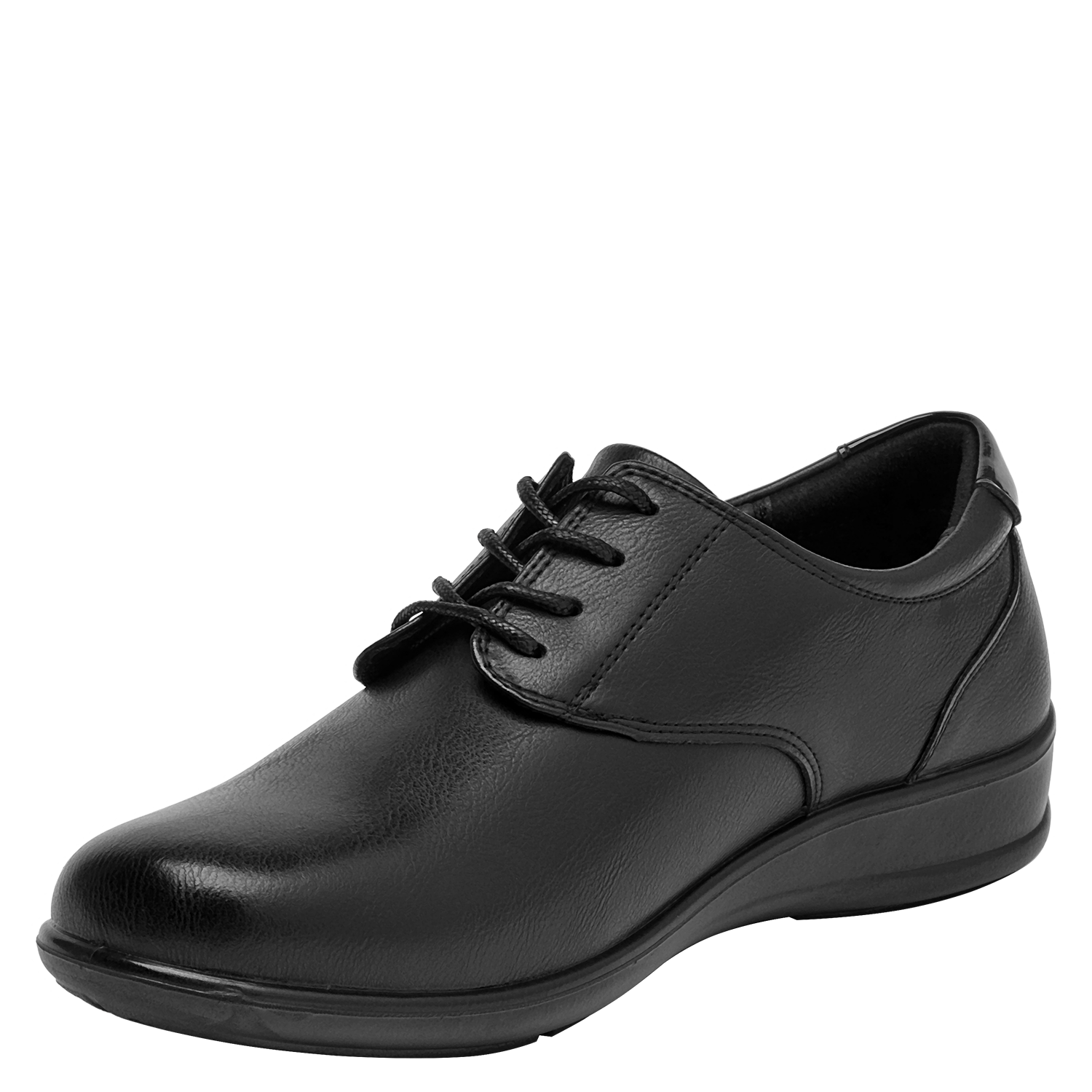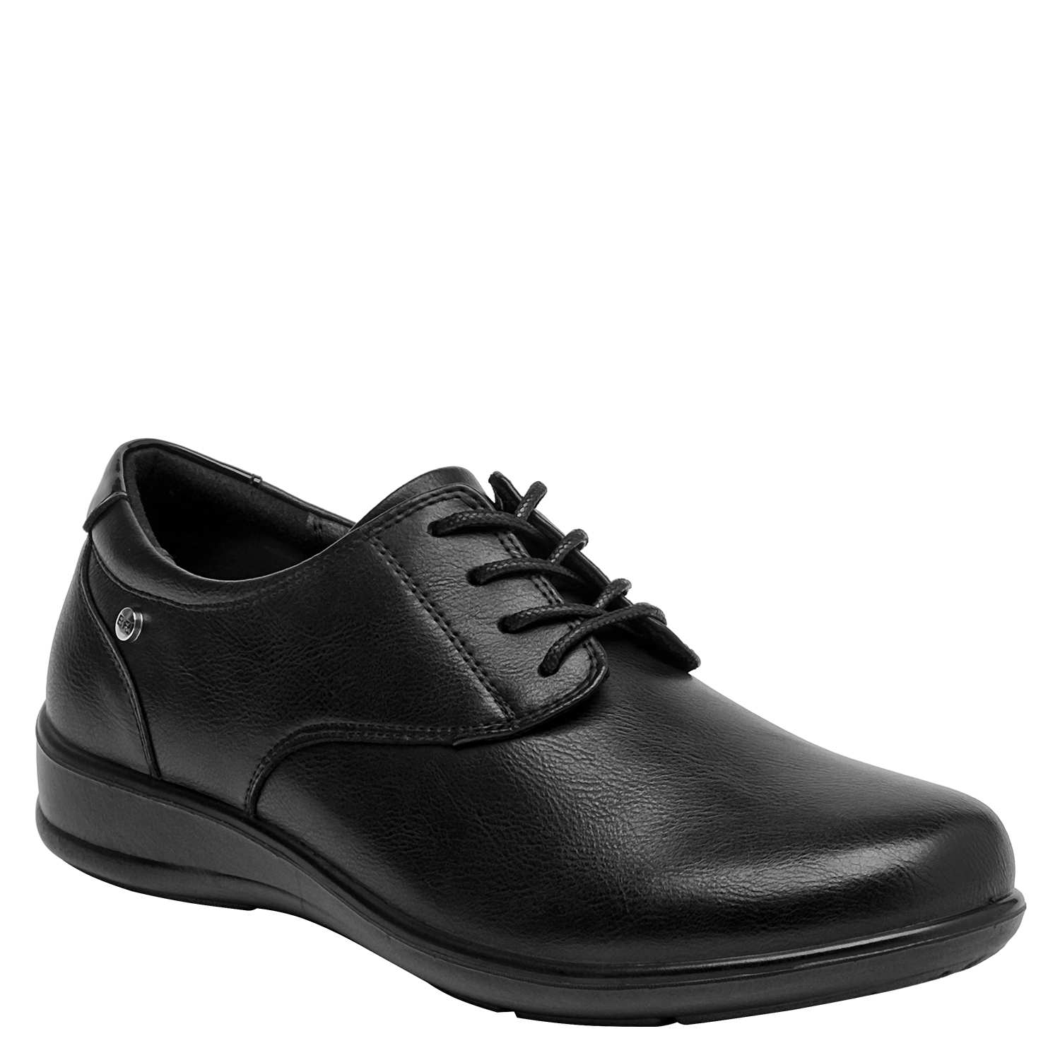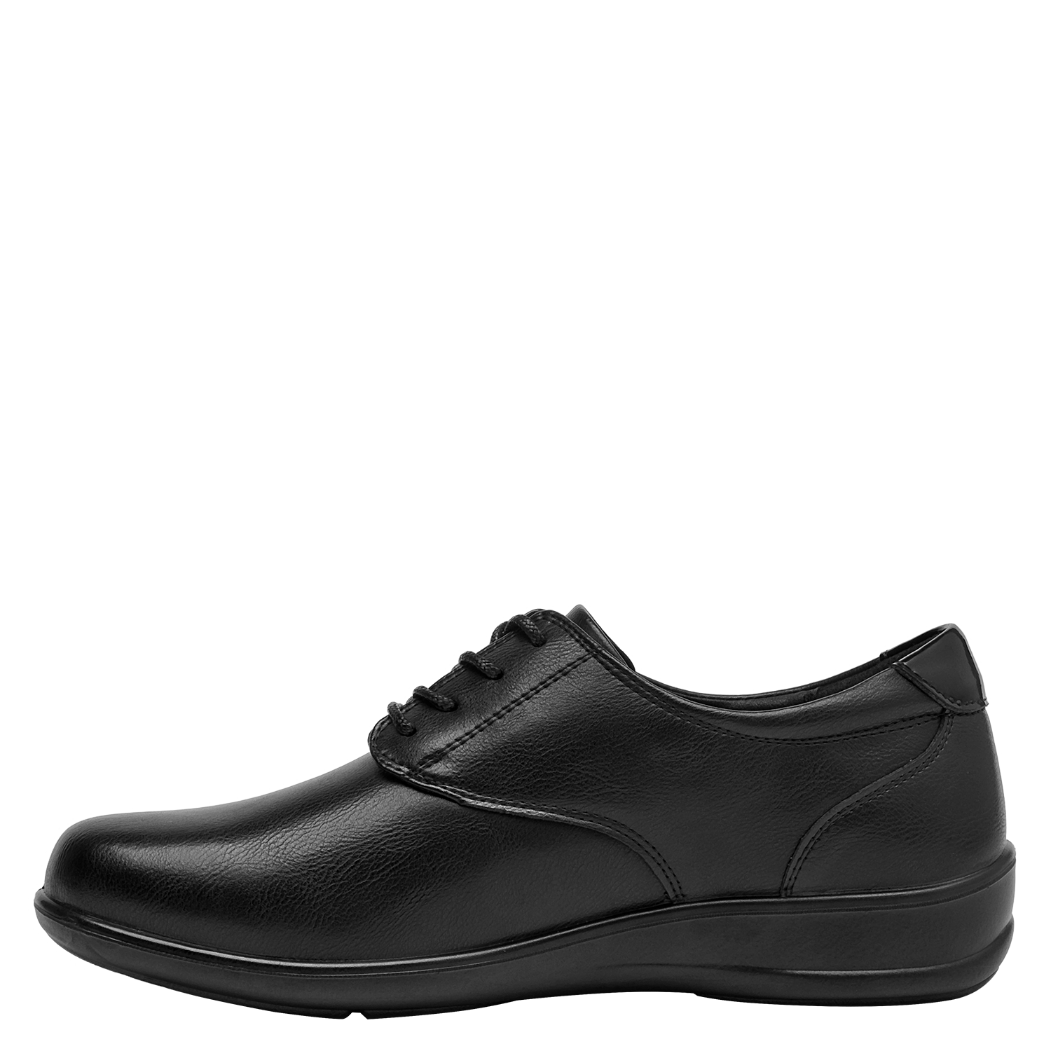 Zapato plano de cuero para mujer en color negro, de punta redonda y taco de 3 cm que aporta una leve elevación. Presenta capellada lisa y diseño minimalista, con forro mixto sintético/textil que entrega una sensación suave. La suela plana favorece la estabilidad en el día a día, mientras su silueta atemporal se adapta a múltiples estilos sin recargar el look.