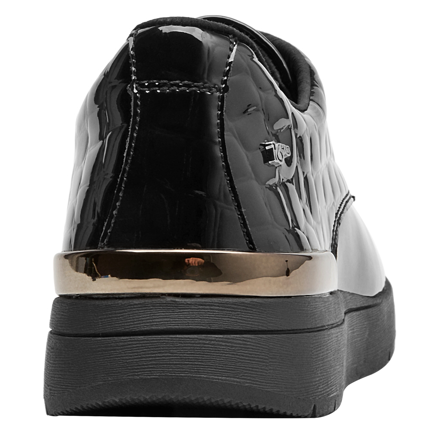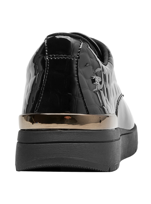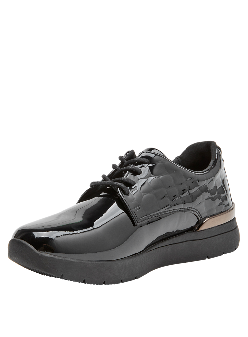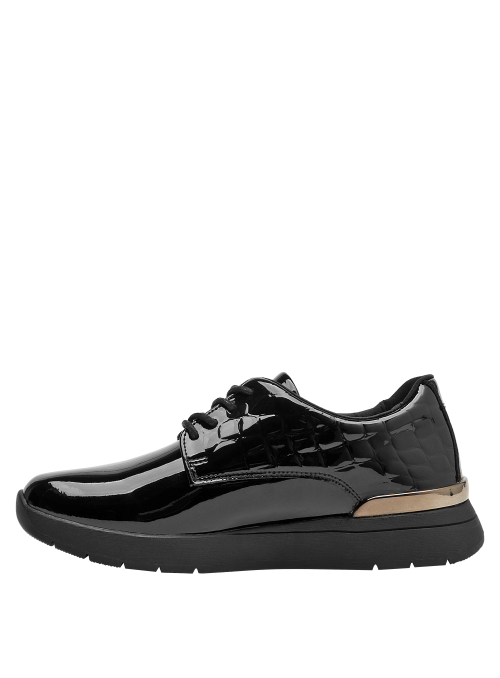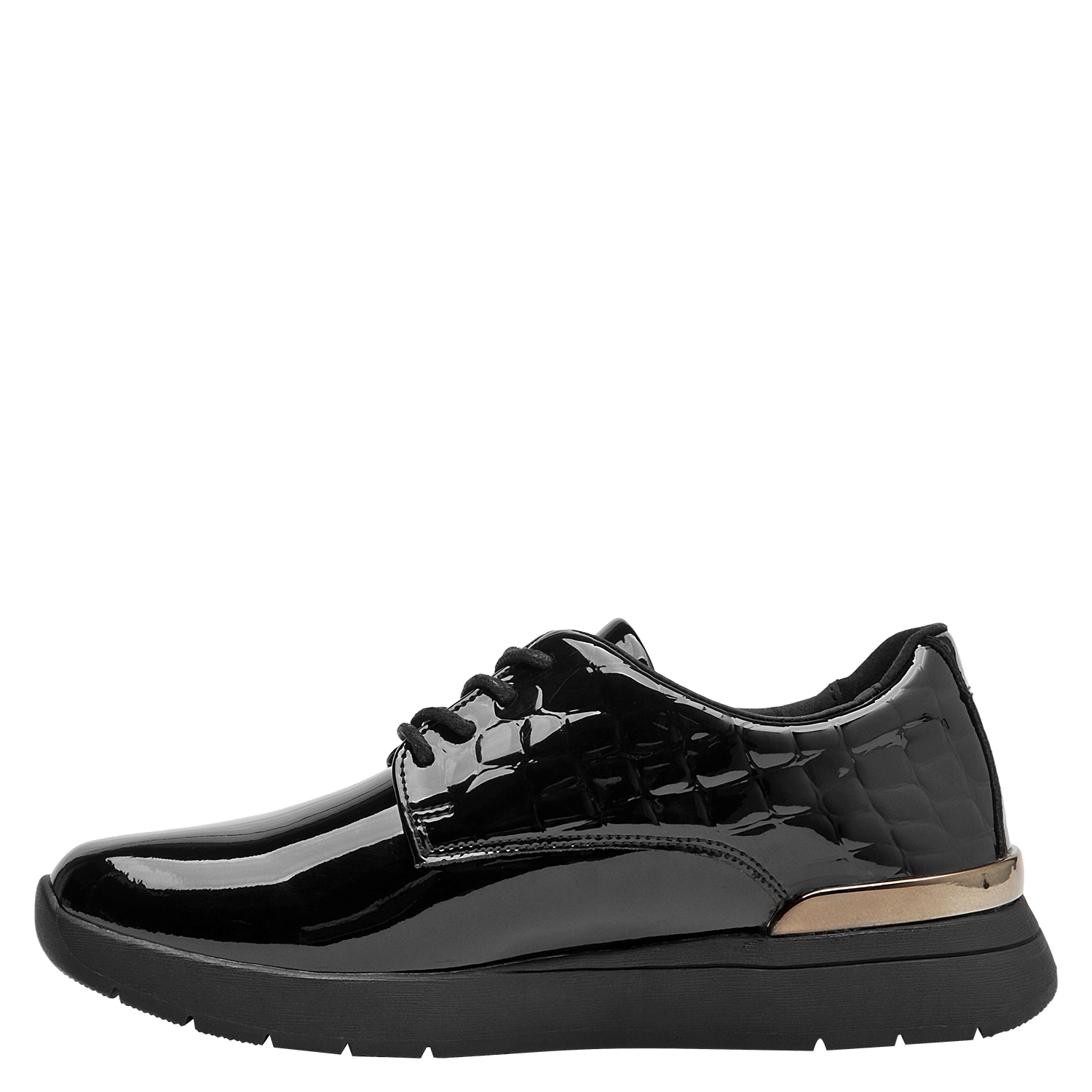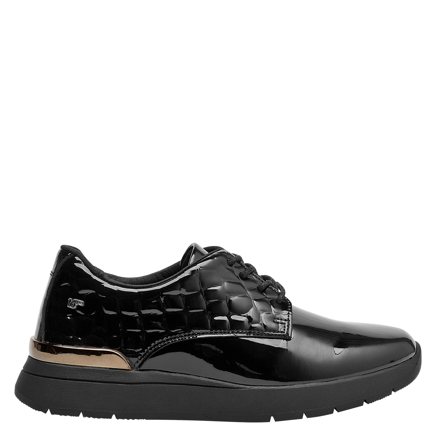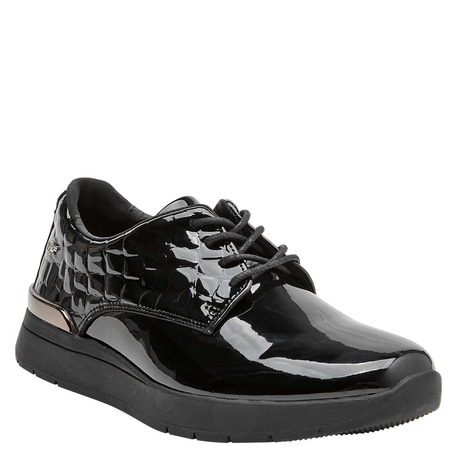 Zapato plano casual de cuero para mujer en color negro, con punta redonda y un taco de 2,5 cm que aporta una leve elevación. Presenta un diseño de líneas limpias y acabado liso, con suela resistente de perfil bajo y construcción cómoda. El forro On Steam acompaña el interior para una sensación agradable, mientras la horma redondeada favorece un calce natural y versátil para el uso cotidiano.