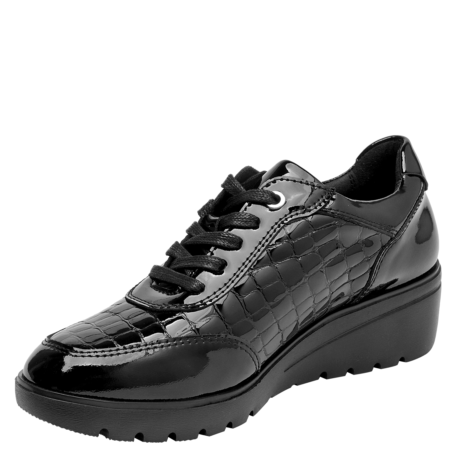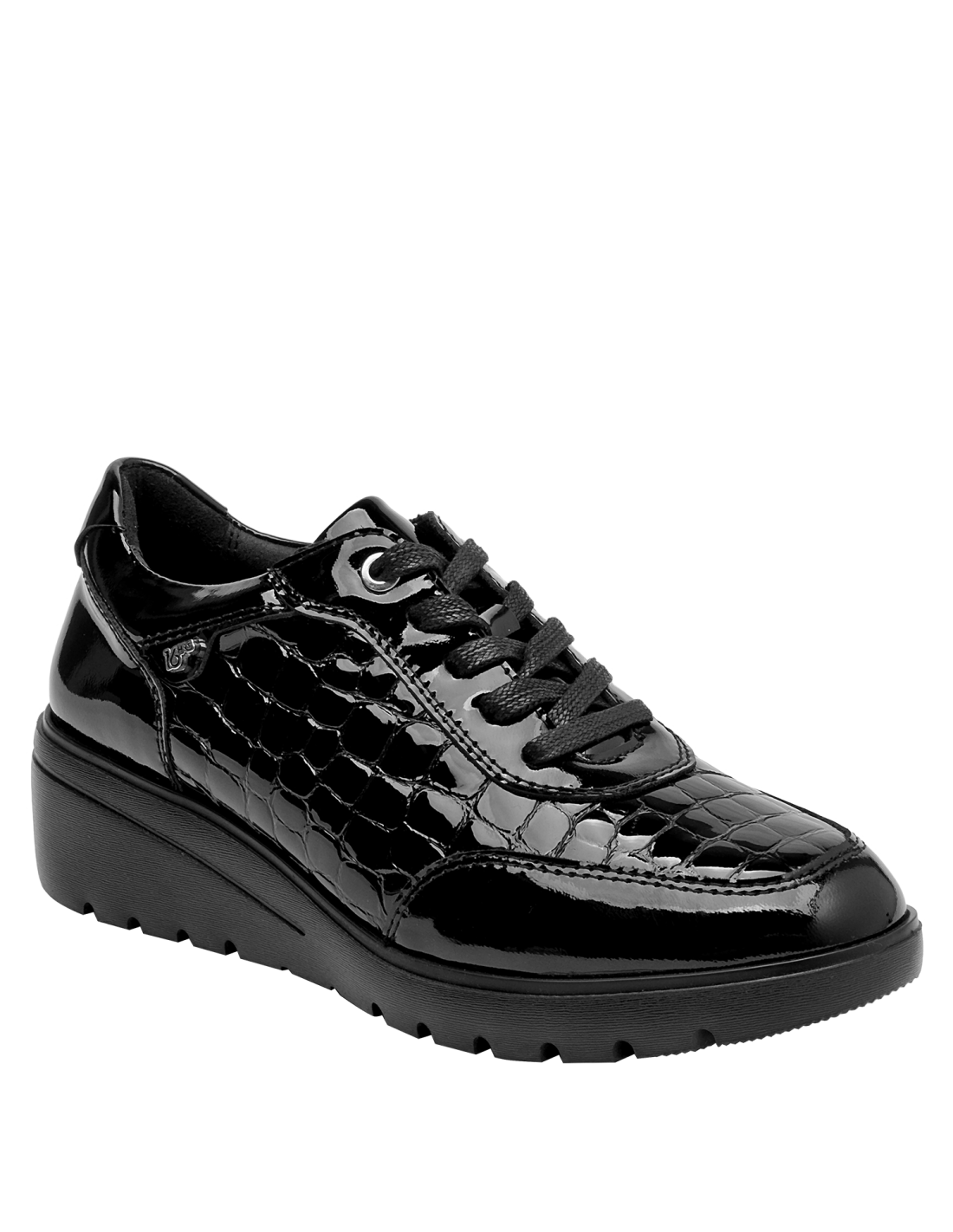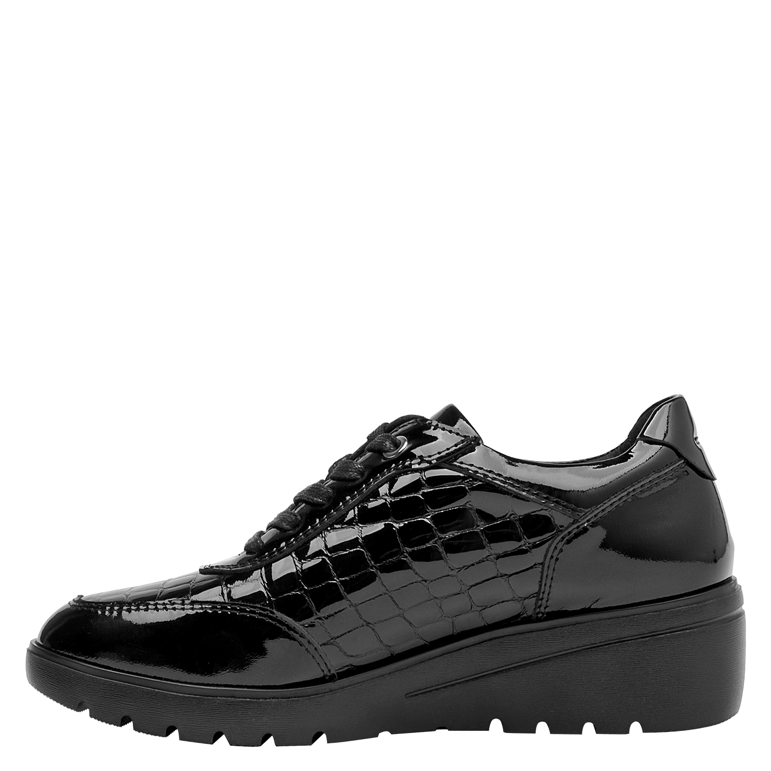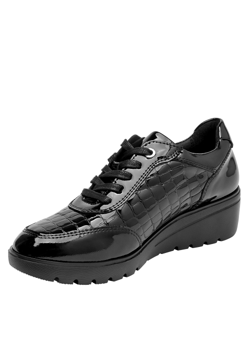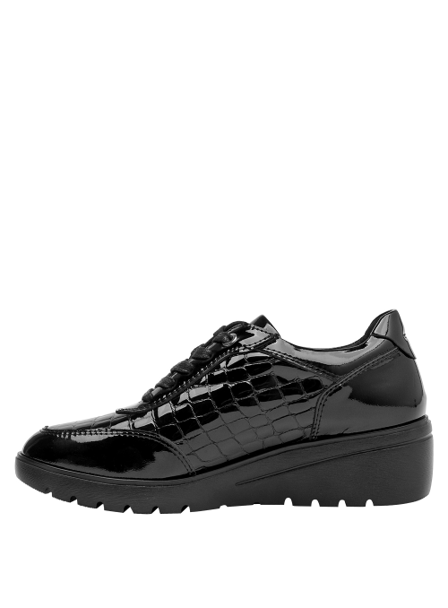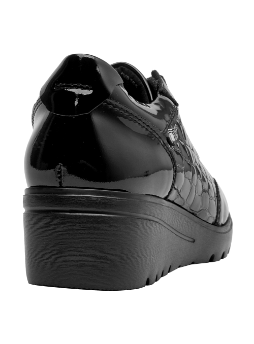 Zapato de cuña de cuero para mujer en color negro, con punta redonda y taco de 5 cm. La capellada de cuero aporta un acabado sobrio y versátil, mientras el forro técnico se siente suave al contacto. La construcción limpia y los cortes simples definen una silueta atemporal pensada para el uso diario, conservando un toque elegante que funciona del día a la noche.