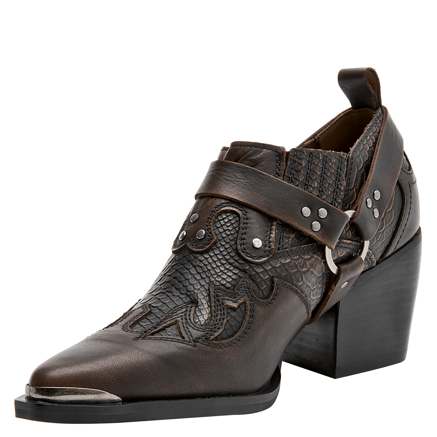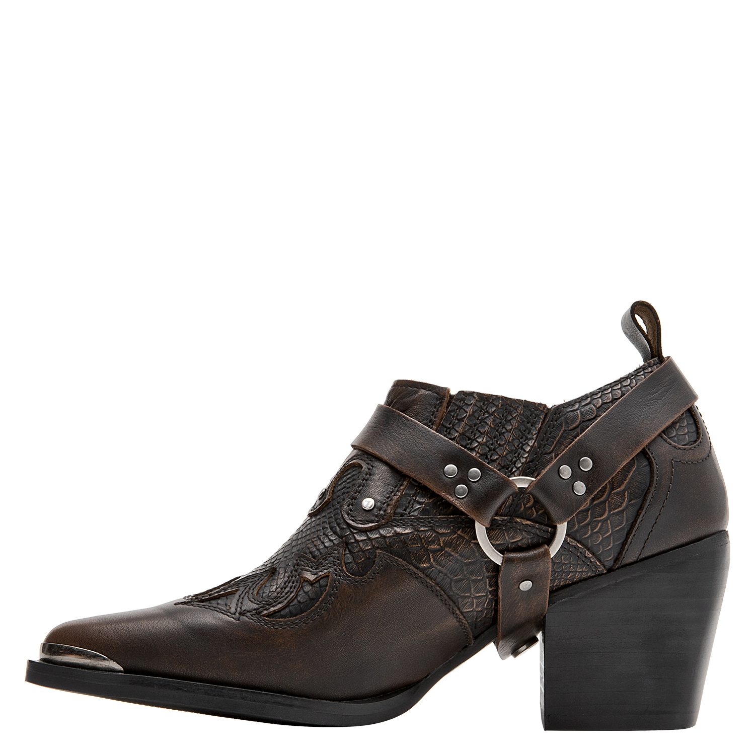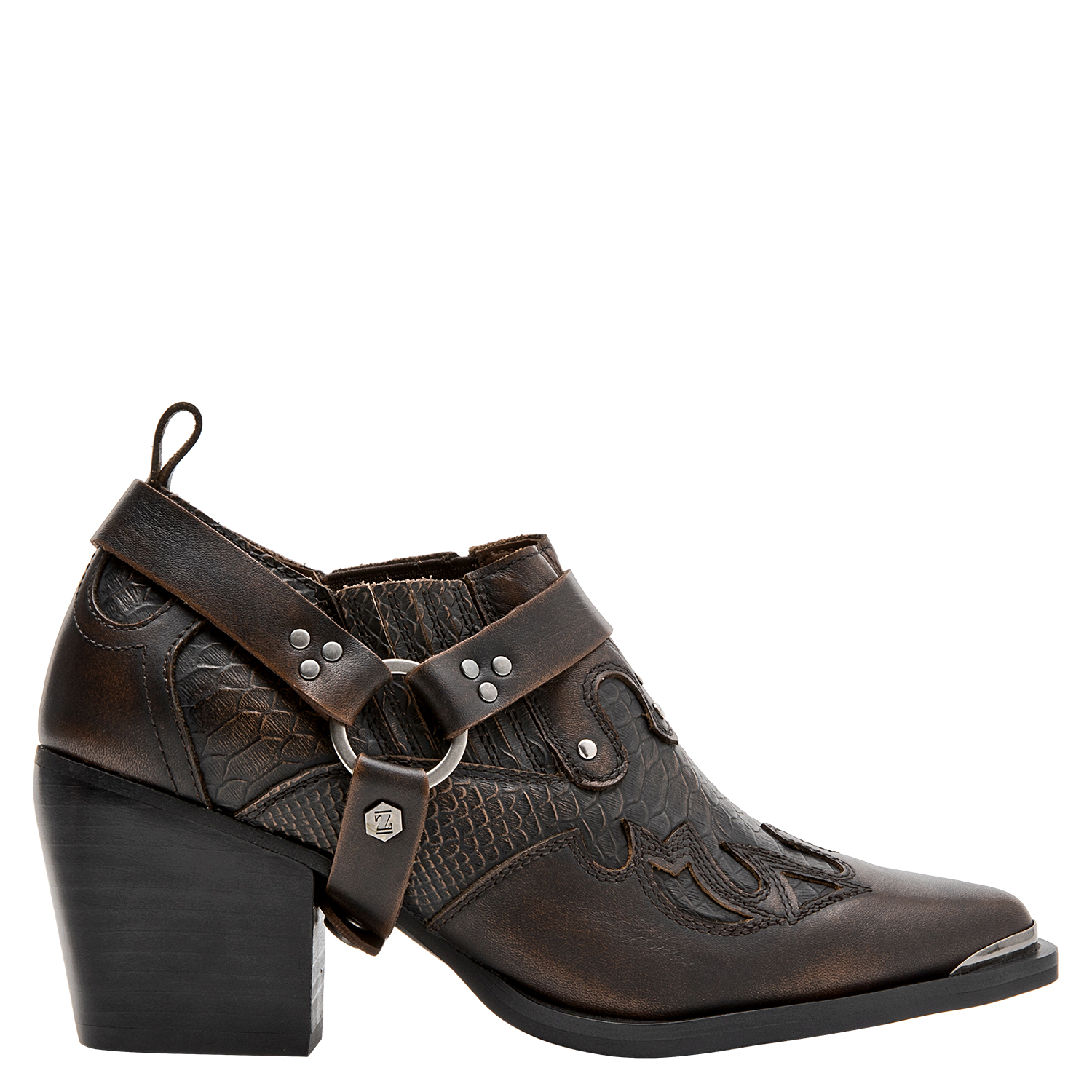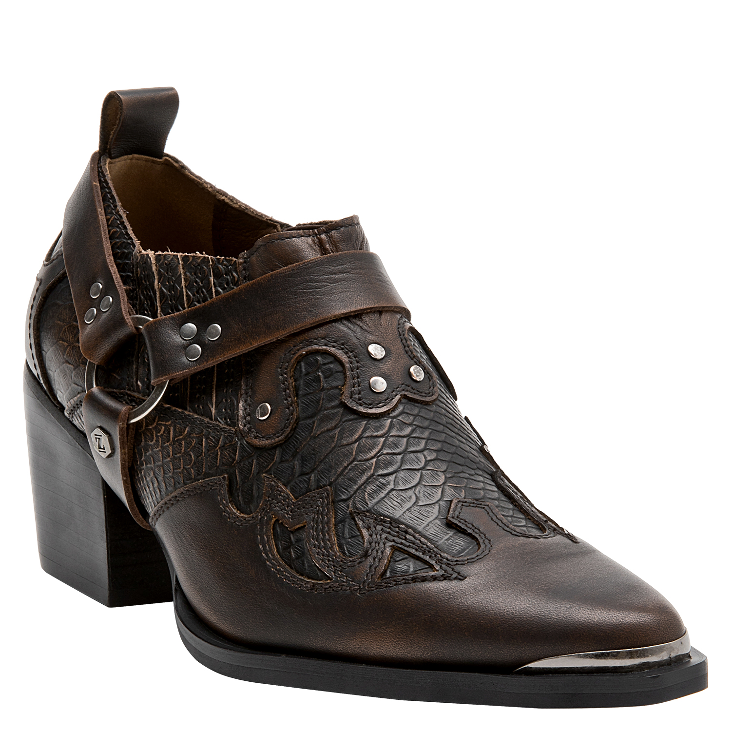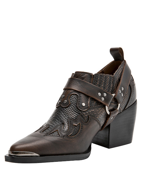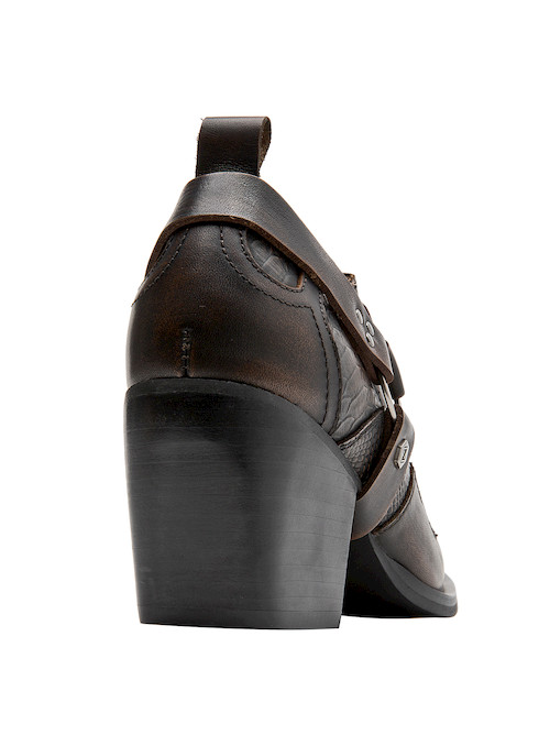 Descubre el audaz botín MORO para mujer: un diseño protagónico en cuero con punta puntiaguda que destaca por su acabado brillante y trenzado. Perfecto para quienes buscan marcar tendencia, este modelo incorpora detalles metálicos que añaden un toque vanguardista y urbano. Con un taco bloque de 6.5 cm, combina confort y estilo sin esfuerzo. Perfecto para lucir con un vestido midi o unos jeans ajustados, este botín garantiza un look deslumbrante y lleno de carácter.